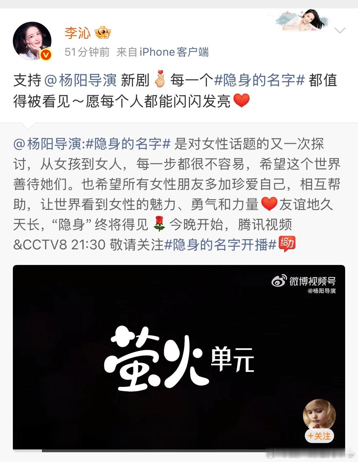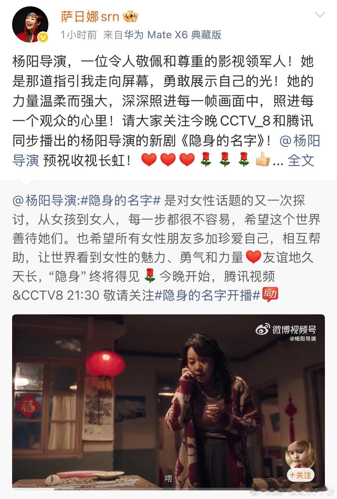 半个娱乐圈女艺人安利隐身的名字 众多女艺人从前辈到新生代都主动安利《隐身的名字》🤝,这种戏外的互相托举特别有意义,是女性创作者之间的默契支持隐身的名字