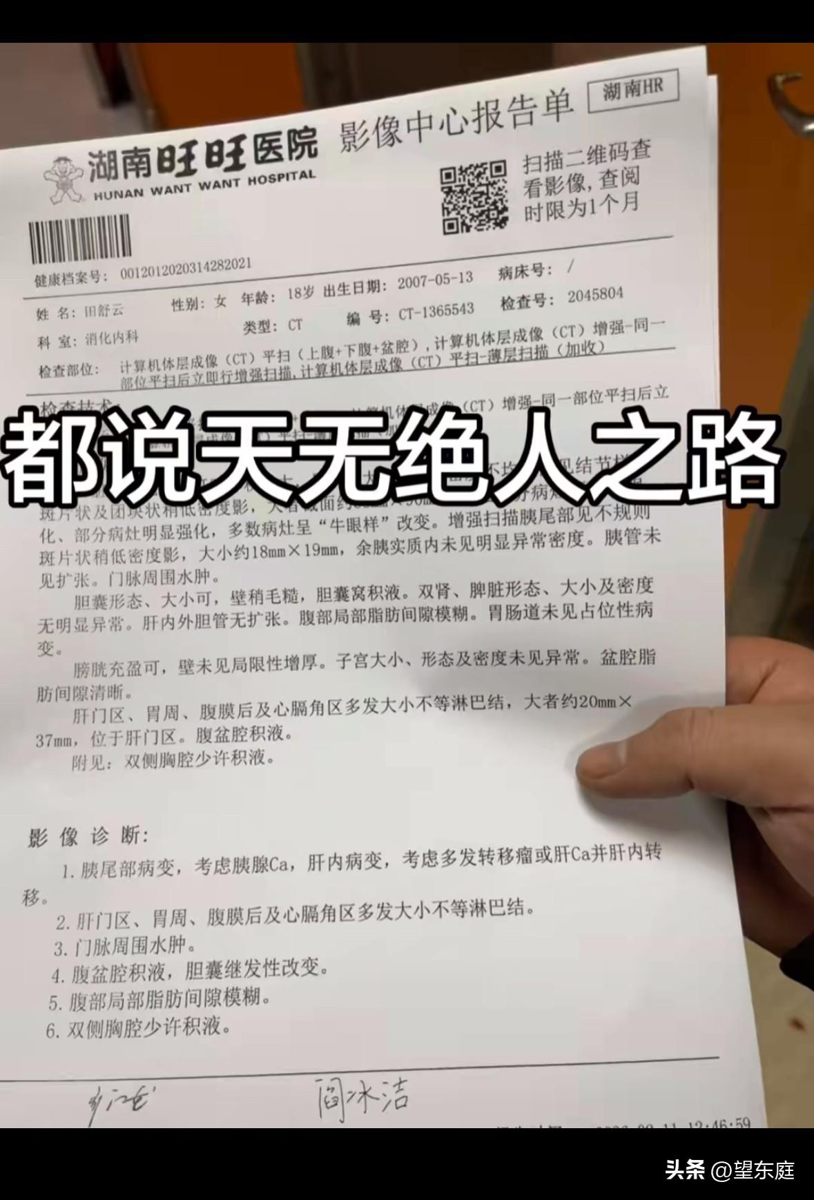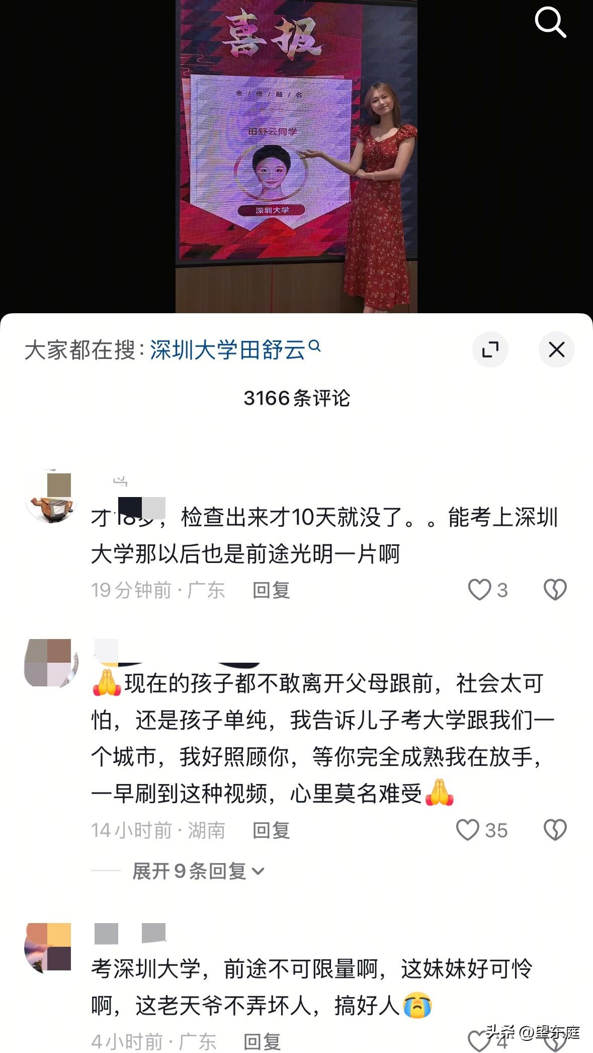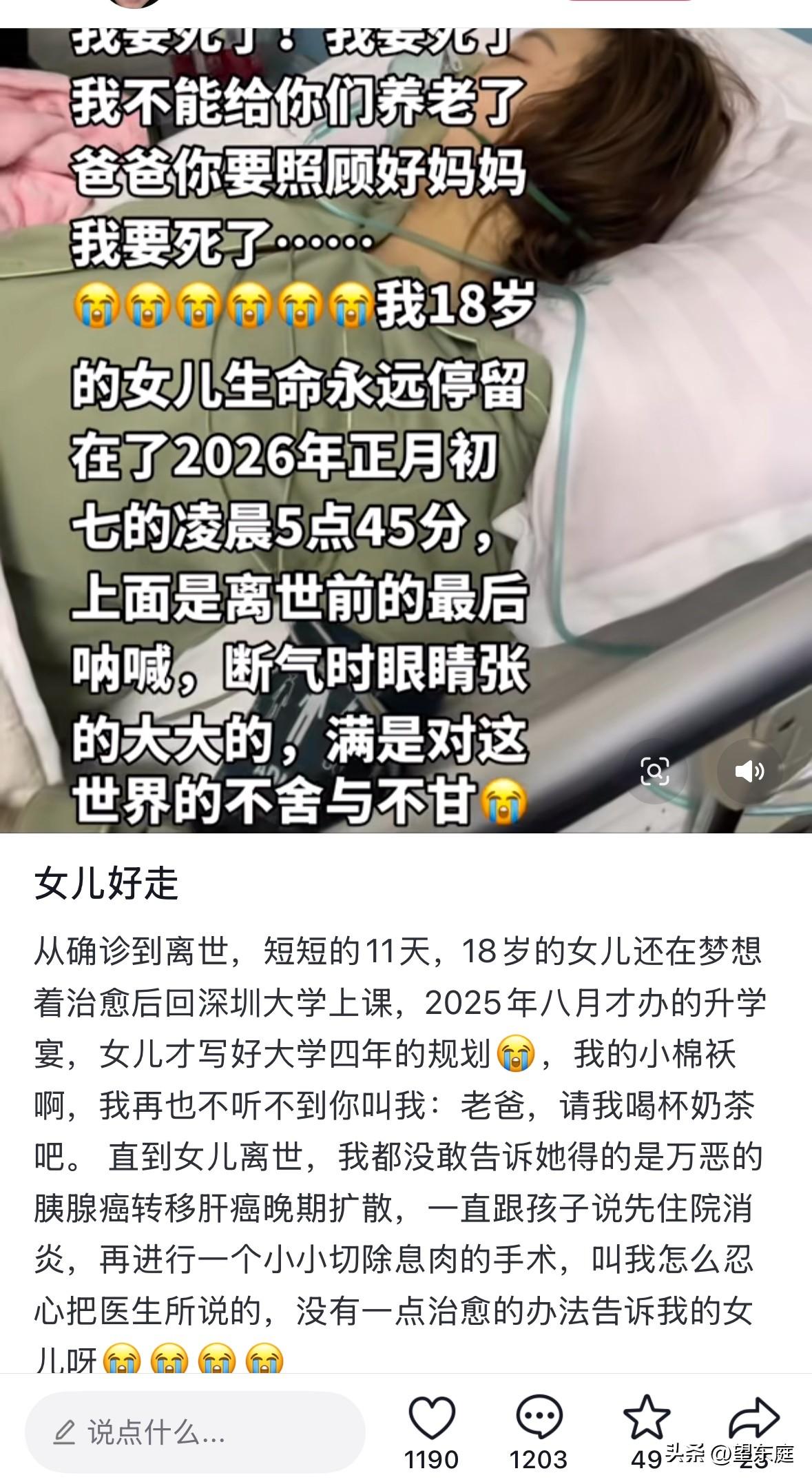 这个年仅18岁的女孩真的太让人心疼了!她查出胰腺癌才11天,生命就走到了尽头。更让人难以接受的是:她非常优秀,不仅长相漂亮,还是深圳大学的高材生。 她的名字叫小云,出生于2007年。 小云自小就非常优秀,从来不要家长操心。高考后,她以优异的成绩被深圳大学录取。可没想到,第一个学期刚刚结束悲剧就发生了。 在这个年前,小云因身体不适去了医院检查。 本以为只是一点小病痛,找医生开点药吃也就好了。可不曾想,报告单上的结果却如同晴天霹雳! 年仅18岁的小云,居然已经是胰腺癌晚期并且多发转移了。家里人得知这样的结果,压根就不能接受,但他们不得不坚强起来,带着小云积极治疗。 可万万想不到,小云的病情进展的实在是太快了,从确诊到离开只有区区11天!大年初七一早,年仅18岁的小云永远的离开了。 她那么年轻,那么漂亮,结果才刚刚成年生命便不在了。这样的结局,实在是太让人心疼了。 悲剧发生后,小云的父亲悲痛欲绝在社交平台上发布了一些和女儿相关的内容。 这个女孩懂事的让人心疼,她学习努力、勤俭节约,整整一个学期的时间,她就只花了家里800元钱。就连爷爷奶奶给她的红包,都还原封不动的放在那里…… 这么好的孩子说没就没了,陌生人都难以接受,很难想象小云的父母该有多么痛心!在此,只愿他们节哀,好好照顾自己的身体。[祈祷][祈祷][祈祷][祈祷][流泪]