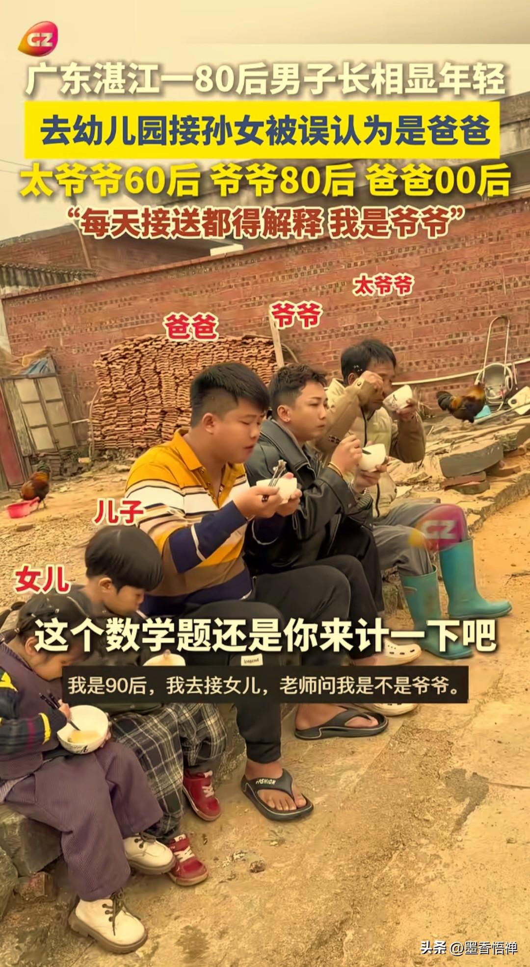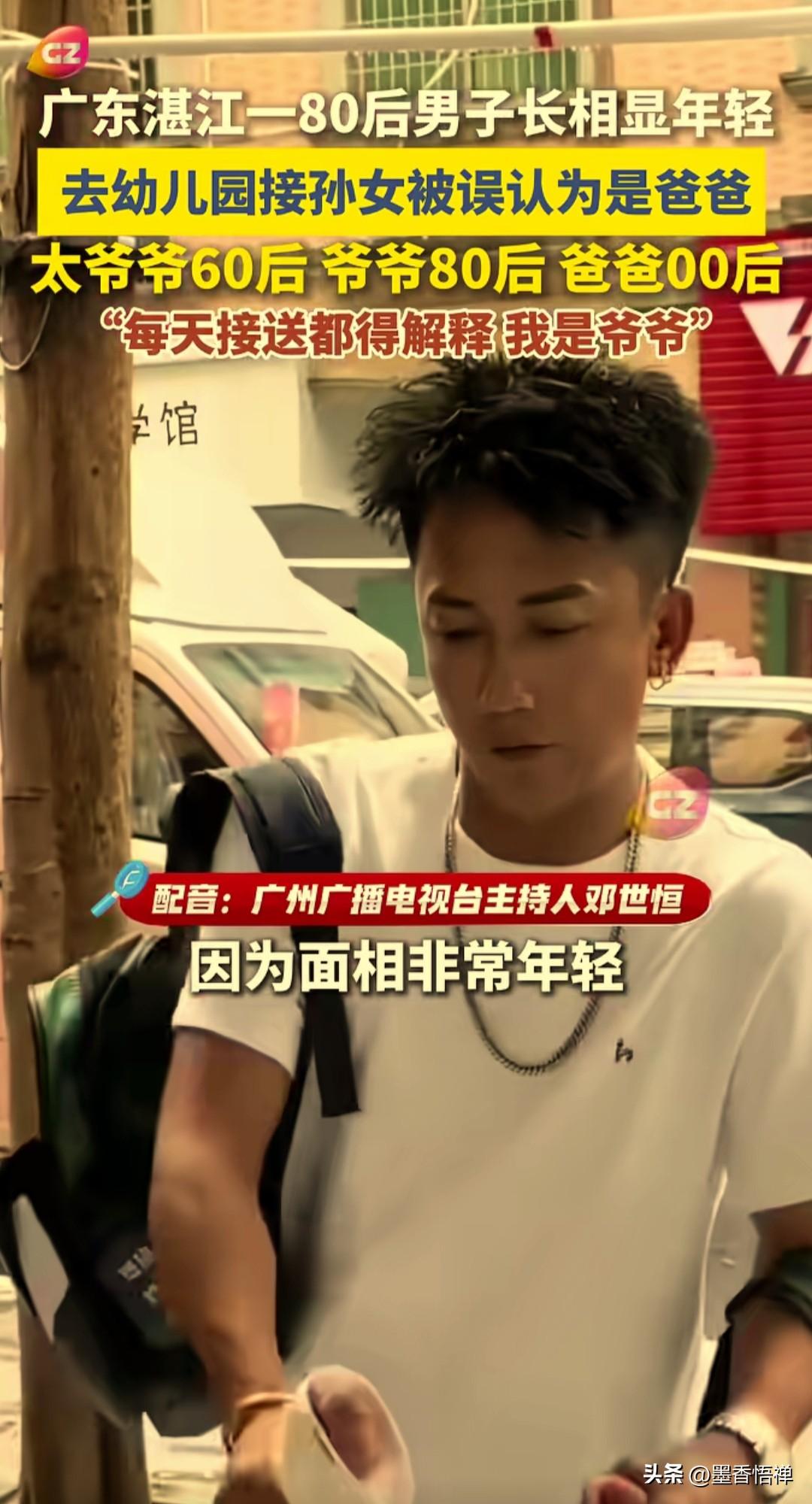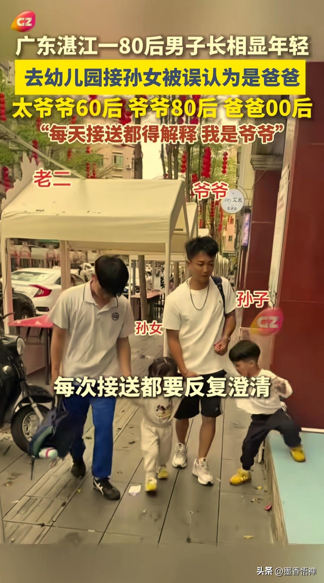 80后爷爷去幼儿园接孙女,老师误认是孩子爸爸,每天接送都得解释:我是爷爷! 广东湛江这位80年出生的大哥,长得实在是太显年轻了!最尴尬的是去幼儿园接孙女放学,因为穿着打扮新潮、发型又时尚,结果幼儿园老师让孩子喊爸爸,他连忙解释道:“我是爷爷!”两名老师也忍俊不禁,捂着嘴直笑。 大哥当场哭笑不得,每天都得解释八百遍:“我是爷爷,真的是爷爷!” 更魔幻的是,他家四代同堂:太爷爷是60后,他是80后,儿子是00后,连孙子孙女都有了!网友看完直呼:这数学题谁算得明白? 网友说: “我86年,儿子才刚出生,拖后腿了” “我是90后,我去接女儿,老师问我是不是爷爷。” 带孙子老人 爷爷抱老孙子 接娃老爷爷