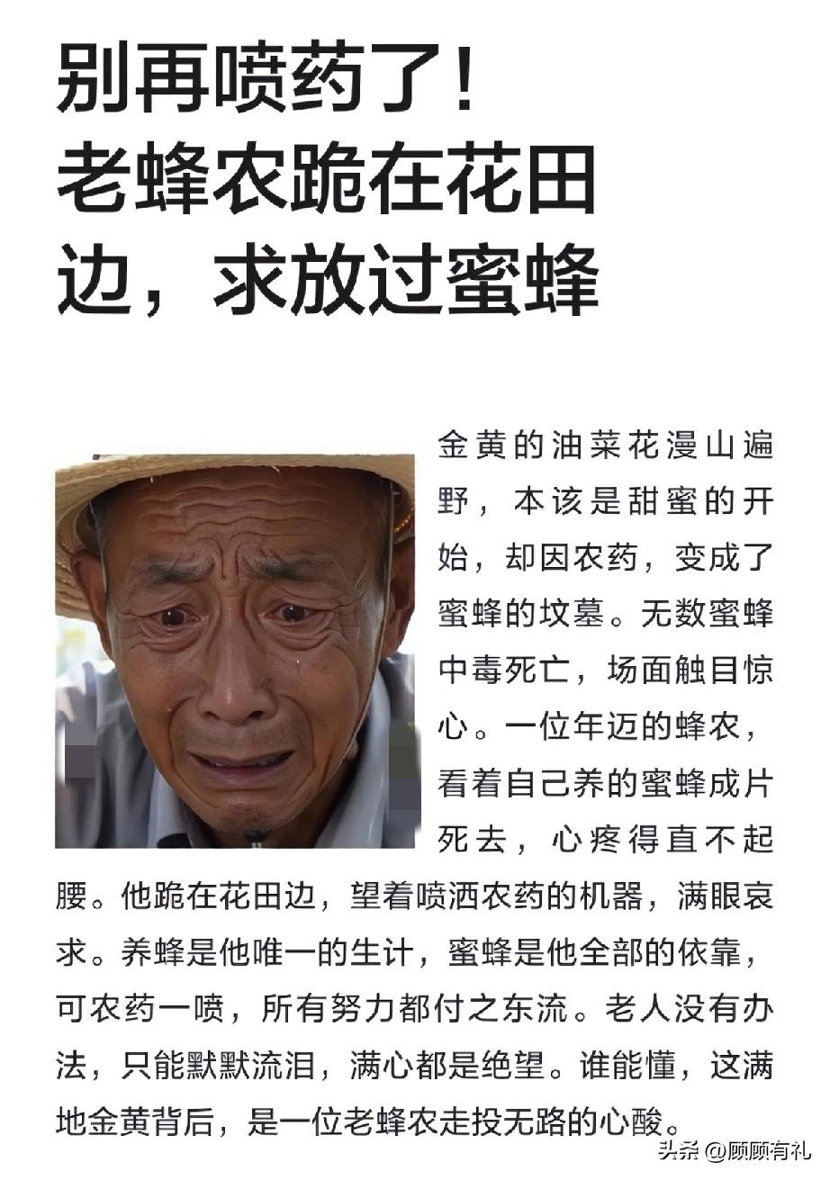 最近一条消息刷屏了‼️ 油菜花田用无人机打农药 导致大量蜜蜂死亡💀 养蜂人直接哭了 官方对乱喷农药的行为开始严打了,特别是在油菜花期乱喷农药的行为。 这段时间有很多养蜂的朋友看到自己蜜蜂死了一堆而心痛不已。乱喷农药,尤其是滥用一些剧毒农药,不仅仅是毁了养蜂人的蜜源,杀死蜜蜂,更是毁了农作物上的天然 pollinator(授粉媒介),从而影响到农田的产量,威胁粮食安全。 这次严打乱喷农药乱用农药的行动,很明确的表态:使用禁限农药,喷杀蜜蜂,毁坏养蜂人财物的行为,今后肯定是严厉打击的,不仅要罚款,还要赔偿。 情节严重的,可能会追究刑事责任!