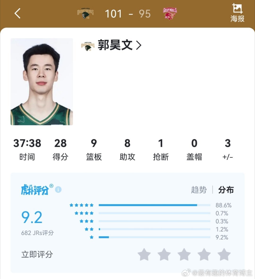 CBA第27轮,广东111-89新疆,给广东队球员点评和评分:1.胡明轩