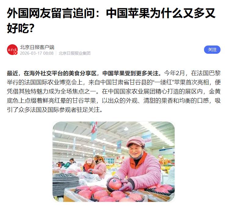 外国连吃苹果都成了奢侈?据媒体3月17日报道:最近,海外社交平台上,中国苹果火了,不少外国网友留言问:中国苹果咋又多又好吃? 今年2月,法国巴黎如期举办国际农业博览会,这场展会深耕农业领域多年,早已成为全球公认的顶级农业交流平台,吸引了全球1100余家参展商齐聚一堂,各国都带着自家特色农产品亮相,比拼农业发展实力。 这次展会还有一个特殊的意义,那就是中国农业展团首次正式参与其中,带着精心挑选的优质果品参展,没有花哨的宣传,全靠产品本身说话,向全球同行展现中国现代农业的真实水平和发展底气。 在琳琅满目的参展农产品里,甘肃甘谷出产的“一缕红”苹果一亮相就脱颖而出,这是这款苹果首次登上国际专业农业展会的舞台,却凭借饱满的果形、鲜亮的色泽和浓郁的果香,瞬间成为全场关注的焦点。 现场的国际客商、当地市民以及农业领域的专业人士,都忍不住围拢过来,细细观察苹果的品相,主动询问种植模式和产地优势,这款扎根黄土高原的特色苹果,没有依靠任何噱头,纯粹用口感和品质打动了现场所有人,也让海外民众打破了对国产苹果的固有印象,真切体会到中国苹果的独特优势。 海外网友的疑惑其实一点都不难解开,中国苹果能实现产量充足、口感上乘,靠的不是一时的运气,而是整个产业链多年深耕、层层打磨的成果。 先从最基础的种植环节来说,我国地域辽阔,不同区域的气候、土壤条件差异大,刚好能匹配苹果生长的各类需求,经过多年的因地制宜规划,黄土高原、环渤海湾、西南冷凉高地、新疆特色产区等,都成了公认的苹果优势种植区。 这些区域光照时间长、昼夜温差合理,土壤里的矿物质含量丰富,能让苹果树充分积累糖分,长出的苹果自然口感清甜,再加上科学的种植布局规划,既实现了规模化种植保障产量,又统一了种植标准,避免了品质良莠不齐的问题,从根源上就打下了“又多又好吃”的坚实基础。 光有得天独厚的自然条件远远不够,现代农业科技的加持,才是中国苹果实现提质增产的核心密码。早些年,苹果种植大多依赖自然气候,遇上灾年产量和品质都会大幅下滑,稳定性很差。 现如今,国内育种团队持续多年科研攻关,培育出一大批适配本土环境的优质苹果品种,不光抗病抗虫能力更强,口感和产量也实现了双重提升。 田间管理也彻底告别了粗放模式,精准灌溉、绿色病虫害防控、智能水肥管控等技术全面推广,果农种地不再靠经验盲目操作,每一颗苹果的生长周期都有科学把控。 这种从品种选育到田间管护的全链条升级,既让国内苹果产量稳步攀升,稳稳满足国内市场的消费需求,还能腾出大量优质产能销往海外,同时保证了每一颗苹果的口感统一、品质上乘,咬下去脆嫩多汁、果香醇厚,吃过的海外消费者自然都会给出好评。 成熟的流通储运体系,更是让中国苹果顺利走出国门、锁住新鲜的重要支撑。从果园采摘下来的新鲜苹果,会立刻进入标准化分拣流程,按照大小、品相分级包装,全程冷链物流覆盖采摘、仓储、运输全环节,最大程度锁住苹果的水分和新鲜度,即便漂洋过海抵达海外餐桌,口感和刚摘下来的时候相差无几。 再加上越来越顺畅的跨境物流通道,中国苹果能快速运抵全球多个国家和地区,打破地域限制,让国外消费者也能轻松买到价格实惠、品质过硬的好苹果。 反观部分海外地区,受本土种植条件有限、产业链配套不完善、物流成本居高不下等因素影响,苹果供应量少、售价偏高,普通民众想随时吃上优质苹果,反倒成了一件不容易的事,这样一对比,差距就显得格外明显。 巴黎农博会上的短暂亮相,只是中国苹果产业实力的一次微小展示,背后是整个苹果产业从传统农耕向现代农业的彻底蜕变,凝聚着无数育种专家、果农、产业从业者的心血和付出。 一颗小小的苹果,不仅填满了国人的日常果盘,更成为一张甜蜜的农业名片,搭建起中国与世界农业交流的桥梁,让海外看到的不只是好吃的苹果,更是中国现代农业的硬核实力。 其实不止苹果,近些年越来越多的国产特色农产品走出国门,从果蔬到粮油,从干货到生鲜,都凭借过硬品质赢得全球消费者的认可,这背后是中国农业全产业链的升级,更是农业发展理念的进步,这份实打实的成长,值得我们每一个人骄傲。 从海外热议到国际展会出圈,一颗苹果的走红看似偶然,实则是必然。看完中国苹果火爆海外的全过程,你是不是对国产农产品有了全新的认识?平日里你还吃过哪些品质不输进口、让人眼前一亮的国产水果,不妨在评论区分享一下你的心头好呀。
