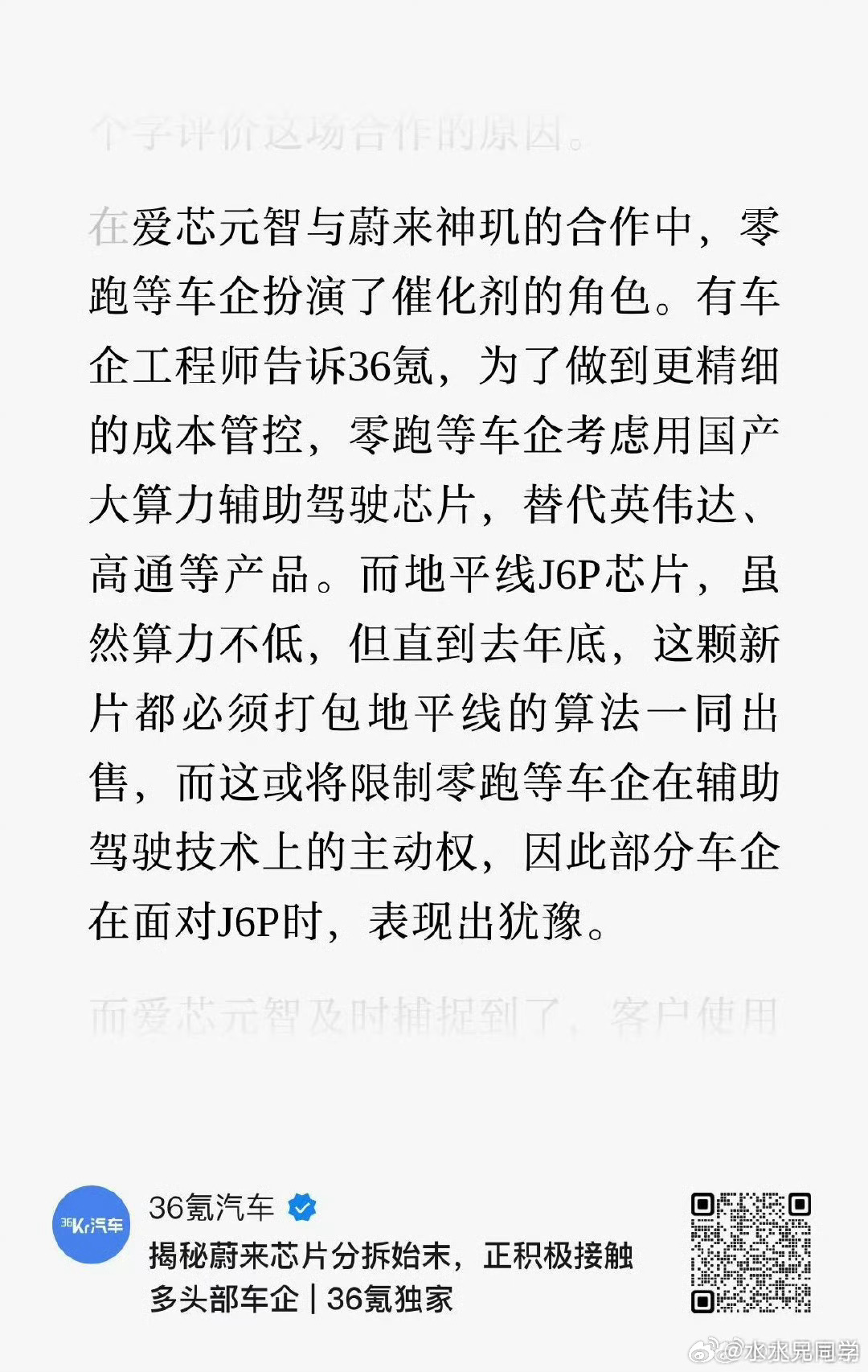 在我看来零跑很适合,它没有包袱。他也没有太强的品牌光环一定要用什么芯片,只要配置够高,效果达到,供应链降本就行。