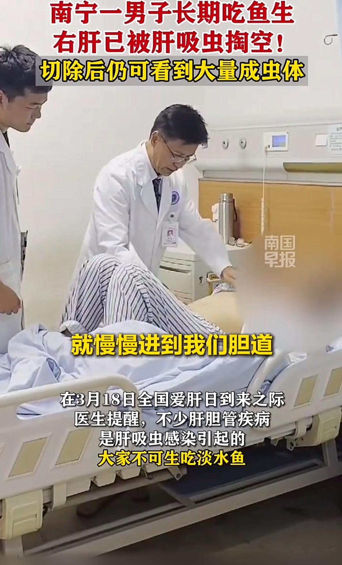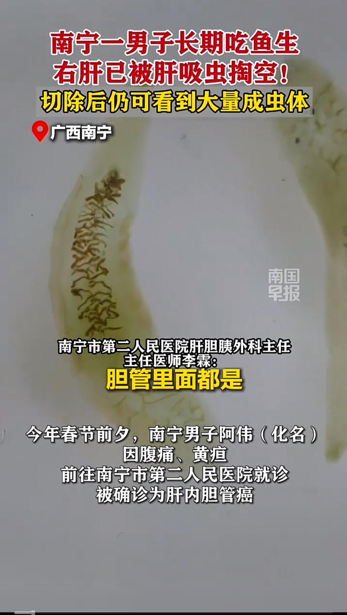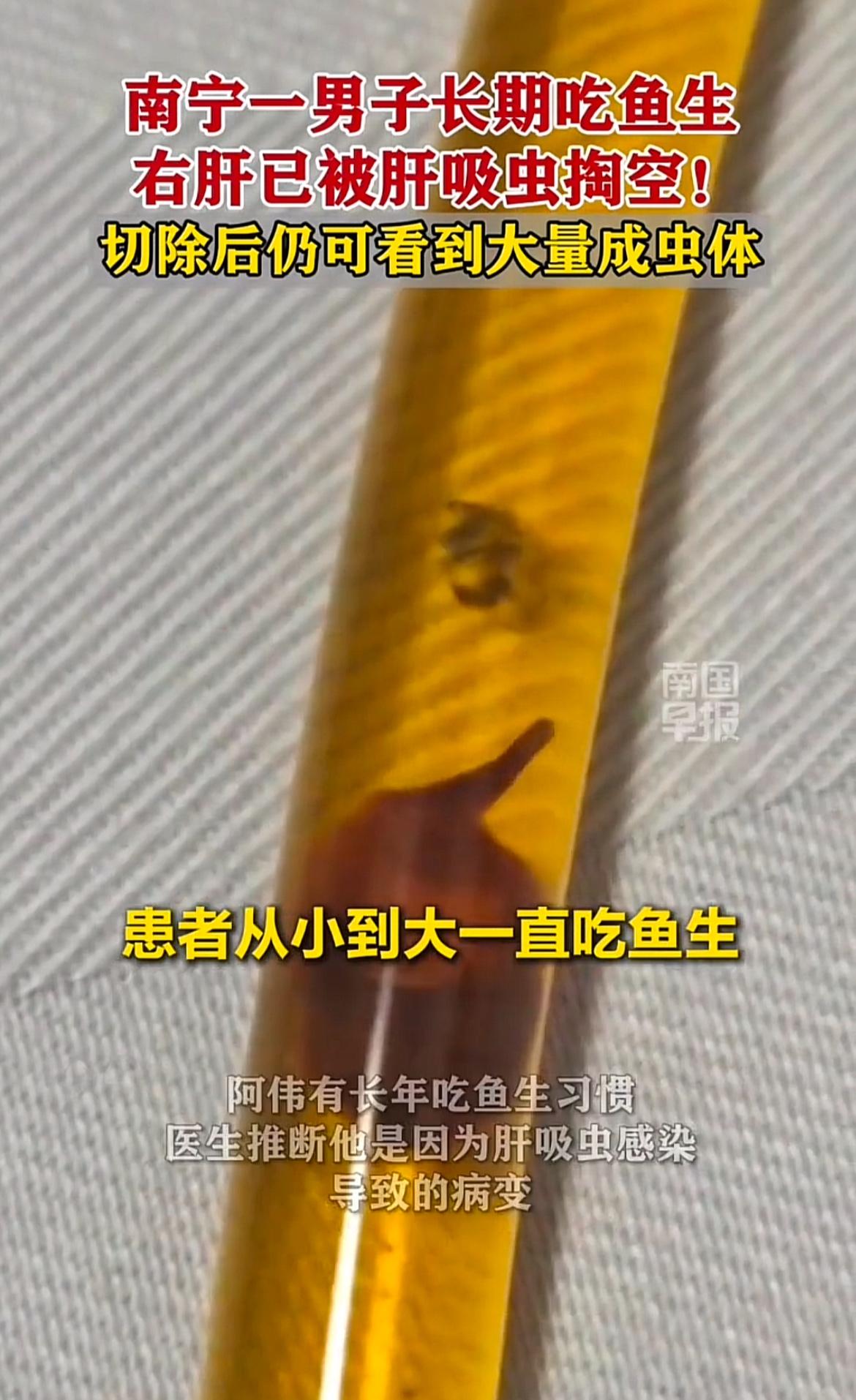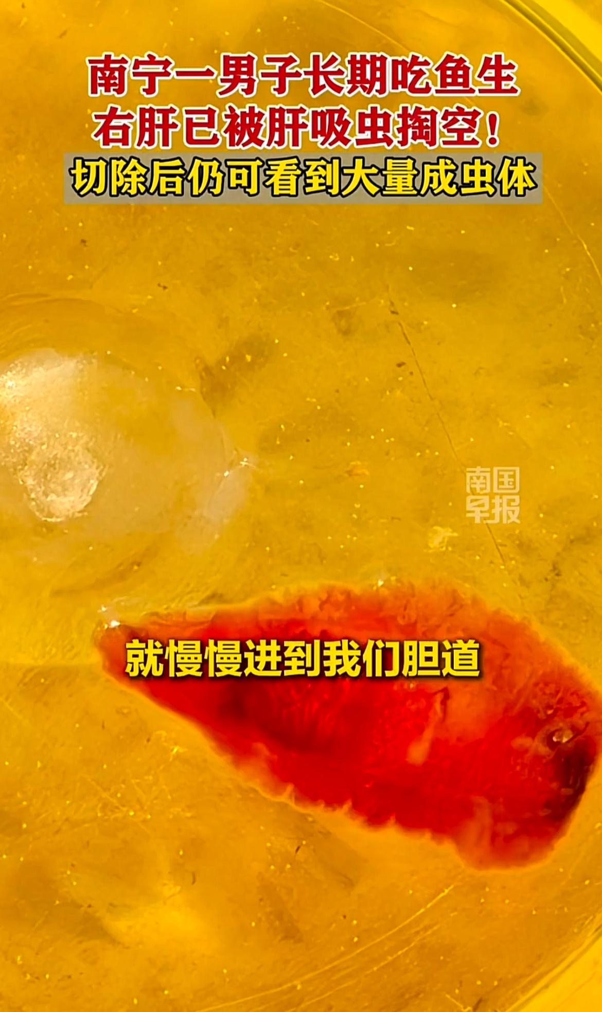 南宁有个男子长期吃鱼生,右肝直接被肝吸虫掏空,切除后还能看到大量成虫体,想想都可怕! 其实类似的事儿不少,广东一男子也因常吃鱼生感染肝吸虫,腹痛、发热不断。还有一家三口吃生鱼片,全患上肝吸虫病。肝吸虫能在人体内存活20 - 30年,感染后症状从轻到重,严重的会肝硬化、腹水,甚至引发肝胆管癌。 医生提醒,预防这病关键是管住嘴,别生吃或半生吃淡水鱼虾,刀和砧板生熟分开,处理生鲜后洗手。爱吃鱼生的可得悠着点,别让嘴巴过瘾却害了身体!