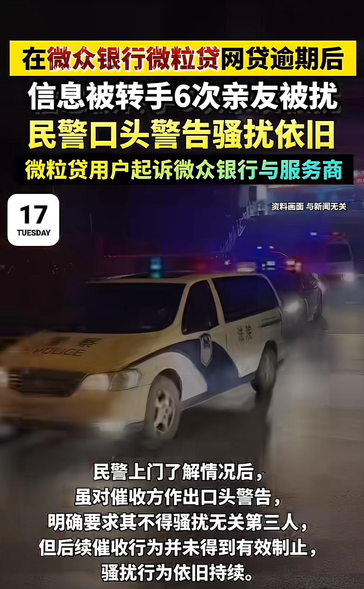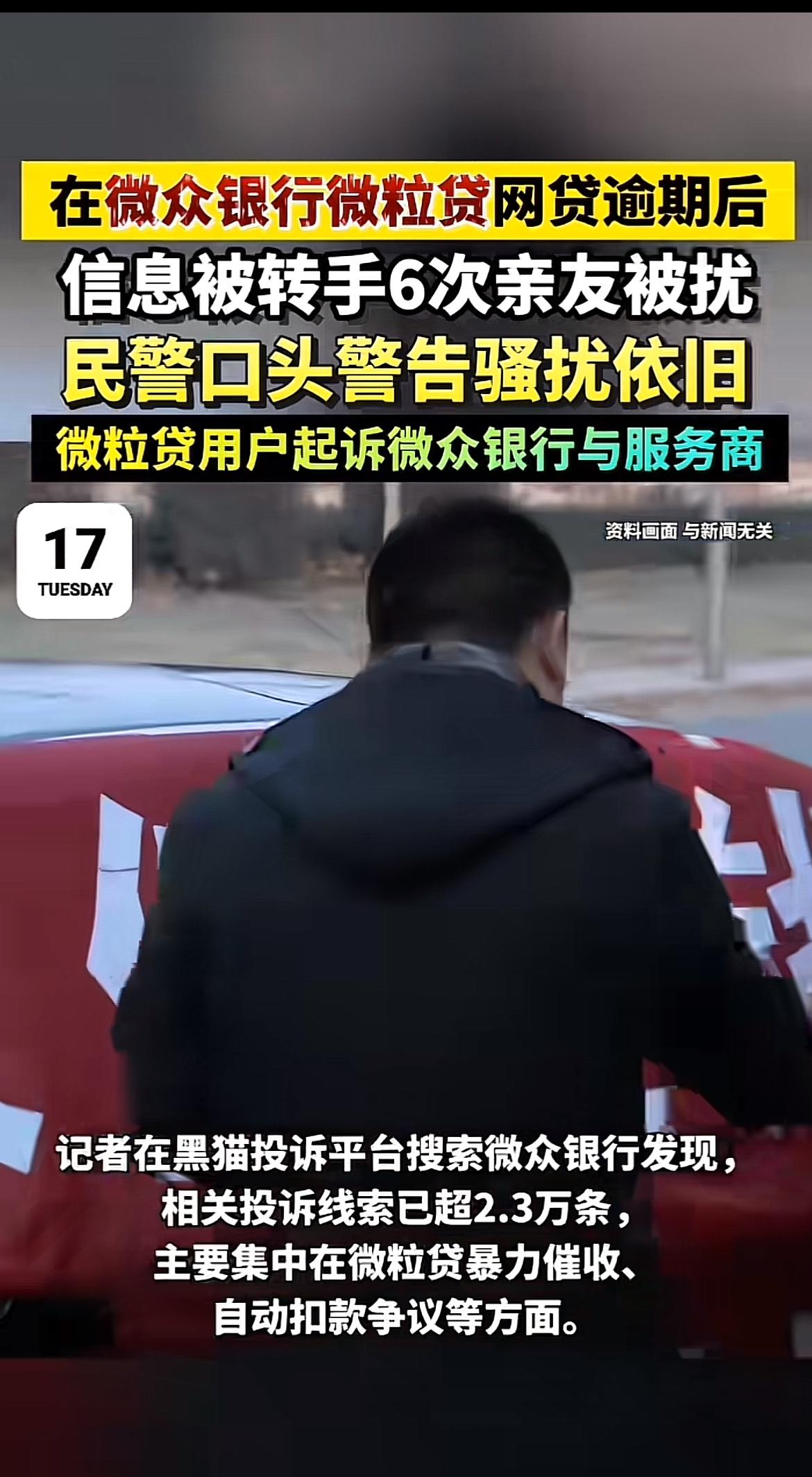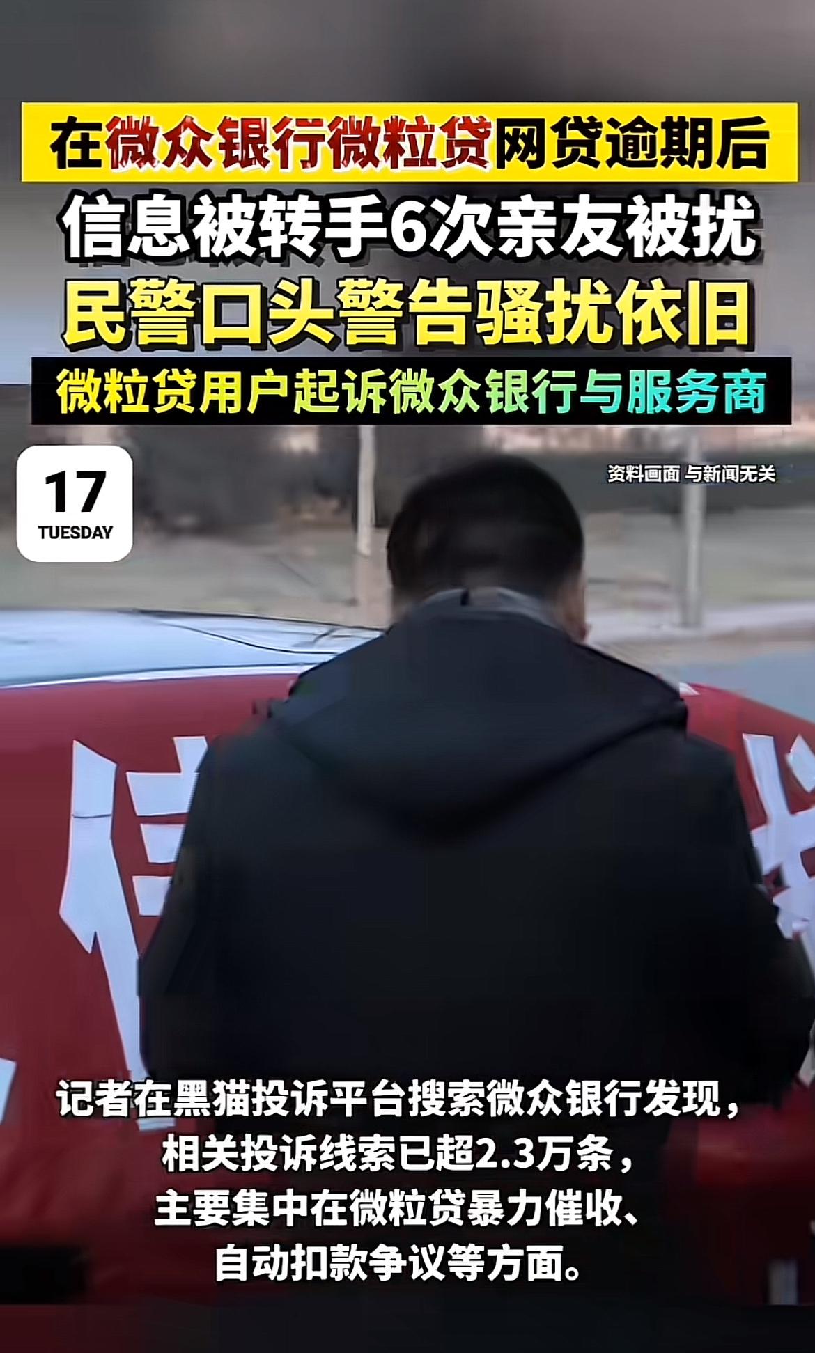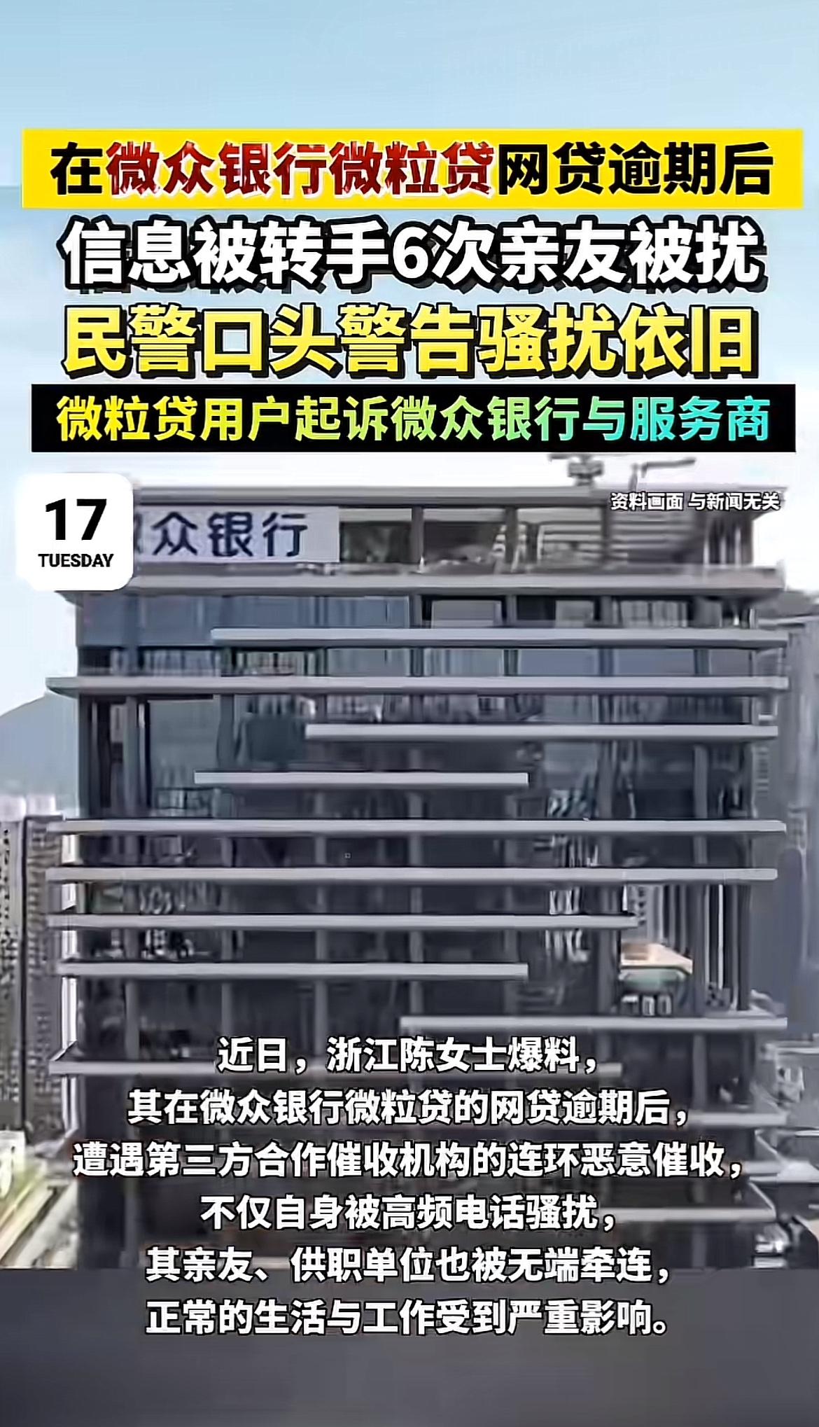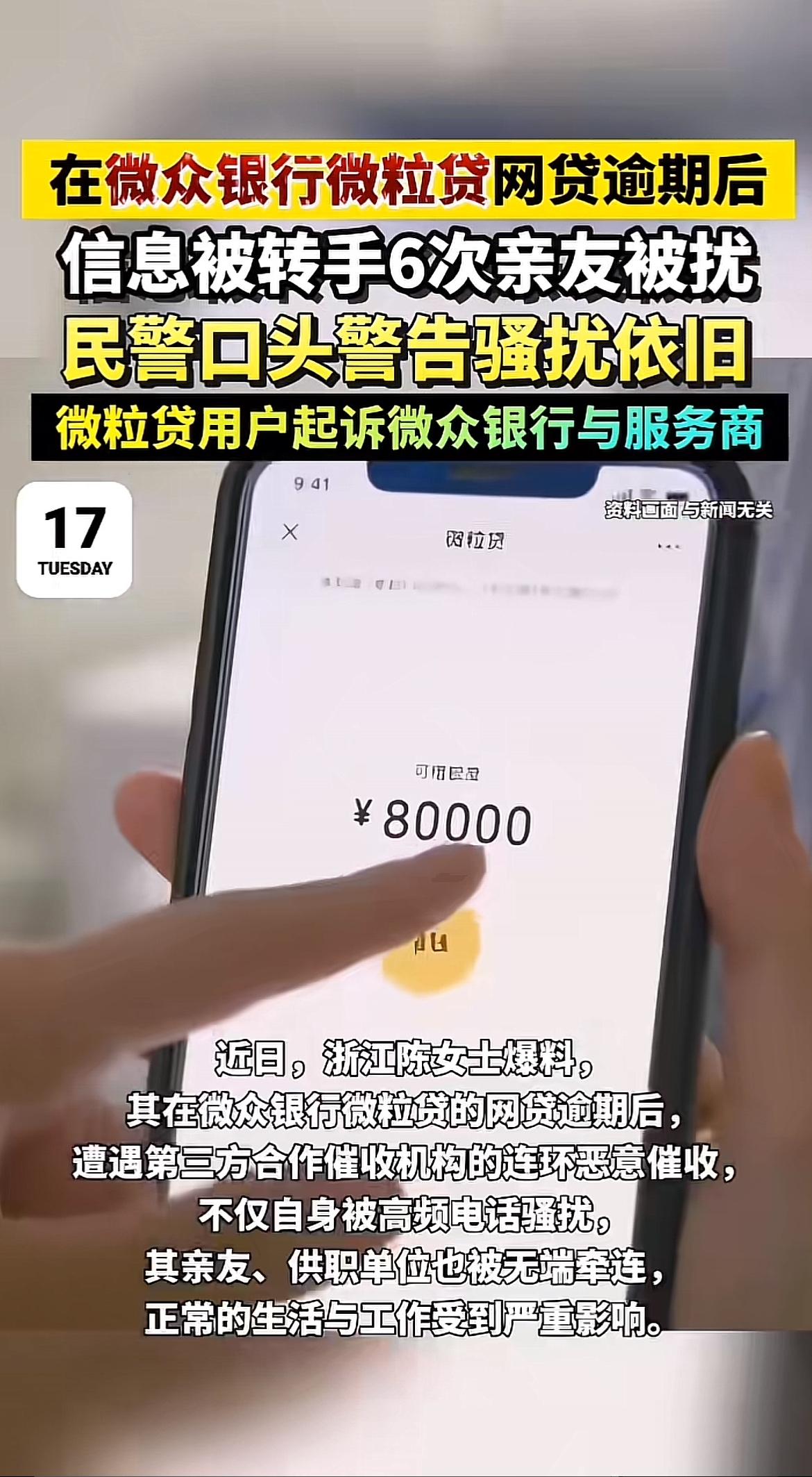 微众银行微粒贷这次摊上事儿了。浙江陈女士在微粒贷贷了6.5万元,因家庭经济困难逾期,从此陷入噩梦。催收方高频骚扰她,每天十几通电话,她主动协商还款还被无视。更过分的是,催收范围扩大到她亲友和单位,她没提供过的联系方式都被拿到了,导致她工作受影响、精神崩溃。 她报警,民警警告都没用。原来她的逾期信息被转手6次。陈女士一怒之下将微众银行及6家短信服务商告上法庭。黑猫投诉平台上,微众银行相关投诉超2.3万条。这银行和催收方也太不地道了,得给用户一个说法。