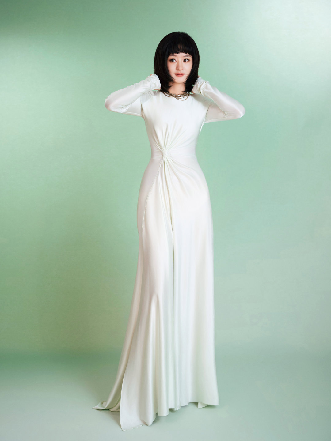 赵丽颖|品牌直播活动造型出图,短发齐刘海搭配Victoria Beckham 2026早春度假系列长裙,缀以金属项链,又美又萌,状态满分💯