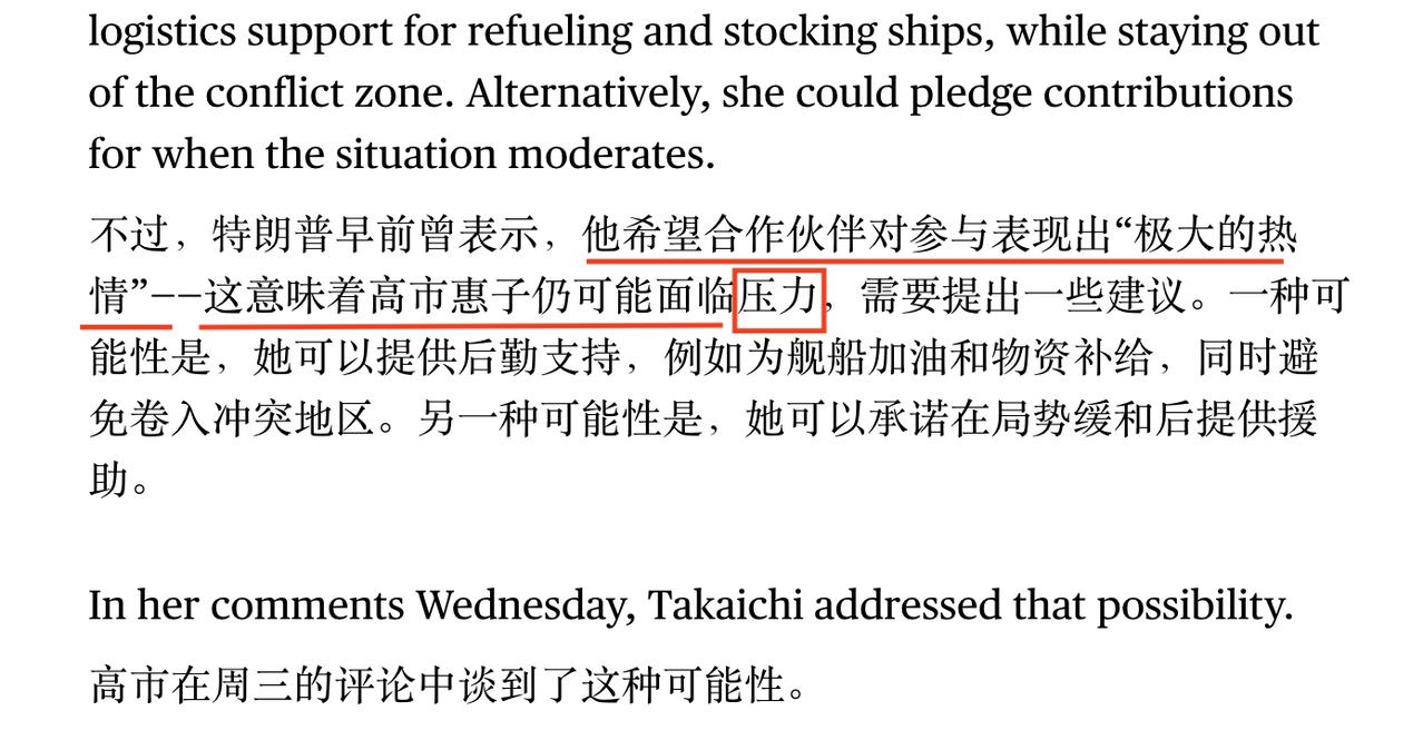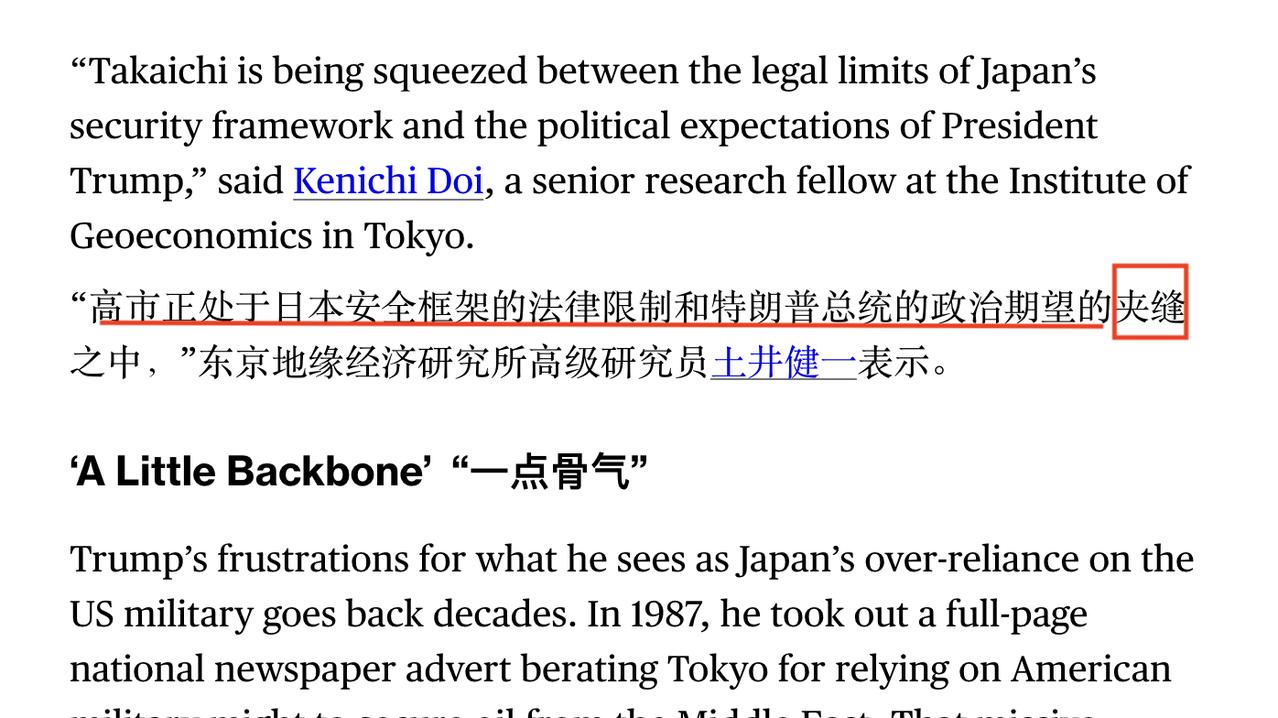 高市早苗出访美国,彭博社引用一则妙评“高市正处于日本安全框架的法律限制和特朗普总统的政治期望的夹缝之中”——说的是特朗普希望高市向霍尔木兹海峡派遣军舰,但高市以宪法不允许拒绝了。于是,高市需要在夹缝中求生存。 彭博社还说:“不过,特朗普早前曾表示,他希望合作伙伴对参与表现出 ‘极大的热情 ’——这意味着高市早苗仍可能面临压力。” “极大的热情”然后是“压力?”不行,我已经不能好好思考了。我去休息,各位晚安,或者早安🍵