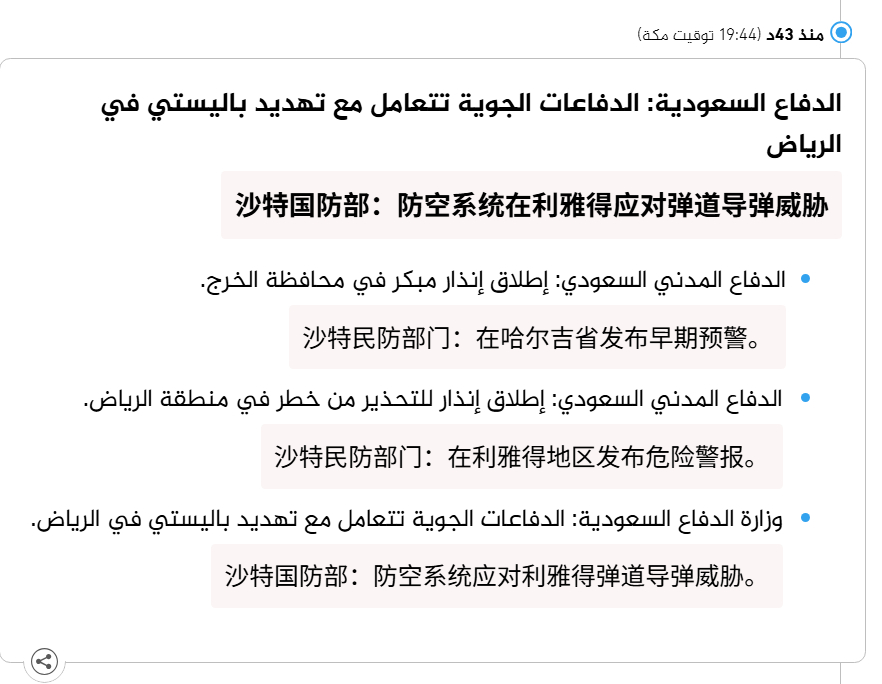 🔻沙特国防部:防空系统在利雅得应对弹道导弹威胁。🔻via aljanews伊朗总统证实情报部长遇害伊朗石油工业设施遭袭海外新鲜事中东现场直击