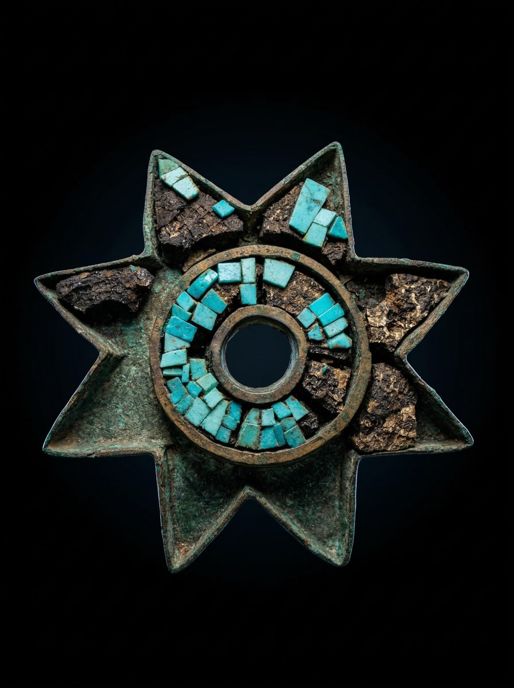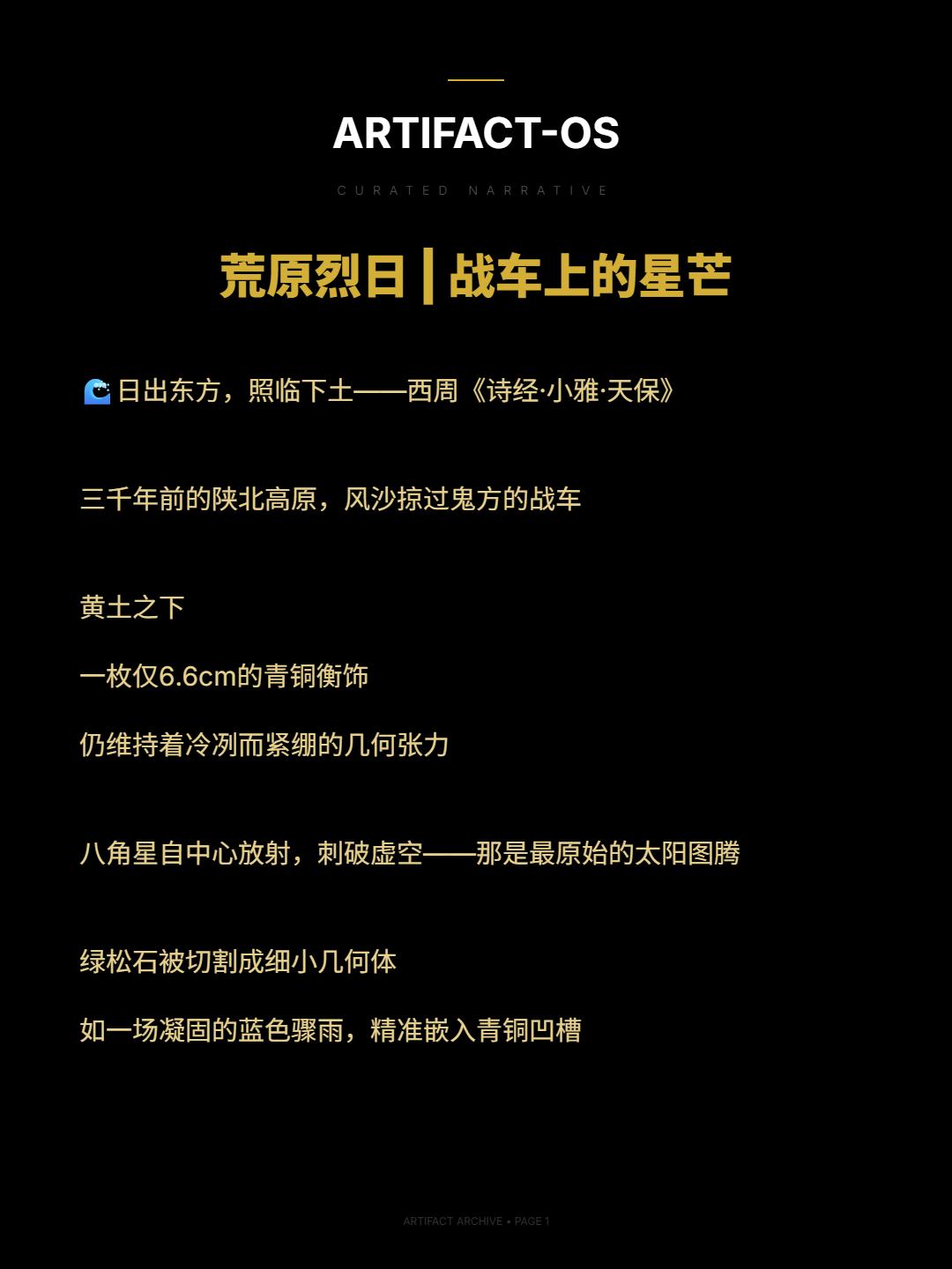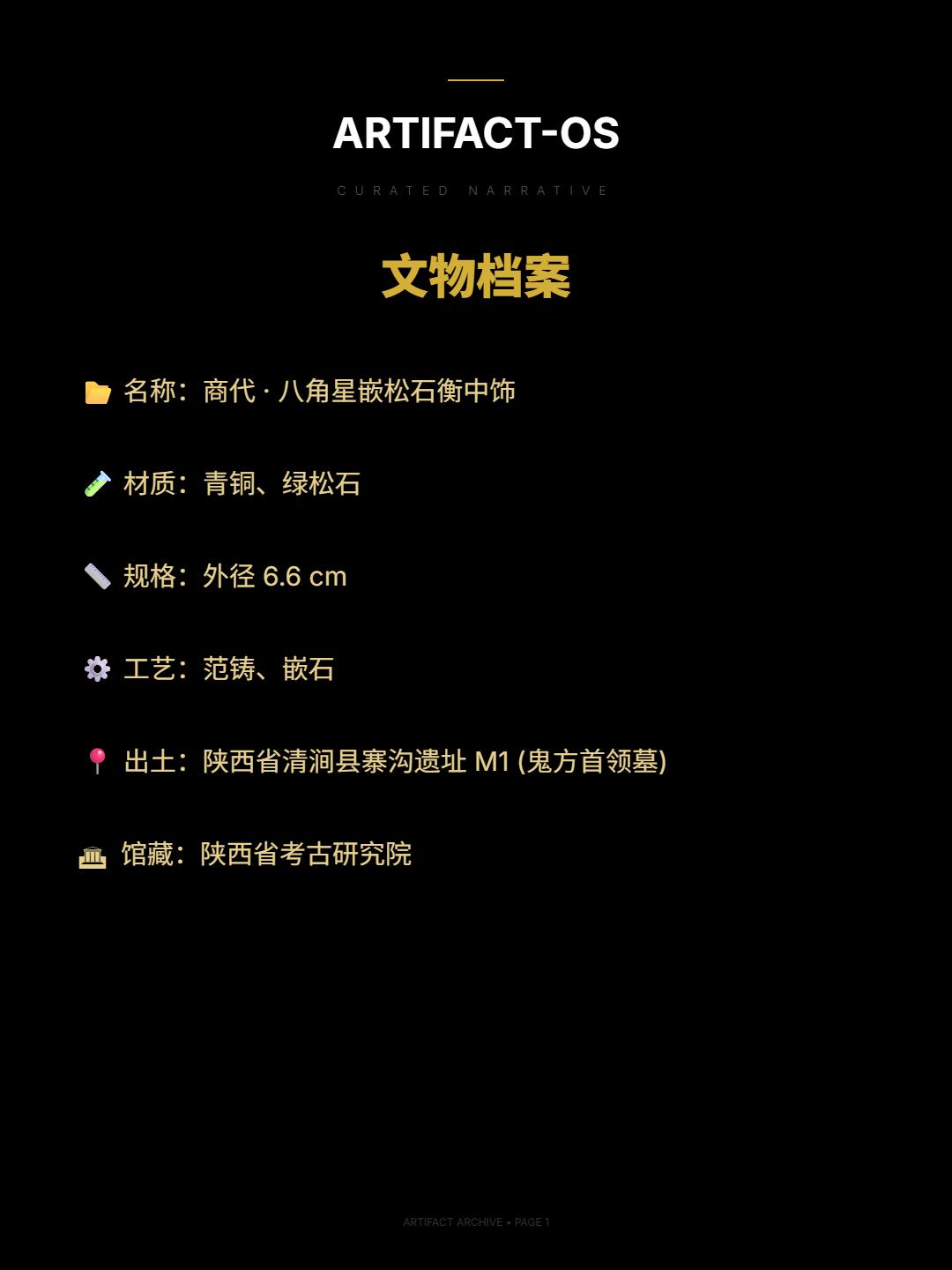 荒原烈日 | 战车上的星芒。🌊日出东方,照临下土——西周《诗经·小雅·天保》 三千年前的陕北高原 风沙掠过鬼方的战车 黄土之下 一枚仅6.6cm的青铜衡饰 仍维持着冷冽而紧绷的几何张力 八角星自中心放射 刺破虚空——那是最原始的太阳图腾 绿松石被切割成细小几何体 如一场凝固的蓝色骤雨 精准嵌入青铜凹槽 在烈日反复照射之下 青铜愈发冷硬 而松石在光里,隐约浮起一层温润的色泽 历经氧化与剥蚀 北方方国那种凌厉的审美 仍在残色中缓慢跳动 它不是装饰 更像被固定在战车中央的一枚“太阳核心” 当它嵌