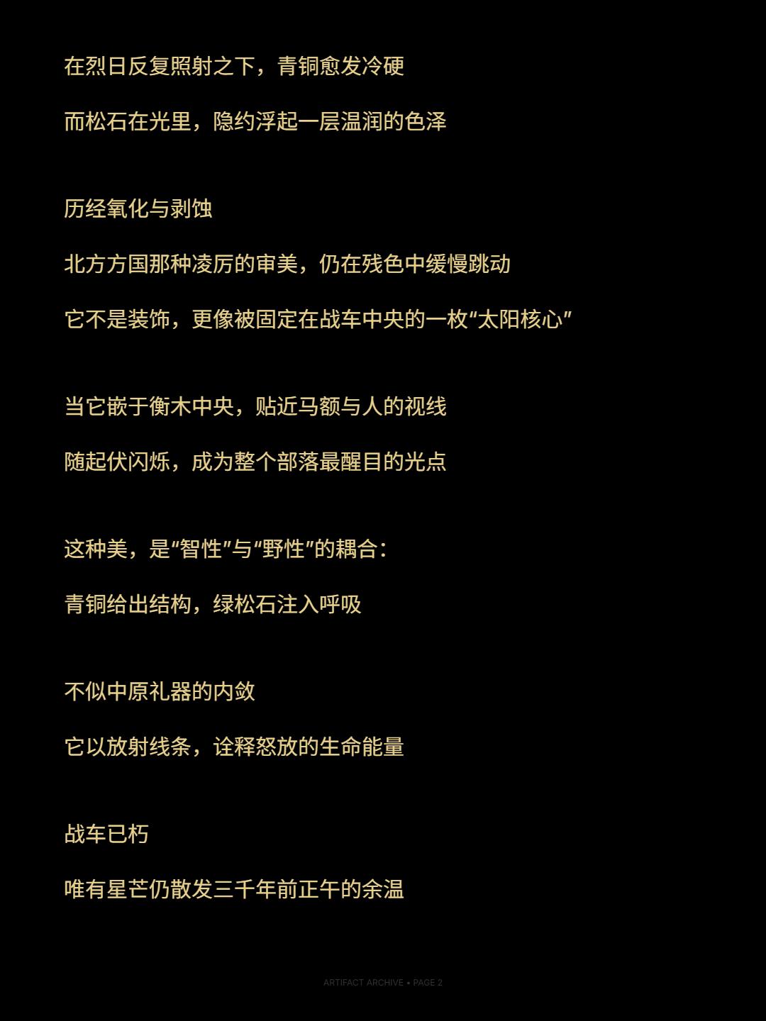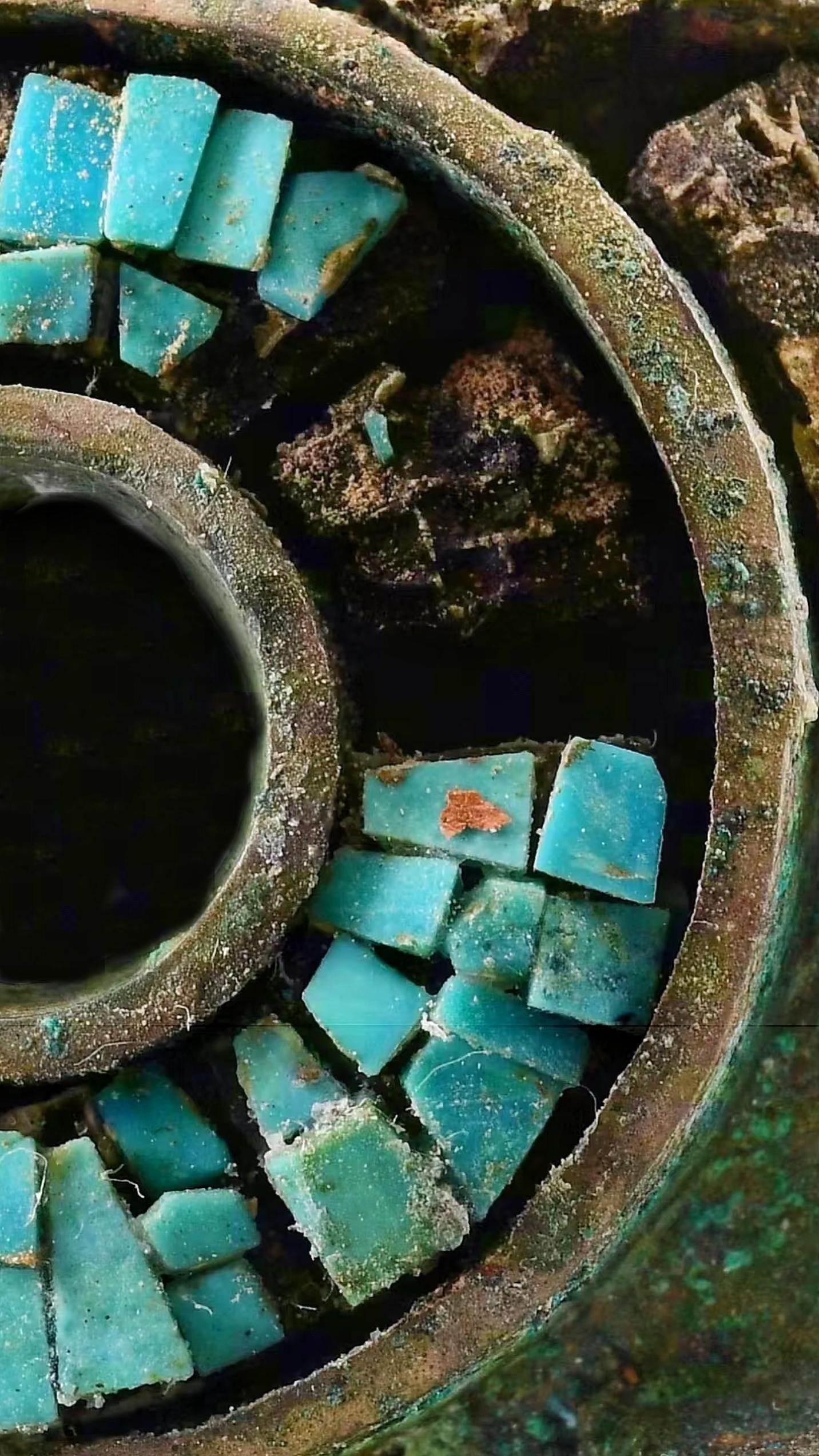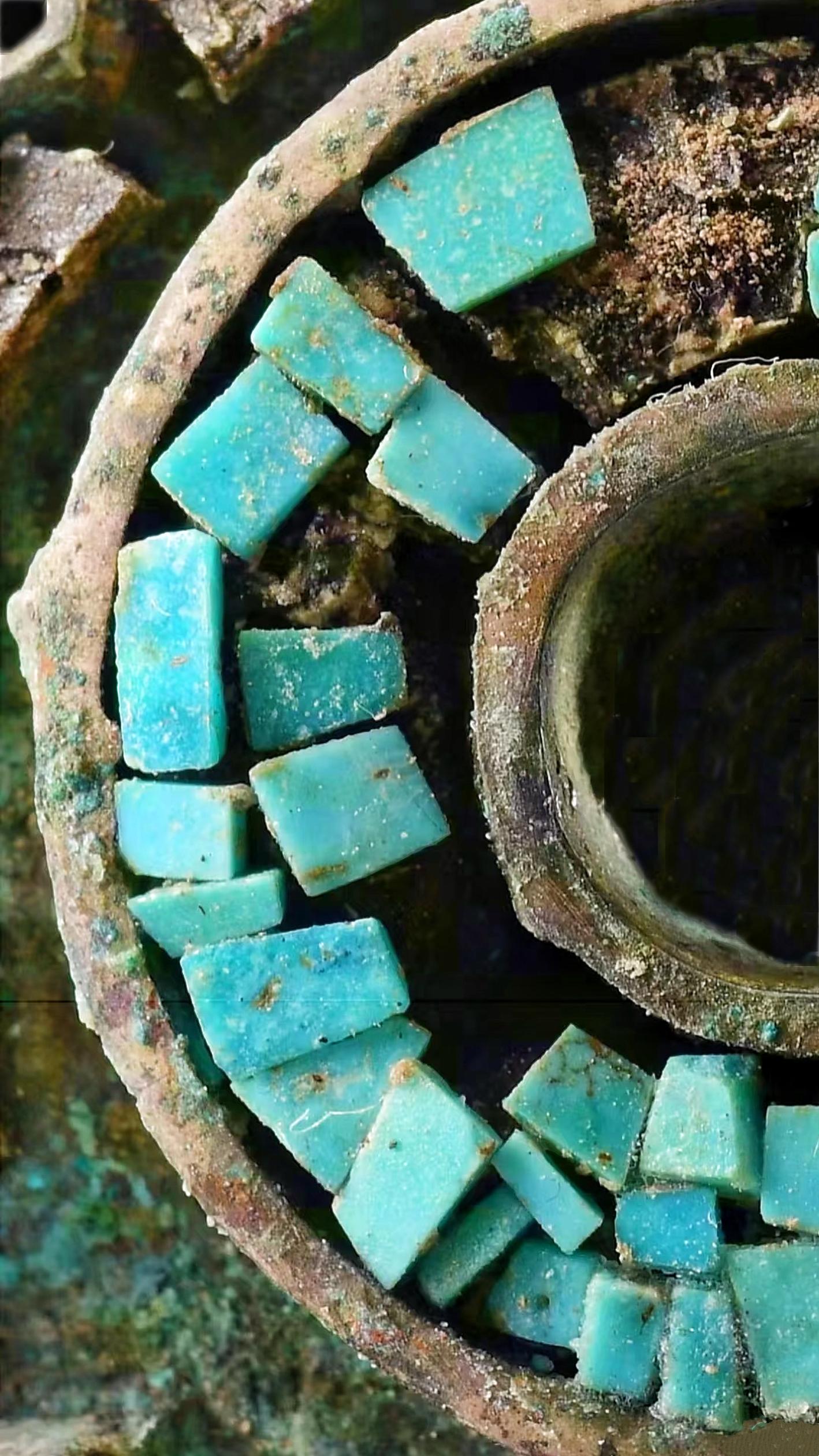 荒原烈日 | 战车上的星芒。🌊日出东方,照临下土——西周《诗经·小雅·天保》 三千年前的陕北高原 风沙掠过鬼方的战车 黄土之下 一枚仅6.6cm的青铜衡饰 仍维持着冷冽而紧绷的几何张力 八角星自中心放射 刺破虚空——那是最原始的太阳图腾 绿松石被切割成细小几何体 如一场凝固的蓝色骤雨 精准嵌入青铜凹槽 在烈日反复照射之下 青铜愈发冷硬 而松石在光里,隐约浮起一层温润的色泽 历经氧化与剥蚀 北方方国那种凌厉的审美 仍在残色中缓慢跳动 它不是装饰 更像被固定在战车中央的一枚“太阳核心” 当它嵌