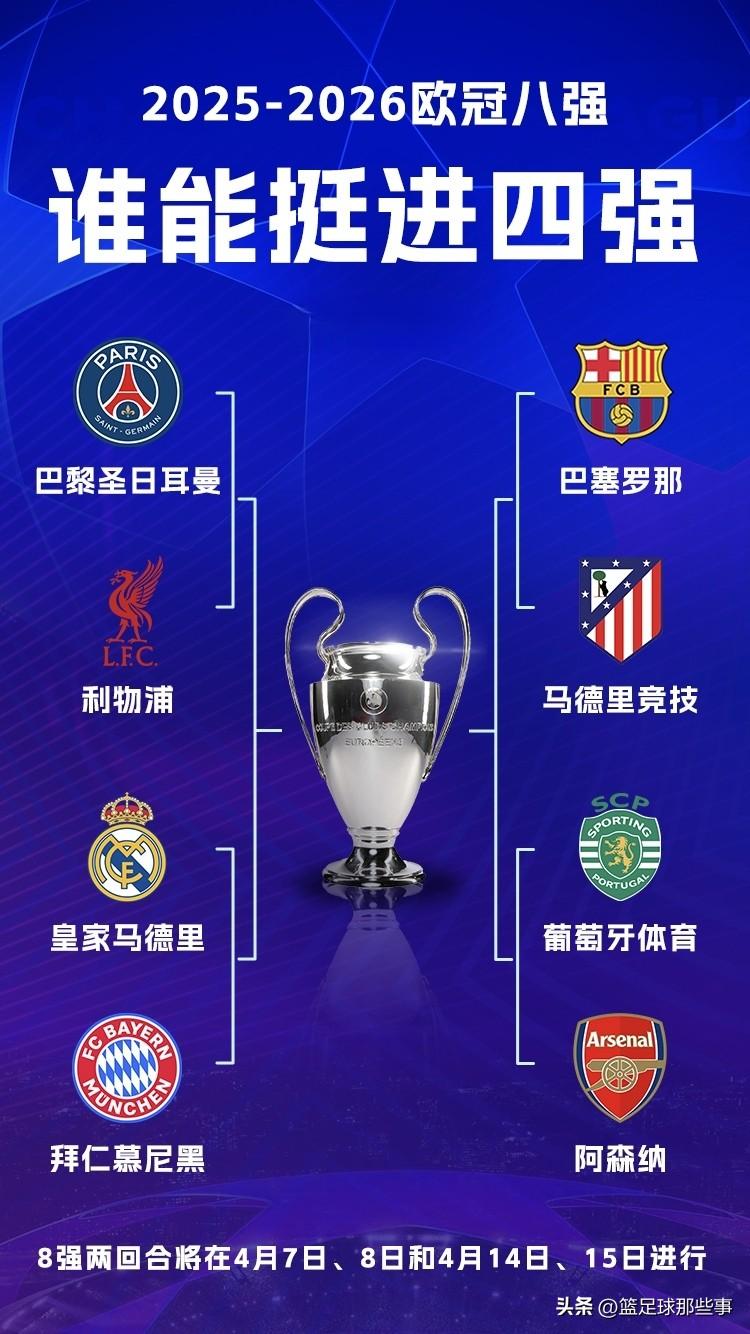 欧冠8强出炉,1/4决赛对阵揭晓,谁能突围不好判断: ✅巴黎圣日耳曼VS利物浦:比着上赛季两支球队状态都是下滑,不过大巴黎近期战绩回升,加上恩里克的运筹帷幄,值得高看一眼。 ✅皇马VS拜仁:两支球队近期状态都火热,皇马有联赛羁绊可能但又有欧冠底蕴加持,这组五五开。 ✅巴萨VS马竞:西甲内战再次在欧冠上演,巴萨实力强大,马竞意志坚韧,算上联赛两队将会踢3场,看好巴萨晋级。 ✅葡萄牙体育VS阿森纳:阿森纳四线作战,实力强大,理应晋级,就看葡萄牙体育能否给枪手带来麻烦了。
