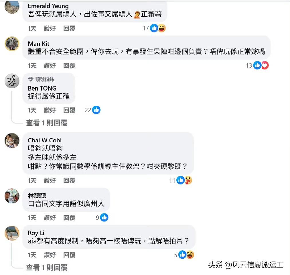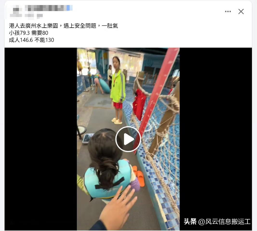 一名香港游客发帖:去广州水上乐园,遇上安全问题,一肚子气;他表示孩子身高79.3厘米,要求要达到80厘米才能玩;成人身高146.6厘米,规定不能低于130厘米……感觉规定太死板,不玩了! 发帖后被香港网友嘲笑:玩不起就别玩!为难工作人员干嘛?
