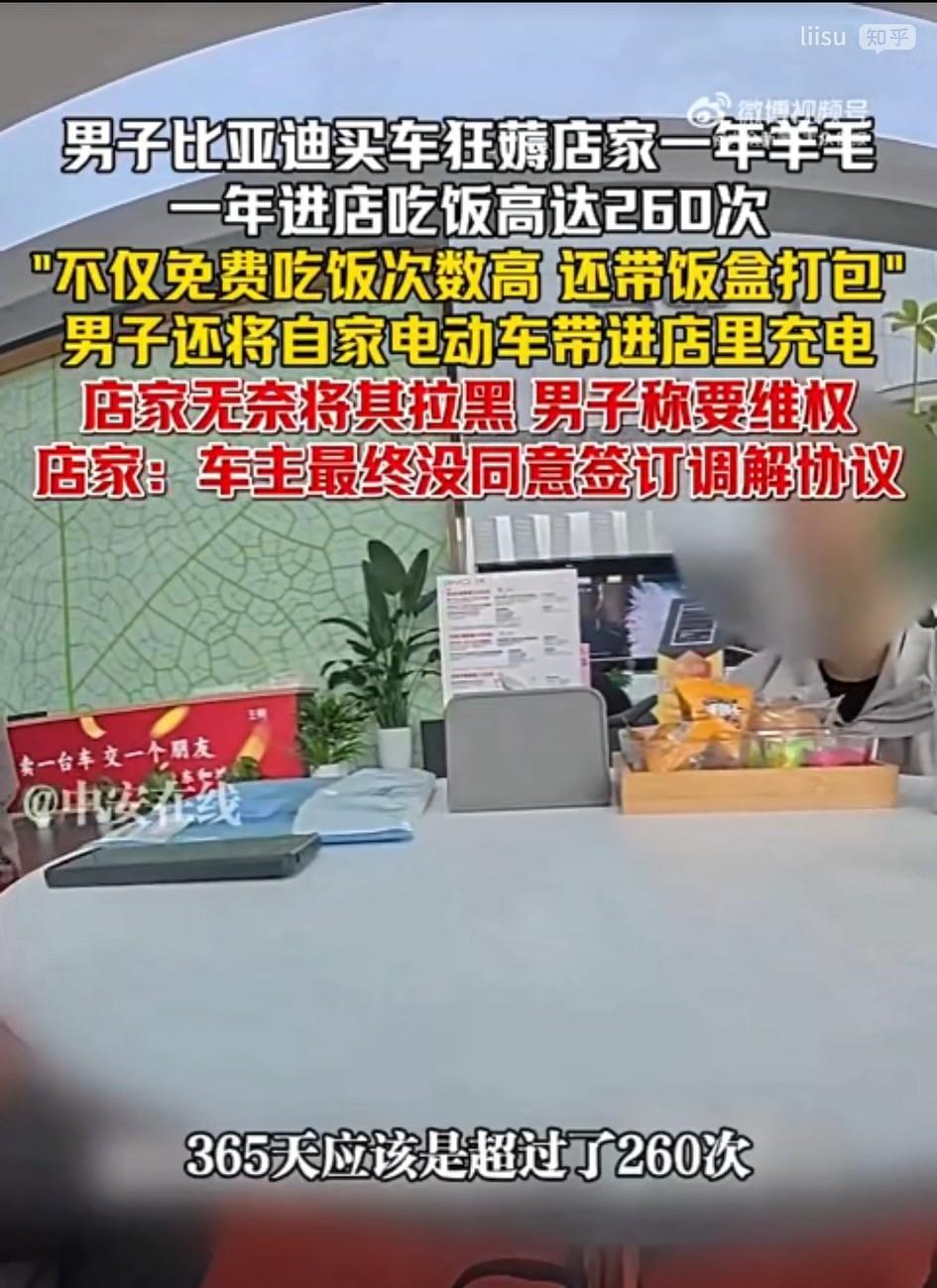 一年去4S店蹭饭260次,平均一天半一回,这哪是薅羊毛,这简直是太不把别人当回事了吧!这是把人家售后当自家食堂了吧?更绝的是,被拉黑了还要“维权”——维啥权?吃免费盒饭的用餐权吗? 说真的,4S店提供免费餐是给来看车、保养的客人行个方便,不是开慈善食堂。你车买一年了,饭倒吃了260回,这就不是占便宜,是贪得无厌。薅羊毛是在规则内图一乐,但这老兄已经把客气当福气,把宽容当软弱,彻底越界了。 这事儿也给商家提个醒:开门做生意,得有人情味,但也得有点雷霆手段。监控一调、记录一查,发现不对劲就该果断拉响警报。先礼后兵,劝不住就拉黑,这没什么不好意思的。生意是做给真正的客户看的,不是用来纵容无底线索取的。一年蹭饭260次 媷羊毛