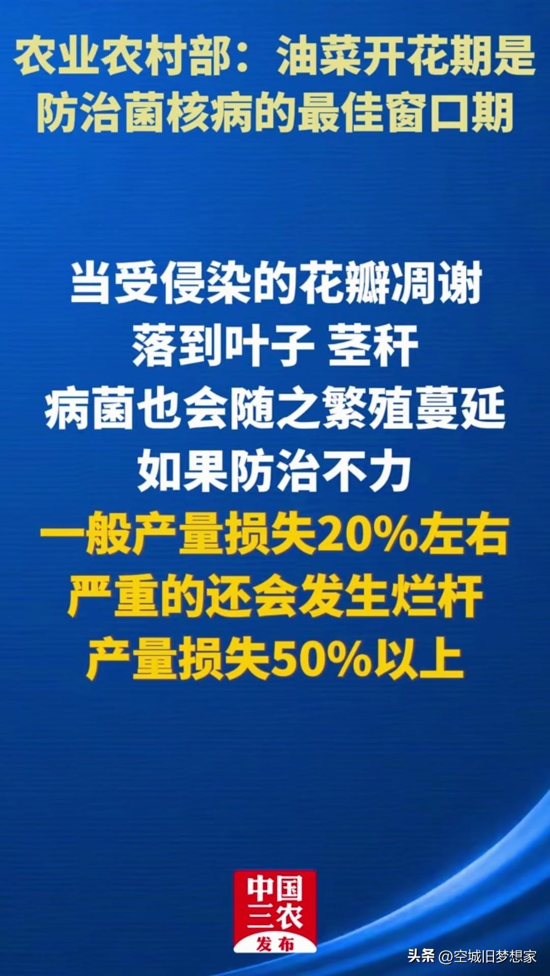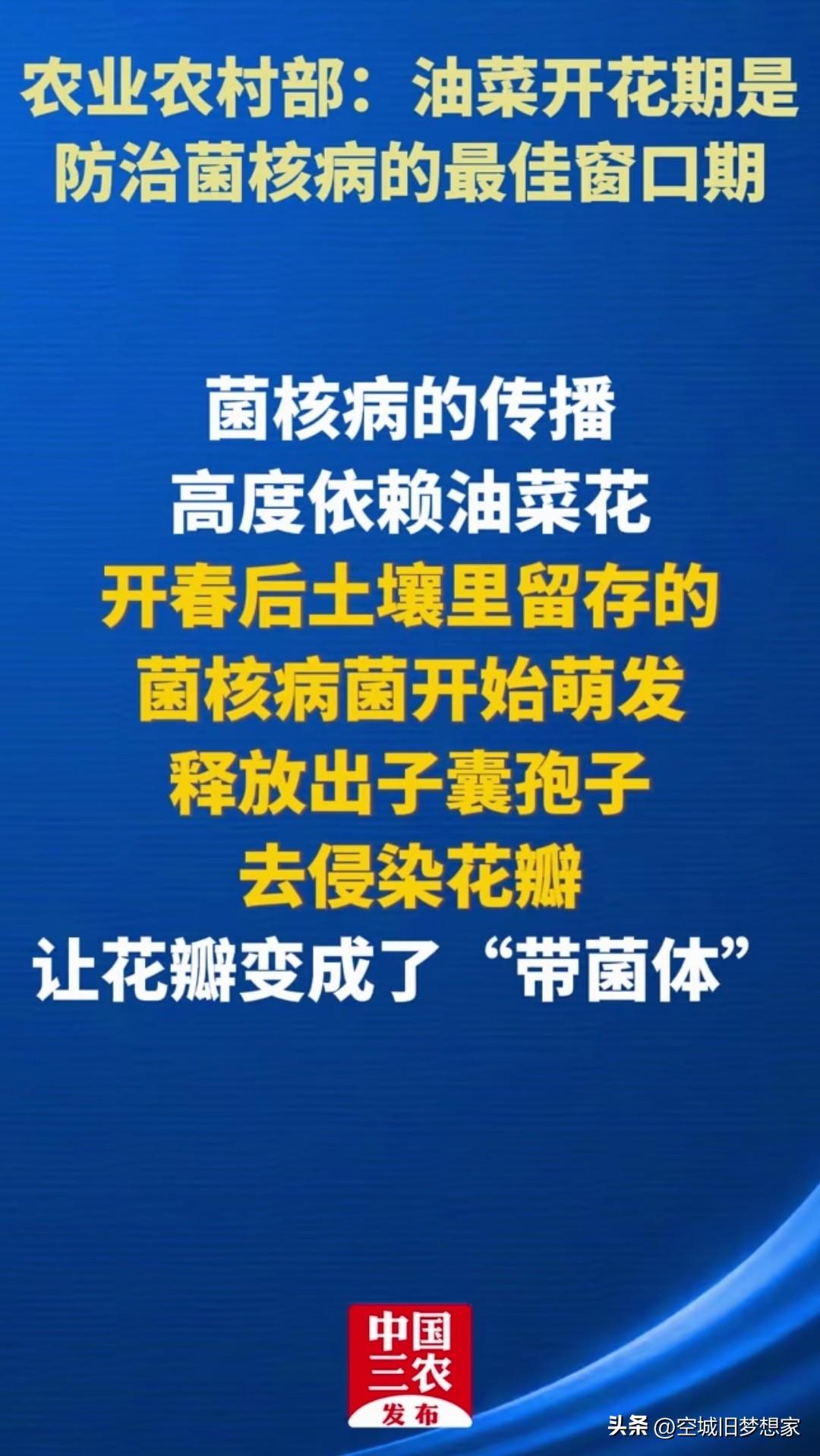 别再守着老观念了!农业农村部都发话了,油菜花期打药才是科学防治! 最近刷到好多人在争论: “以前从来没见过油菜开花时打药,这不是伤蜂吗?” “老祖宗的经验难道还不如现在的新技术?” 其实农业农村部早就明确说了:油菜开花期,正是防治菌核病的最佳窗口期! 为啥要在花期打? 菌核病就靠油菜花传播:开春土里的病菌萌发,孢子专门侵染花瓣,让花瓣变成“带菌体”,等花瓣凋落粘到茎叶上,病菌就会疯狂蔓延,轻则减产20%,重则烂杆绝收50%以上! 花期打药,刚好掐住病菌的“命门”,把带菌率压到最低,这才是事半功倍的科学做法。 老经验要跟着时代走 以前没条件精细防控,只能靠天吃饭;现在农药技术、施药方式都升级了,国家鼓励推进的技术,必然是经过反复验证、兼顾产量和生态的。 不是老观念错了,是科技在进步,我们的种植方式也该跟着更新了。 种地从来不是墨守成规,而是跟着科学走、跟着政策走。 别让过时的经验,耽误了一年的收成! 你家种油菜吗?今年会在花期打药防治菌核病吗?