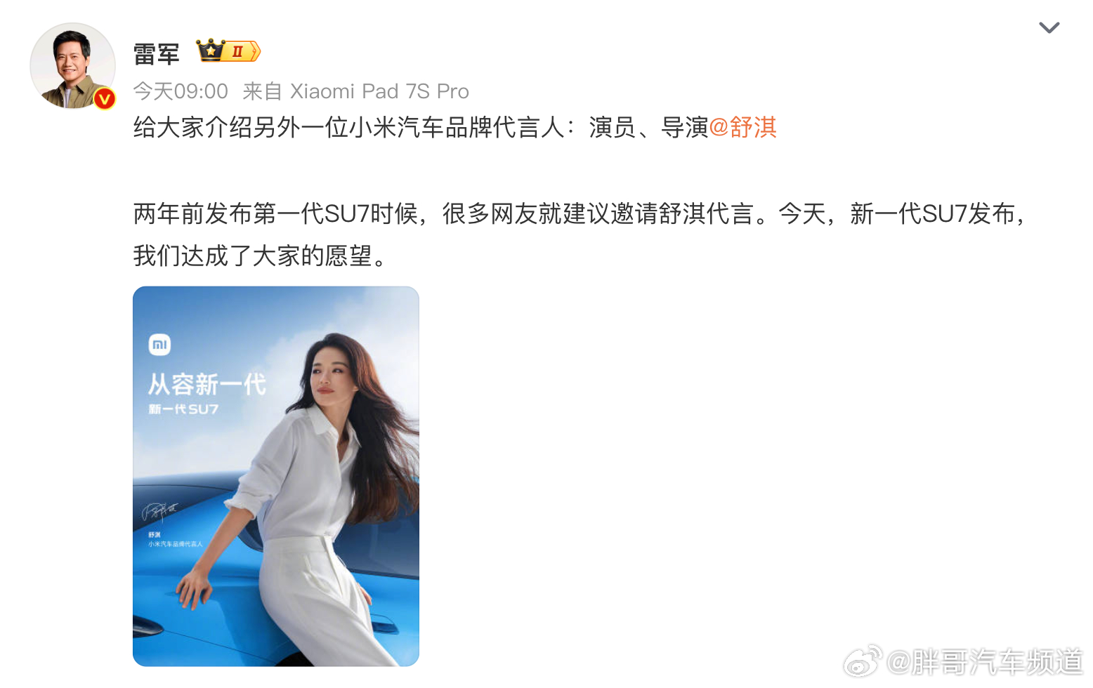 胖哥汽车频道 小米官宣第二位品牌代言人舒淇!不知道今晚有没有幸一见鸭~小米汽车 舒淇小米大模型