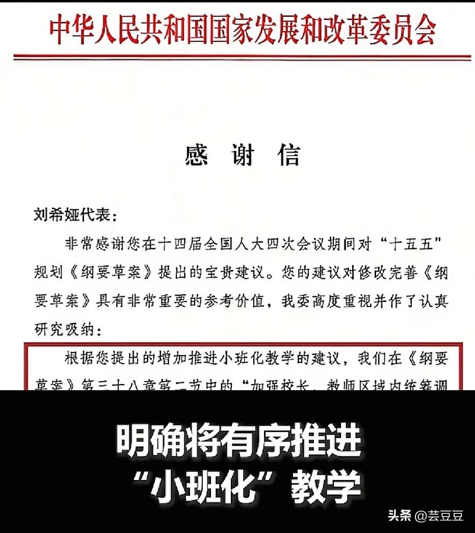 太好了! 中国的教育要变天了! 万万没想到!国家“十五五”规划里,竟然采纳了人大代表刘希娅的建议,连教育部都专门给她写了感谢信。 这可是多少家长和老师盼了多少年的事! 以前一个班四五十个孩子,老师再负责、再上心,也只能“大锅饭”,照顾不到每个孩子的个性。现在出生率降了,班级人数往下走,这其实是个调整教育模式的好机会。 核心就两点,大家都拍手叫好: 1. 推行小班化教学 一个班人少了,老师才能顾得过来,孩子才能得到真正的关注。这不是为了省钱,而是为了教育质量。 2. 老师得敢管、能管 小班化是硬件,老师的素质和管理权才是软件。规矩得立住,奖惩要分明,不然老师不敢管,孩子最后也吃亏。 以前大班额没办法,只能凑合。现在机会来了,校舍、老师都准备好了,赶紧推行,别再拖延了! 大家觉得这波教育改革能落地吗?你心目中最理想的班级人数是多少?