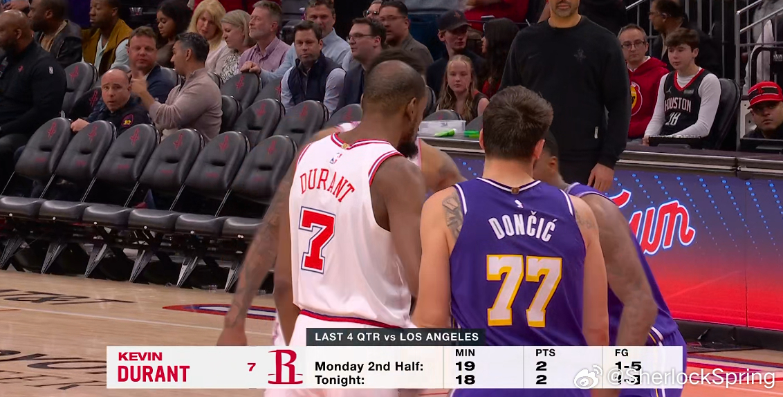 今天二番战,湖人上来就包夹杜兰特,果然火箭接连失误,杜兰特半场依旧仅得2分。虽然申京本场回归,但火箭的比赛打得和前几天输球没什么区别,杜兰特的数据甚至都跟上场比赛的下半场一样的。