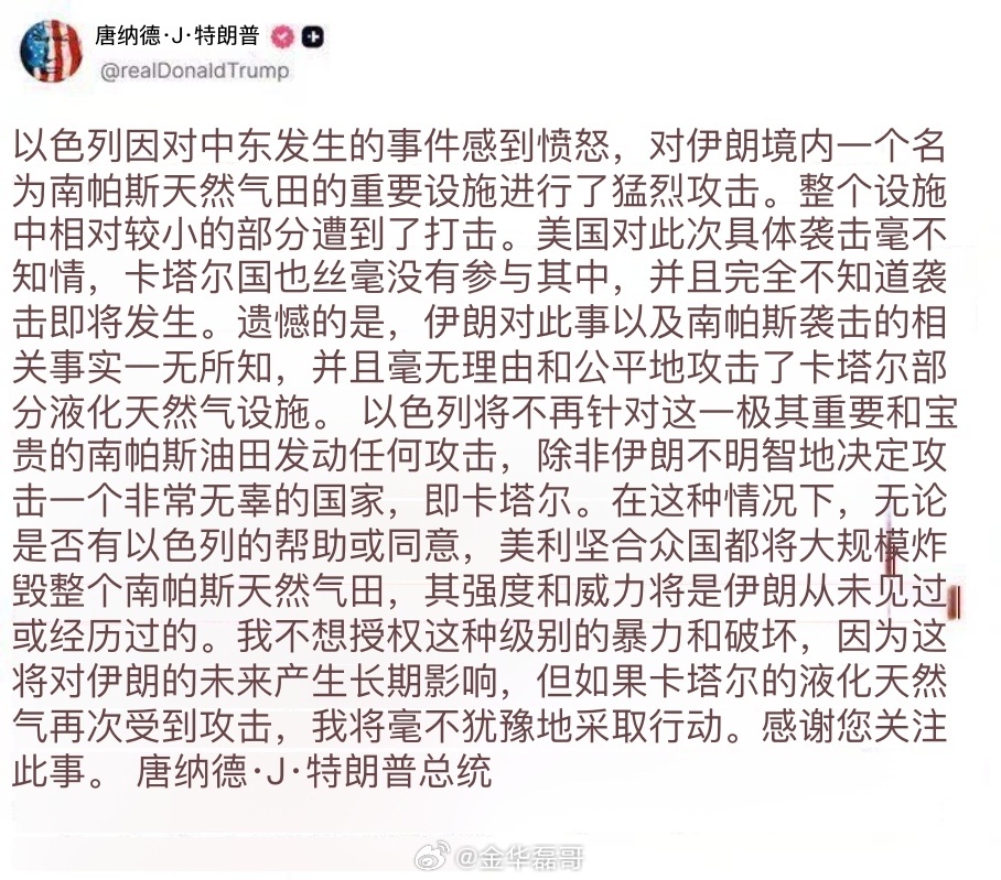 美以袭击伊朗石化设施特朗普彻底破防了,川普警告称,若伊朗因以色列袭击南帕尔斯气田而对卡塔尔发动报复性攻击,他将下令美军对南帕尔斯气田,全球最大天然气田实施"大规模摧毁性打击。热点解读海外新鲜事