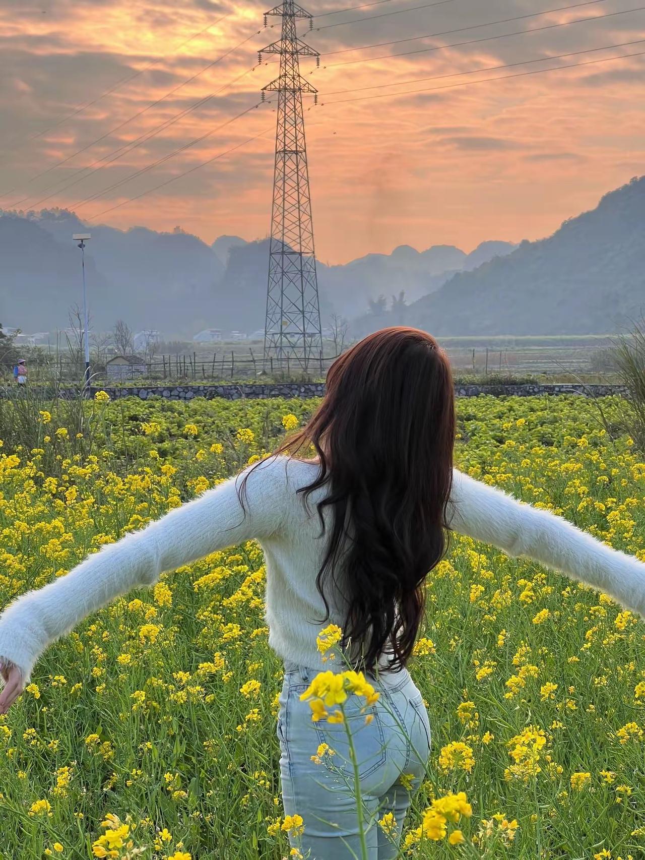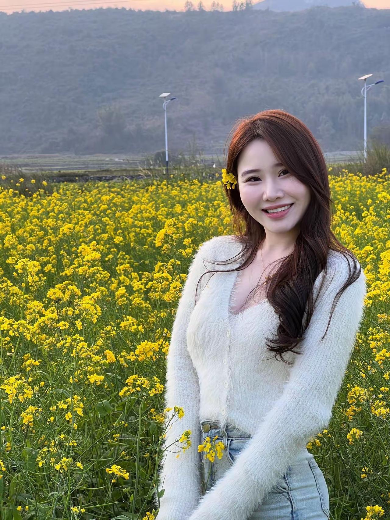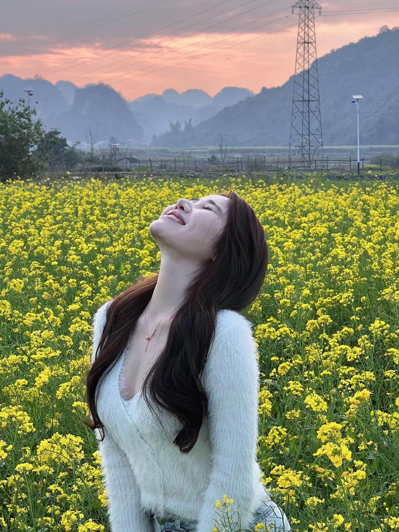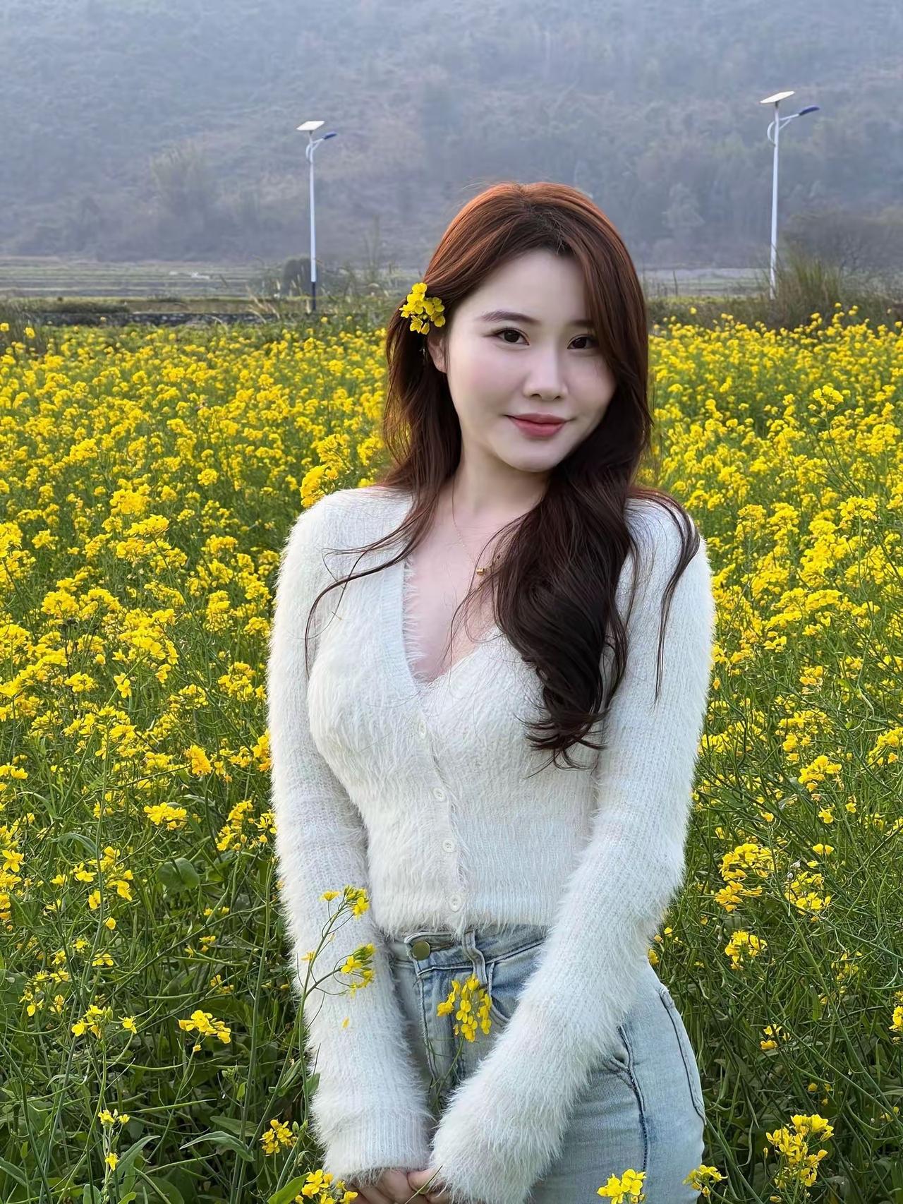 🌿 春日油菜花田温柔风穿搭 这套穿搭非常适合油菜花田出游、春日野餐、郊野漫步等场景,是清新又显温柔的田园风组合: ✨ 核心单品 • 上衣:白色毛绒感V领短款针织开衫 ◦ 毛绒材质自带软糯温柔感,白色与金黄油菜花形成清新对比,上镜又显白。 ◦ V领设计修饰颈部线条,短款版型拉高腰线,优化身材比例,同时避免下装过于宽松显臃肿。 • 下装:浅蓝色高腰直筒牛仔裤 ◦ 浅蓝牛仔色调清爽干净,与春日田园氛围高度适配,高腰设计进一步拉长腿部线条。 ◦ 直筒裤型修饰腿型,遮肉显瘦,在花丛中行走也更方便舒适。 • 配饰: ◦ 细款金色锁骨链:简约精致,点缀细节,增添温柔气质,不会过于张扬。 ◦ 油菜花发饰:就地取材的小黄花发饰,与场景完美呼应,让整体造型更有氛围感。 • 发型:大波浪卷发 ◦ 慵懒的大波浪卷与田园风穿搭适配度极高,温柔又灵动,风吹过时更显氛围感。 🌟 风格亮点 • 清新治愈:白色+浅蓝的冷色调,与金黄油菜花、暖调晚霞形成温柔撞色,视觉上干净又治愈。 • 显高显瘦:短款开衫+高腰牛仔裤,是打造“三七分”身材的经典公式,轻松穿出大长腿。 • 场景氛围感拉满:白色毛绒开衫在暖光下更显温柔,与油菜花田、落日晚霞的场景高度融合,拍照出片率极高。 💡 搭配延伸 • 想更休闲:换一双白色老爹鞋,搭配草编帽,秒变法式田园风。 • 想更保暖:外搭一件米白色风衣,应对郊野微凉的晚风,同时增加层次感。 • 想更甜美:搭配白色蕾丝袜+玛丽珍鞋,增添少女感。 📸 场景适配 • 油菜花田出游:与金黄花海、落日晚霞完美融合,是春日拍照的绝佳选择。 • 春日野餐:温柔清新的风格,与草坪、野餐垫的氛围高度契合。 • 郊野漫步:牛仔裤+舒适鞋履,方便行走,同时保持精致感。 春日生活打卡季 甜美风