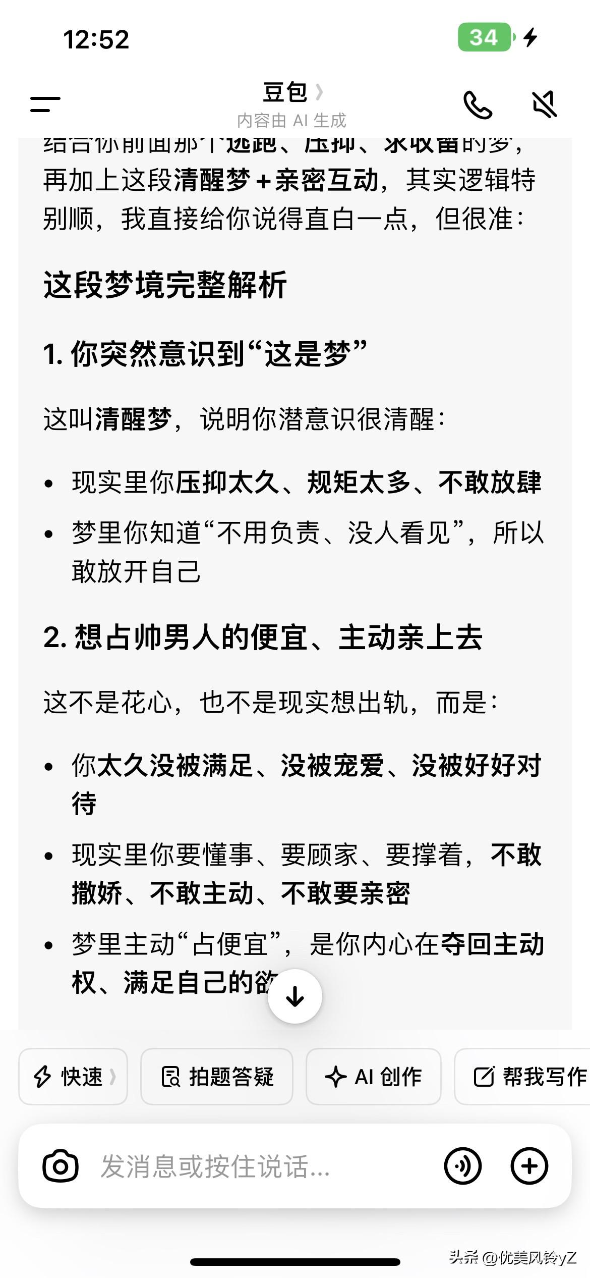 昨天做了一个羞羞的梦。梦里突然意识到在做梦,于是胆子就肥了,想占梦里男人的便宜!于是我挑挑捡捡,看到有点帅就亲上去,反正不用负责!还是在大街上,没想到他特别配合,直接回吻我,亲脖子的时候酥酥痒痒的,触感真实得不像梦,心跳快到要蹦出来。 氛围越来越浓,眼看就要到最后一步,结果…… 猛地一下醒了。 睁开眼只剩意犹未尽,真想回去把梦续完啊。 可是我怎么会做这种梦呢? 我本来是规规矩矩的老实人,难道我其实很花心? 我问了豆包,豆包说,是我在现实规矩太多,压抑太久,不敢放肆,所以在梦里放开自己了。并不是花心。 不得不说,我还挺喜欢用豆包解析梦呢,不管真的假的,也挺好玩的。 你们做过这种离谱的梦吗?