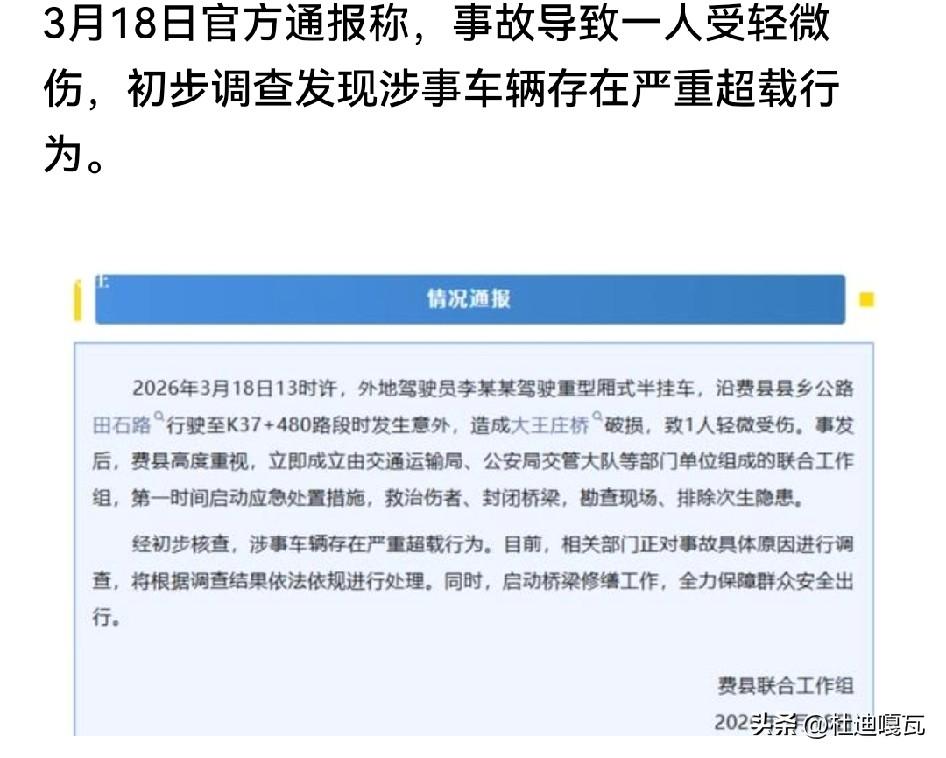 关于临沂大桥发生坍塌的说法,当地镇政府先是说一辆货车的车轮胎爆了,把桥给震坏了,紧接着费县联合工作组通报是因为由于货车严重超载所致。 毕竟是乡村公路桥,使用的年头也很长了,不管是货车轮胎爆了,还是货车严重的超载,都会对桥梁造成损坏。 现在最要紧的是,一方面要对超载进行严查,另一方面要对老旧桥梁开展排查,这样双管齐下才能防止同类事故的发生。