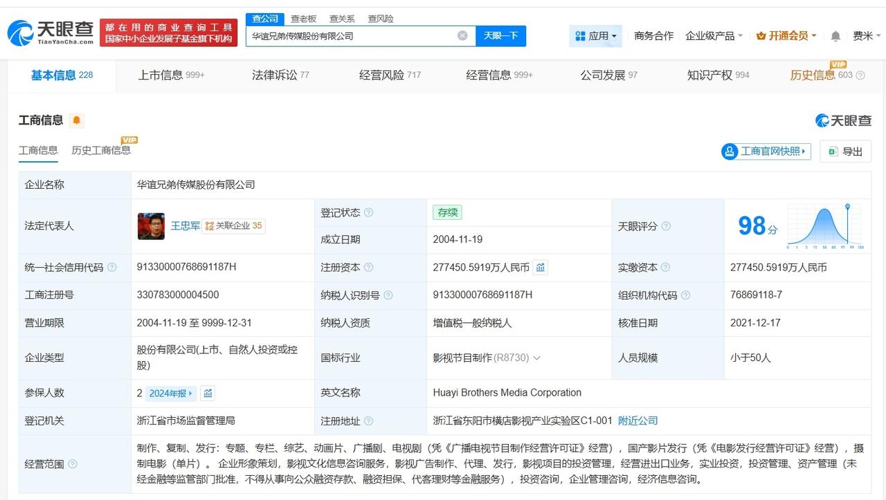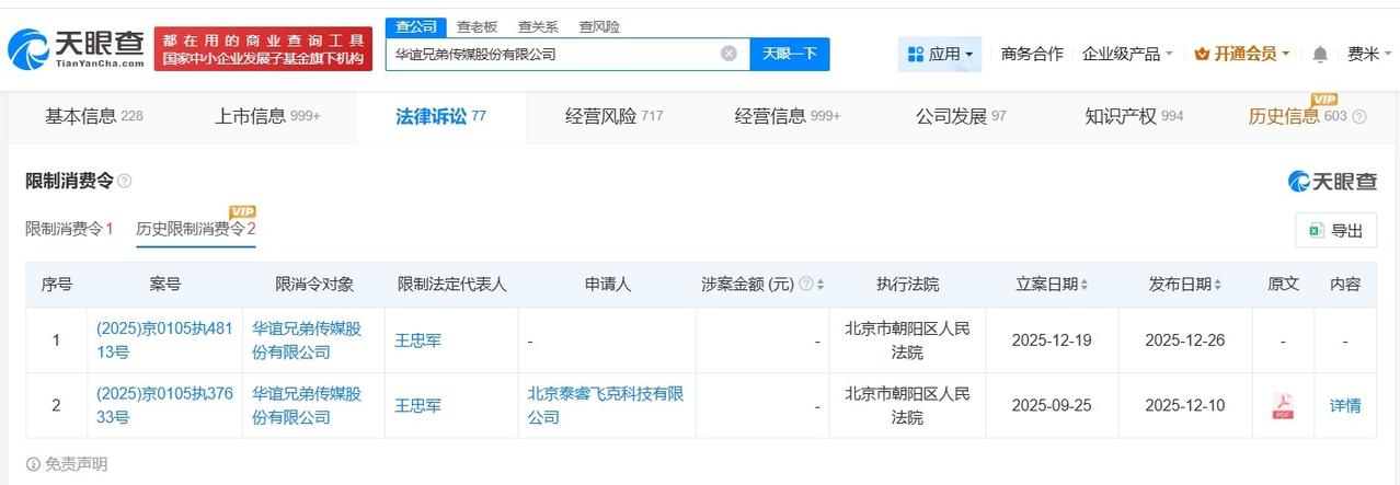 华谊兄弟及王忠军因189万案款被限消 华谊兄弟及王忠军已被多次限消 天眼查天眼风险信息显示,近日,华谊兄弟(300027)及法定代表人王忠军新增一则限制消费令,执行法院为北京市朝阳区人民法院,案件流程信息显示,此前,该公司已因此案被执行189万余元。 华谊兄弟传媒股份有限公司成立于2004年11月,注册资本约27.7亿人民币,经营范围包括企业形象策划、影视文化信息咨询服务、影视项目的投资管理等。股东信息显示,该公司由王忠军等共同持股。历史限制消费令信息显示,该公司曾被两次限消。 天眼查信息: