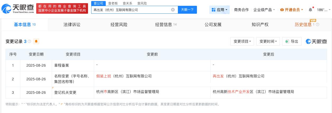 杭州假装上班公司已更名再出发 杭州假装上班公司24年0人参保假装上班公司有员工月入七八万 据报道,近日,杭州假装上班公司火遍全网,有员工“月入”七八万,每天花30元就能体验朝九晚五,支付加班费还能体验加班到深夜。 天眼查App显示,杭州假装上班公司关联方再出发(杭州)互联网有限公司成立于2024年12月,法定代表人为胡家干,注册资本10万人民币,经营范围包括互联网数据服务、互联网销售、企业管理咨询等,由胡家干、于小娜共同持股。变更记录显示,2025年8月,该公司企业名称由假装上班(杭州)互联网有限公司变更为再出发(杭州)互联网有限公司。此外,2024年年报信息显示,该公司参保人数为0。 天眼查信息: