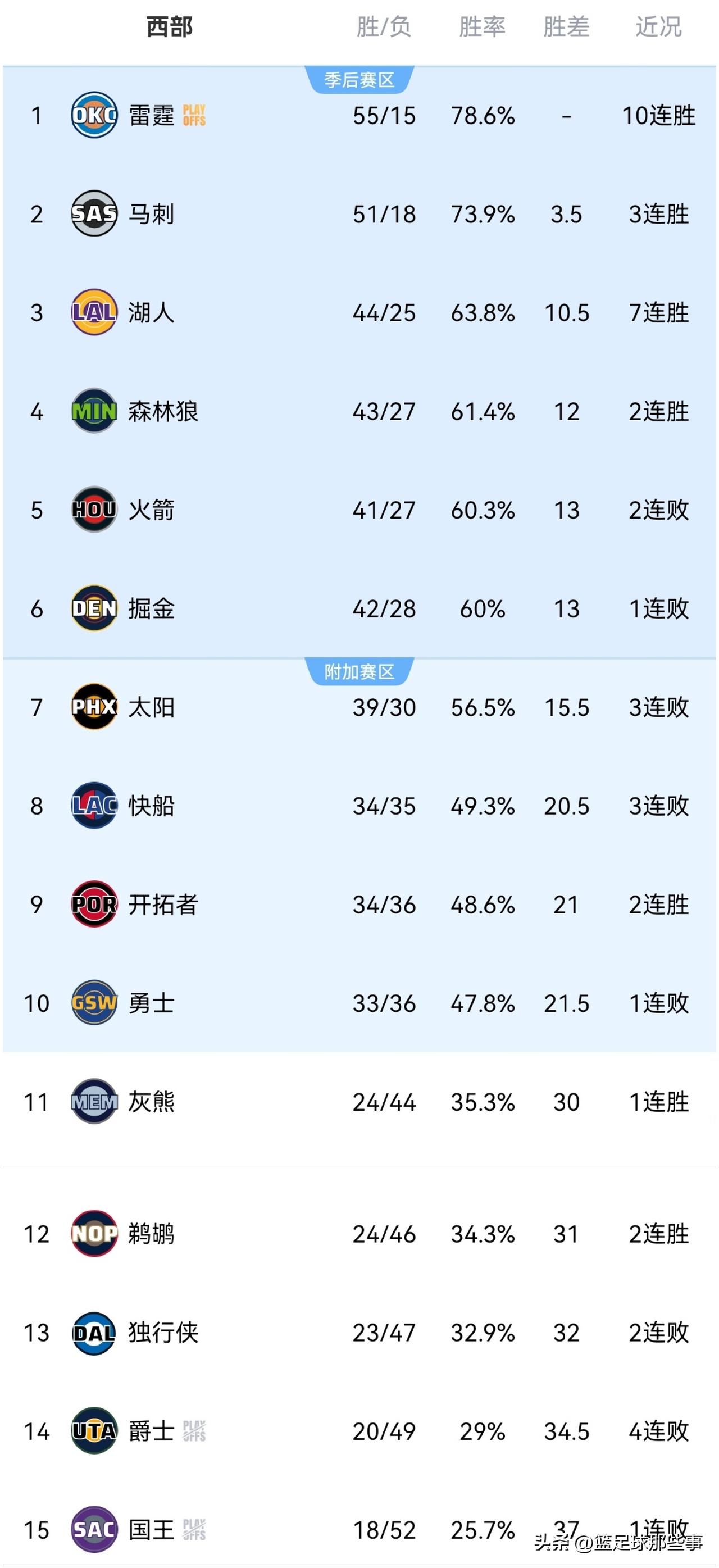NBA西部最新积分榜: ✅湖人124:110再胜火箭豪取7连胜坐稳第3,东契奇关键时刻连中三分砍下40分9板10助,詹姆斯14投13中高效砍下30分5板,两大天王同时爆发这样的湖人难以战胜;火箭方面首发五虎都得分上双,伊森13投4中效率继续低下,福兰特在包夹防守下只获得11次出手机会。 ✅雷霆121:92大胜篮网豪取10连胜继续领跑全联盟,本场实力差距悬殊,雷霆12人出场10人得分6人得分上双,亚历山大20分刚好延续得分记录; ✅掘金118:125不敌灰熊,这是一场冷门,此前灰熊已经遭遇8连败,约基奇29分14板9助但出现高达10次失误,灰熊12人出场全部得分其中6人得分上双,真是前面开花; ✅其他场次比赛结果,残阵勇士99:120惨败凯尔特人,独行侠120:135不敌老鹰,森林狼147:111大胜爵士,快船109:124遭鹈鹕18分大逆转,开拓者127:119击败步行者。