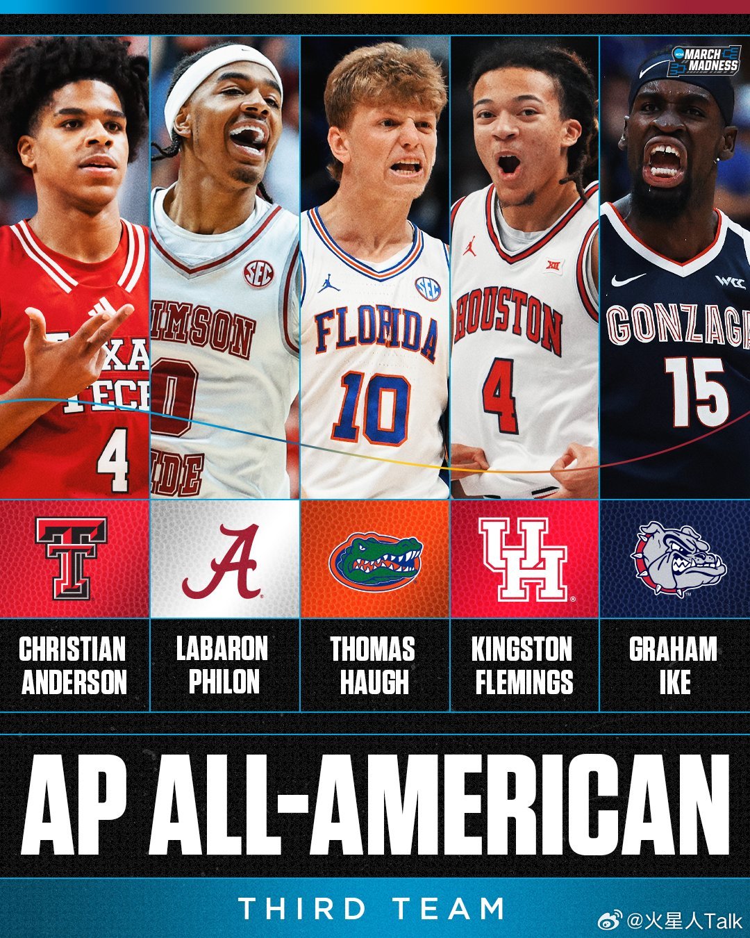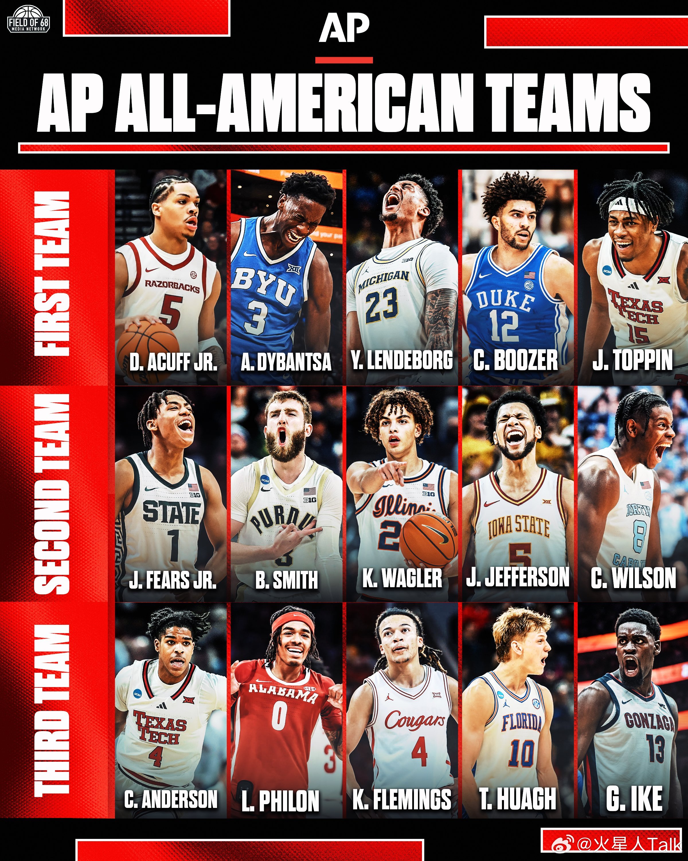 2025-2026赛季NCAA男篮 AP美联社的最佳阵容。
