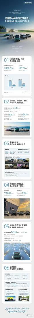 3月18日,奇瑞汽车股份有限公司发布2025年全年业绩,这是其在香港上市后的首份年报。报告显示,2025年奇瑞汽车全年营收达3002.87亿元,同比增长11.3%,首次突破3000亿元;年度利润为195.07亿元,同比大幅增长36.1%,两项核心经营指标均创历史新高。(快科技)