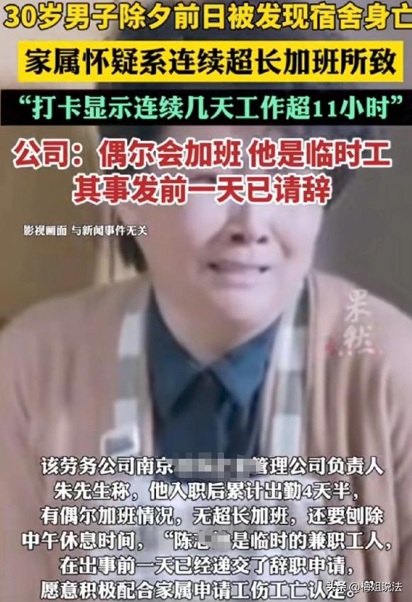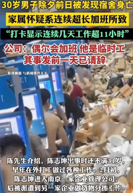 江苏南京,30岁男子陈某外出打工,竟在宿舍突然没了气息。家属翻他手机才发现,他连续四天工作都超11小时,怀疑是加班累倒致死,找公司要赔偿。可公司却百般推诿,先说只赔2万,又改口说他是临聘人员,事发前一天已请辞。网友直呼:这说辞也太巧了! 腊月二十八,南京满城挂起红灯笼,街上的人都在往家赶。陈家的电话响了,不是拜年,是南京警方打来的。30岁的陈某死在了异乡宿舍里。 一个壮得像牛的小伙子,说没就没了。父母翻遍他的遗物,找到的不是遗书,而是一组手机相册里的打卡截图。那些数字刺得人心口疼:连续四天,每天超过11小时。仅2月11日一天,从早上7点21分一直干到晚上19点07分,整整11小时46分钟。 这就是他的最后四天半。陈某是湖北十堰人,书读得不多,只会下苦力。2月6日,他踏入南京一家物流公司,投身繁重的货物分拣工作。 在那一方天地里,他扛起了这份重活,于忙碌中开启新的生活篇章。出发前,他大概算了算过年不打烊,工钱能多挣点。老婆孩子还在家里等着,父亲的腿最近不太利索,哪样不要钱?他揣着希望上了路。 他没想到,这个挥汗如雨的工作台,会成为他的“断头台”。2月14日晚上,陈某跟室友念叨了两句:身体不太舒服,想早点躺下。室友没当回事。干这种苦力活的,累着太正常了。谁不是咬咬牙就过来了? 但这一闭眼,他没能再睁开。次日一早,室友推门进去,发现人已经凉了。警方很快到现场。排除他杀,排除意外。陈某就这么死了,没有挣扎,没有求救,悄无声息地倒在异乡的出租屋里。 家属的世界瞬间崩塌。他们满心悲戚,开始急切追问:一个平日里身强体壮如牛之人,怎会如此猝不及防地消逝,说没就没了呢?手机相册里的打卡记录,就是唯一的答案。 可接下来的事,比死亡本身更让人寒心。公司的人来了,第一句话是:赔两万。说是“人道主义”。 两万块?一个正当年的劳动力,就值这个数?家属的血全涌上了脑门。 事情没完。公司见家属不松口,策略立刻变了。先说陈某是临时工,不是正式员工。再过两天,干脆抛出了最关键的一张牌声称陈某在出事前一天就交了辞职报告,人现在跟公司没有任何关系。 等等。辞职了?那他为什么还住在公司宿舍?缘何次日依旧坚定不移地打卡?此般雷打不动之举,背后究竟藏着怎样的缘由,着实引人深思。为什么群里还能收到公司的拜年短信?大过年的不回家,留在这儿等着给谁做慈善? 这套说辞漏洞多得像筛子。更蹊跷的是,如果真辞职了,考勤记录和监控录像就该大大方方亮出来才对。可公司不但不拿,还一个劲儿地推脱。这到底是真无辜,还是心里有鬼? 这是典型的两阶段脱责套路。第一阶段拿两万块试探家属底线,试探不成立马切换到第二套临时工、已离职,跟我没关系。逻辑极为清晰,其本质不过是将某人从责任链条中剥离出去。如此操作,意图一目了然,无非是想撇清干系,让此人置身事外。 问题在于,摘得掉吗?法律上有一把杀手锏,叫“举证责任倒置”。你公司说他走了,那好,拿证据出来。离职报告呢?签字呢?工作交接记录呢?拿不出来,法官就默认他还没走。 素材里白纸黑字写着:根据《工伤保险条例》,只要形成了事实劳动关系,公司想赖都赖不掉。陈某2月6日入职,2月15日死亡,这期间他住在公司宿舍、服从公司排班、按时打卡干活,这还不是劳动关系,什么才算? 况且,关键证据在死者手机里存着呢。公司想把那些考勤记录删干净,删不掉。按2026年的标准算一笔账:一次性工亡补助金1130040元,加上丧葬费34800元、精神损失费和其他费用,总赔偿将近118.8万元。这笔钱绝非小数,于任意一家物流公司而言,都足以令其感到切肤之痛,心疼不已。 但该赔的钱,一分都不能少。这件事戳中的不只是陈某一个家庭。临时工、劳务派遣、计件工资……这些词在无数工厂和仓库里流转,资方用起来顺手得很,可一旦出了事,这些身份就像一件随时可以脱掉的外套,穿在谁身上全看需要。 物流分拣行业的加班乱象不是一天两天了。招人时说好计件工资,进了场就成了没日没夜的苦力。公司赚的是效率钱,省的是管理成本,赌的是出事概率低。就算真出了事,拖字诀一使,拖到家属筋疲力尽,很多人就认栽了。 这一次,家属没认栽。他们手里有几张带血的照片,屏幕上是一串触目惊心的数字。跟公司庞大的证据库比,这几张截图确实显得单薄。法律宛如为普通人递上一根撑杆。当初步证据得以确立,举证责任便发生转移,由对方承担,给予普通人在法律事务中更多的支撑与保障。 公司敢不敢把原始考勤和监控拿到法庭上,答案会说明一切。有人说,打工人的命不该只是相册里的打卡截图,更该写在公司的安全账本上。这话说得没错。 但在那一天到来之前,能撑住他们的,就只有那些冰冷的证据和还不够冷的法律。陈某的事还在僵持。真相到底是什么,时间会给答案。