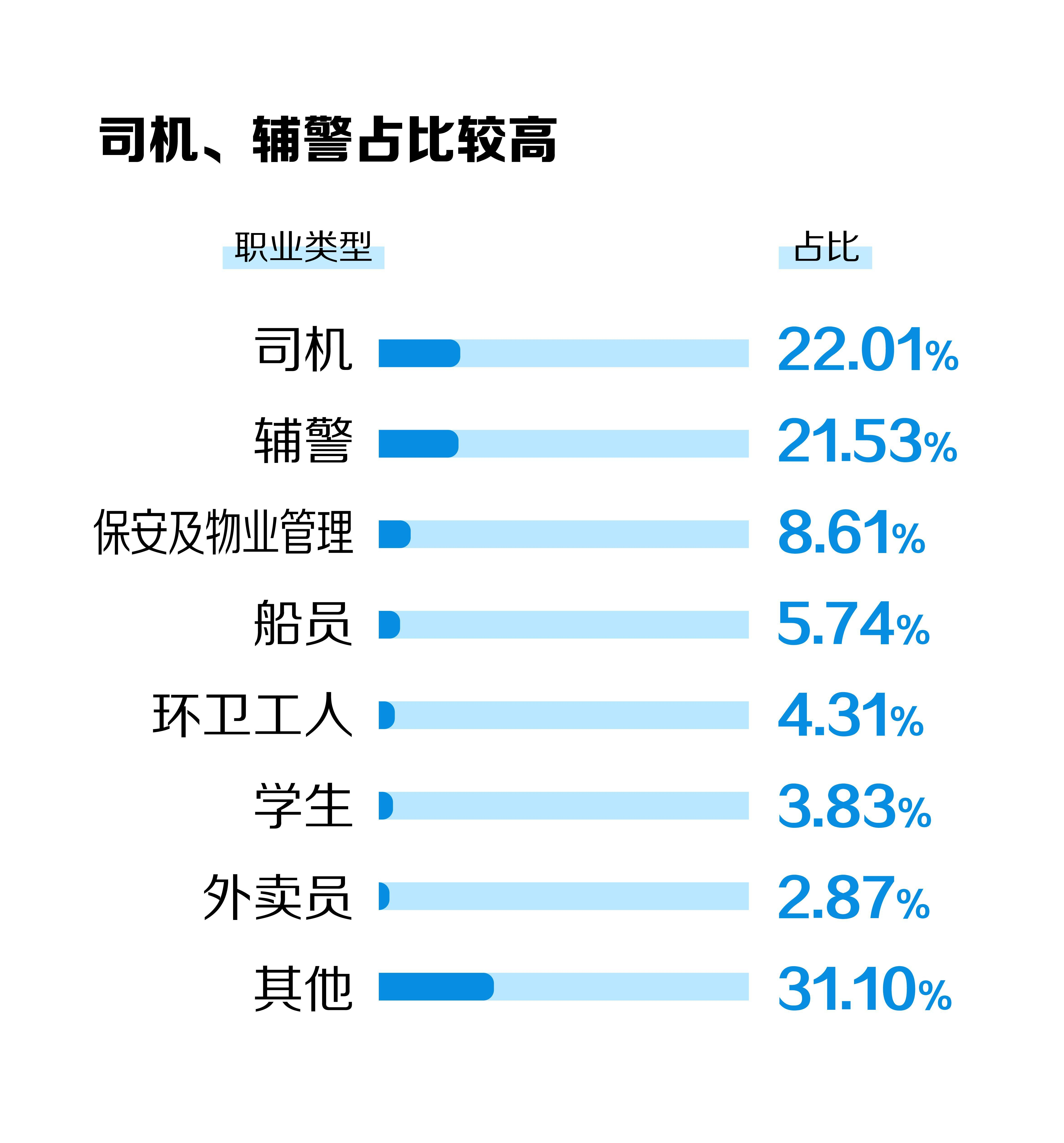 职业类型分布中,司机、辅警成为见义勇为群体的两大核心群体,占比均超两成。其中,司机占比22.01%,辅警占比21.53%。保安及物业管理占比8.61%,船员占比5.74%,环卫工人占比4.31%,学生占比3.83%,外卖员占比2.87%,其余31.10%为其他职业从业者,涵盖医生、教师、公务员、农民、私营业主、企业白领、退休人员等多种职业。基层工作者成为见义勇为的主要力量。其中,司机善举主要为紧急送医、紧急扑火等,体现出广州司机训练有素的应急救援常识。