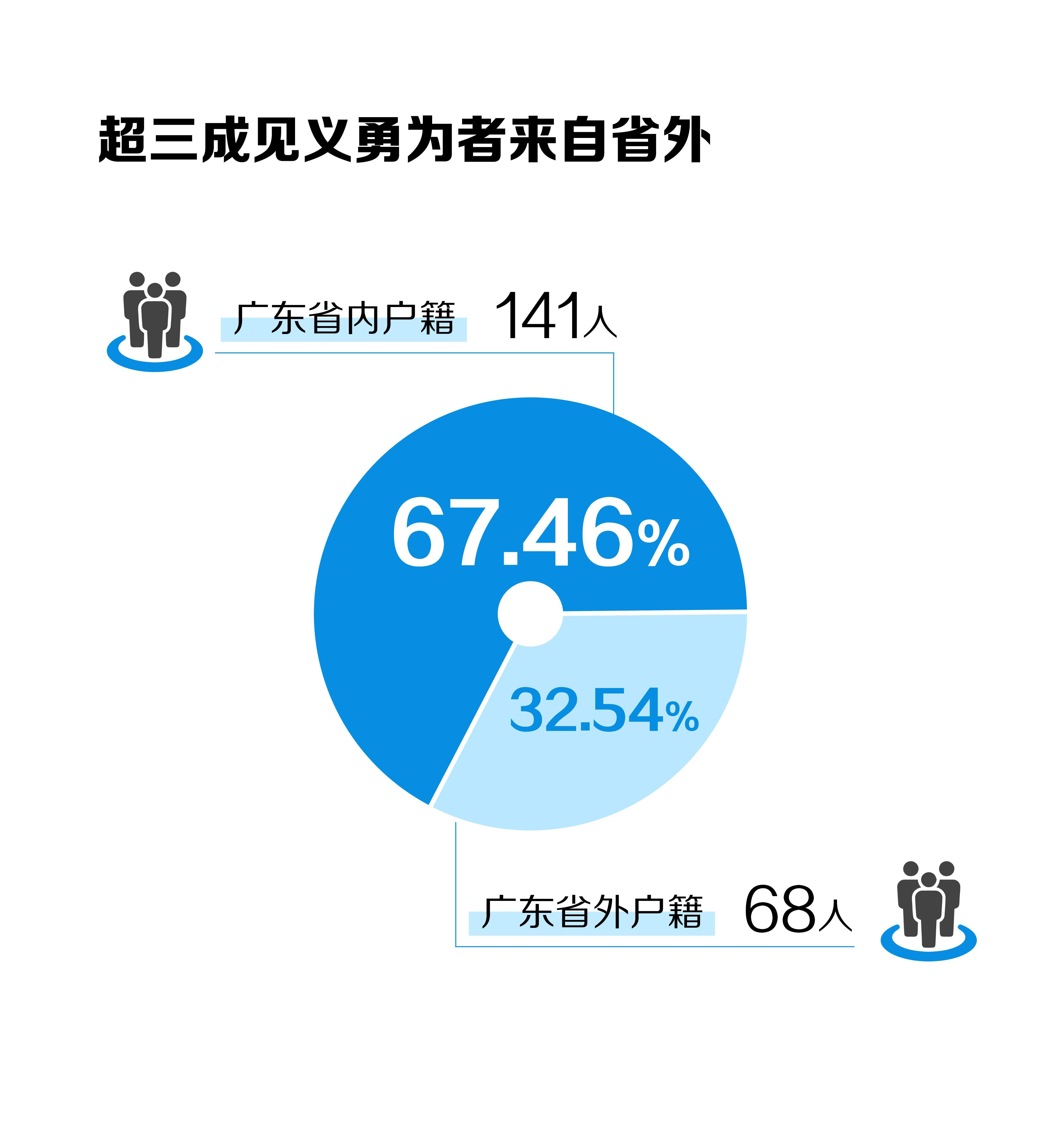 户籍分布方面,广东省内户籍人员141人,占比67.46%;广东省外户籍人员68人,占比32.54%。超三成见义勇为者来自省外,新广州人与老广州人正并肩同行,共同参与到广州的平安建设中,彰显了广州作为包容之城的凝聚力,也体现出见义勇为精神不分地域、人人可为的特质。