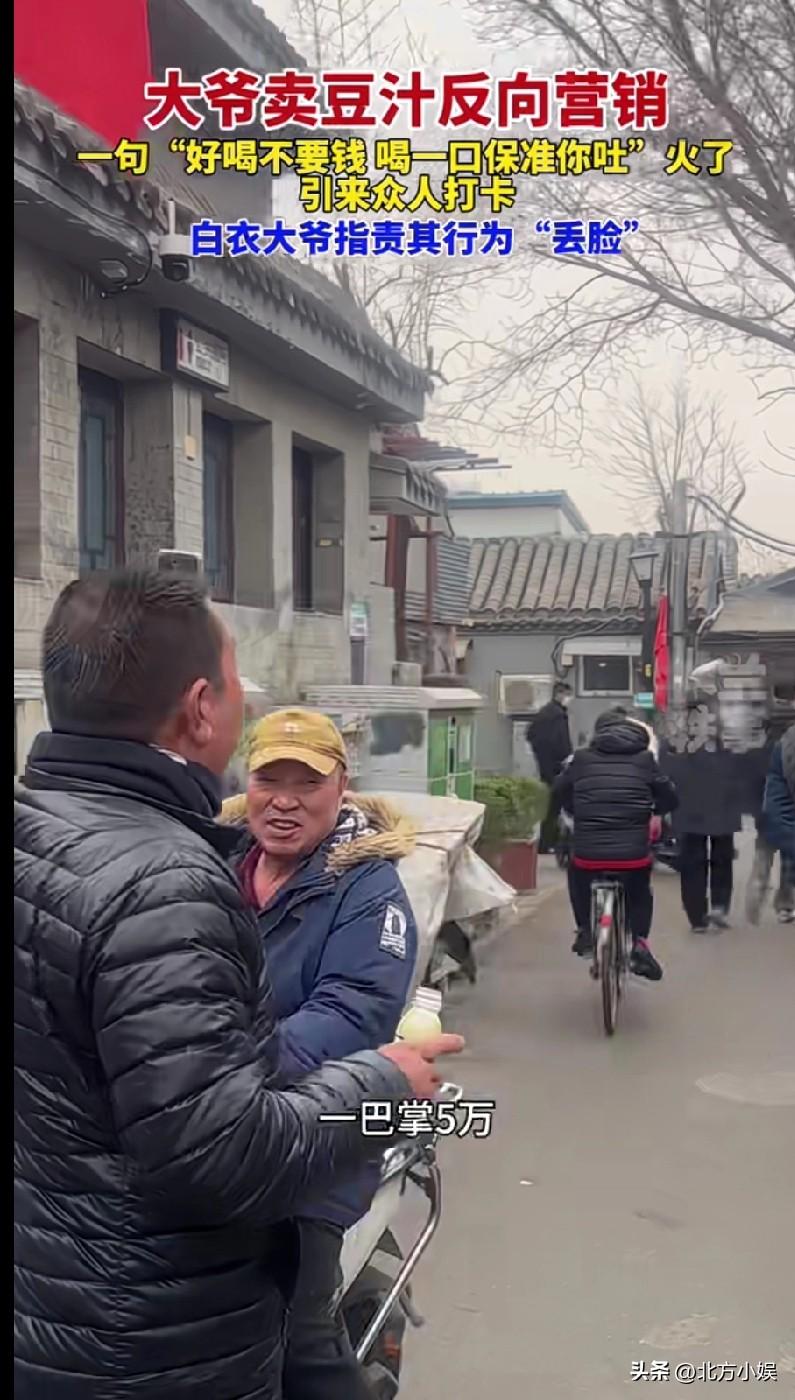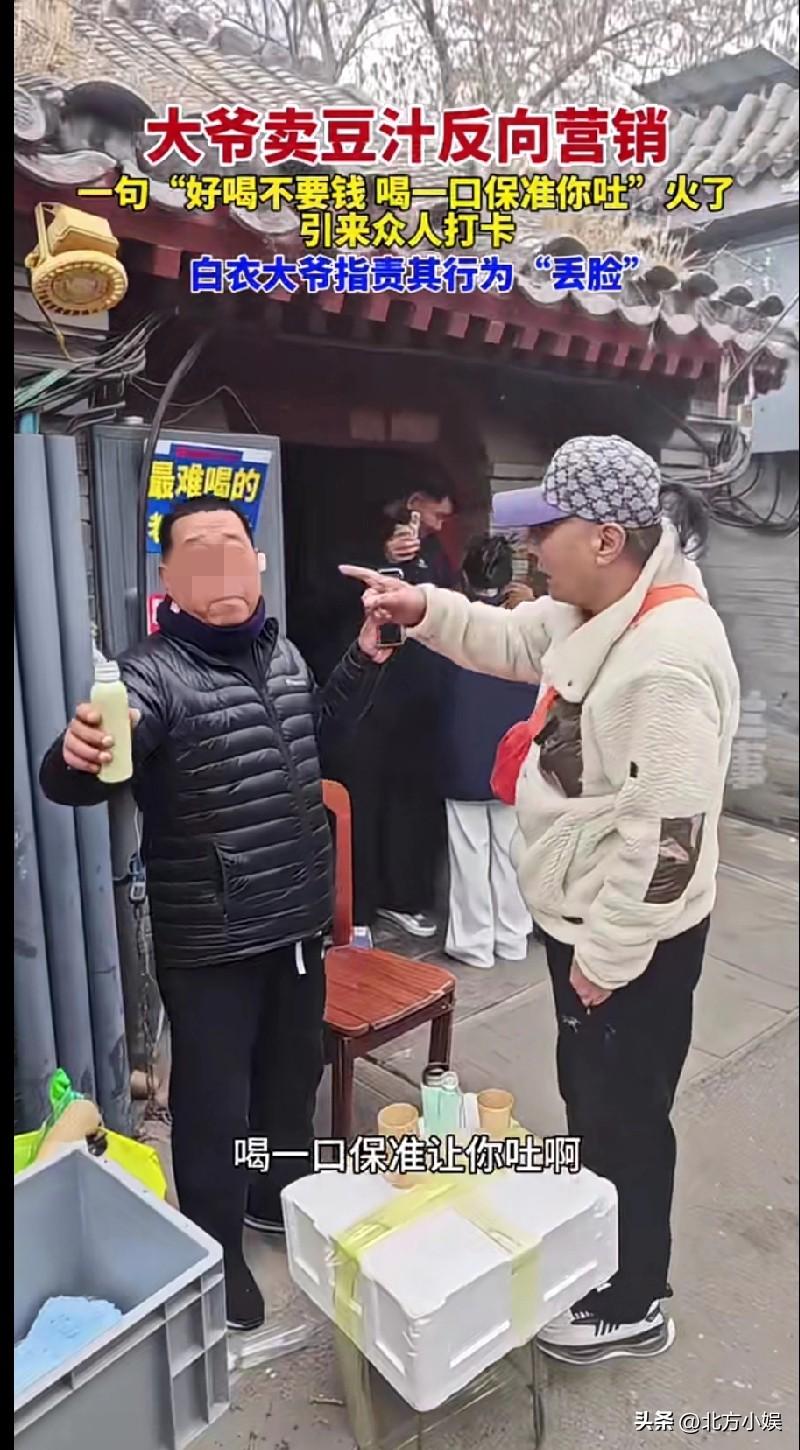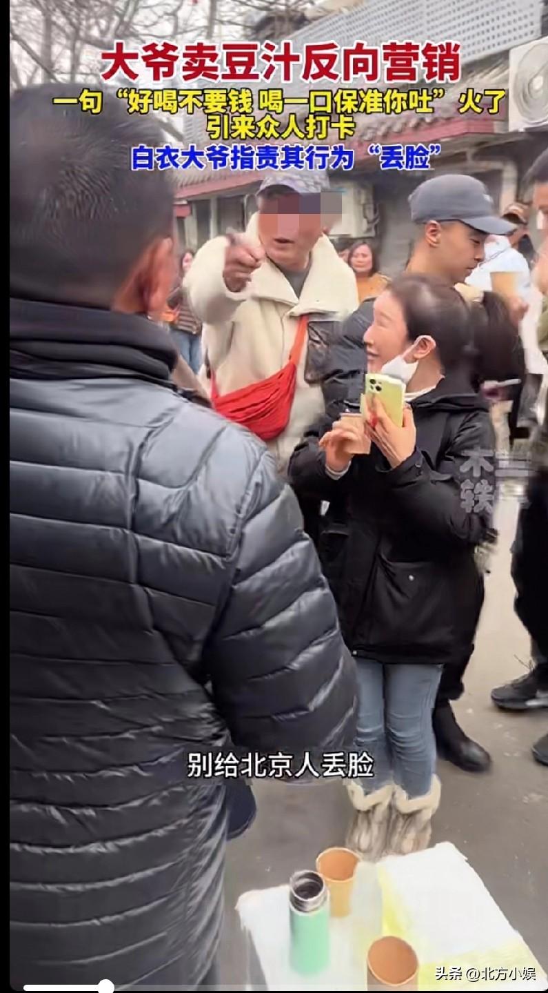 好喝不要钱,喝一口保准你吐! 北京的一位大爷因为在街头在卖豆汁,被一位白衣大爷大骂其“丢北京人的脸!”,并且白衣大爷要伸手打他。网友们纷纷支持卖豆汁的大爷,“卖豆汁怎么卖还有人干涉,真搞不懂!” 北京的一位大爷街头卖豆汁,因为反向营销,效果特别好,路人纷纷买大爷的豆汁。原来大爷一直在吆喝,但并不是夸自己的豆汁好喝,而是吆喝到“好喝不要钱,喝一口保准你吐!”。大家被这新奇的营销方式吸引,纷纷想尝一尝到底有多难喝,生意异常火爆。 这时人群中的一位白衣大爷窜出来,火了,伸手指责豆汁大爷道:“别给北京人丢脸,听到没有!”豆汁大爷听到后,神态自若,接着卖自己的豆汁,并和顾客们干杯。白衣大爷看到了更加气愤了,伸手就要打豆汁大爷,豆汁大爷并没有生气,淡然地说道:“你打我吧,一巴掌5万元,这里到处都是摄像头!”。 白衣大爷气的够呛,也没有办法,骂骂咧咧地离开了。 有的网友调侃道:“豆汁越难喝,越地道!” 也有的网友说:这是反向营销。 还有的网友说:白衣大爷生气是因为看到有人说自己的家乡美食难吃,心里难受,这是在贬低自己的家乡。 我觉得,白衣大爷也不用那么较真,豆汁本来外地人也喝不习惯,觉得难喝,这只是营销手段,并不能代表什么,不要生气。但是地方特色小吃,是一个地区的骄傲,这样宣传也确实存在不妥之处。 大家觉得呢?