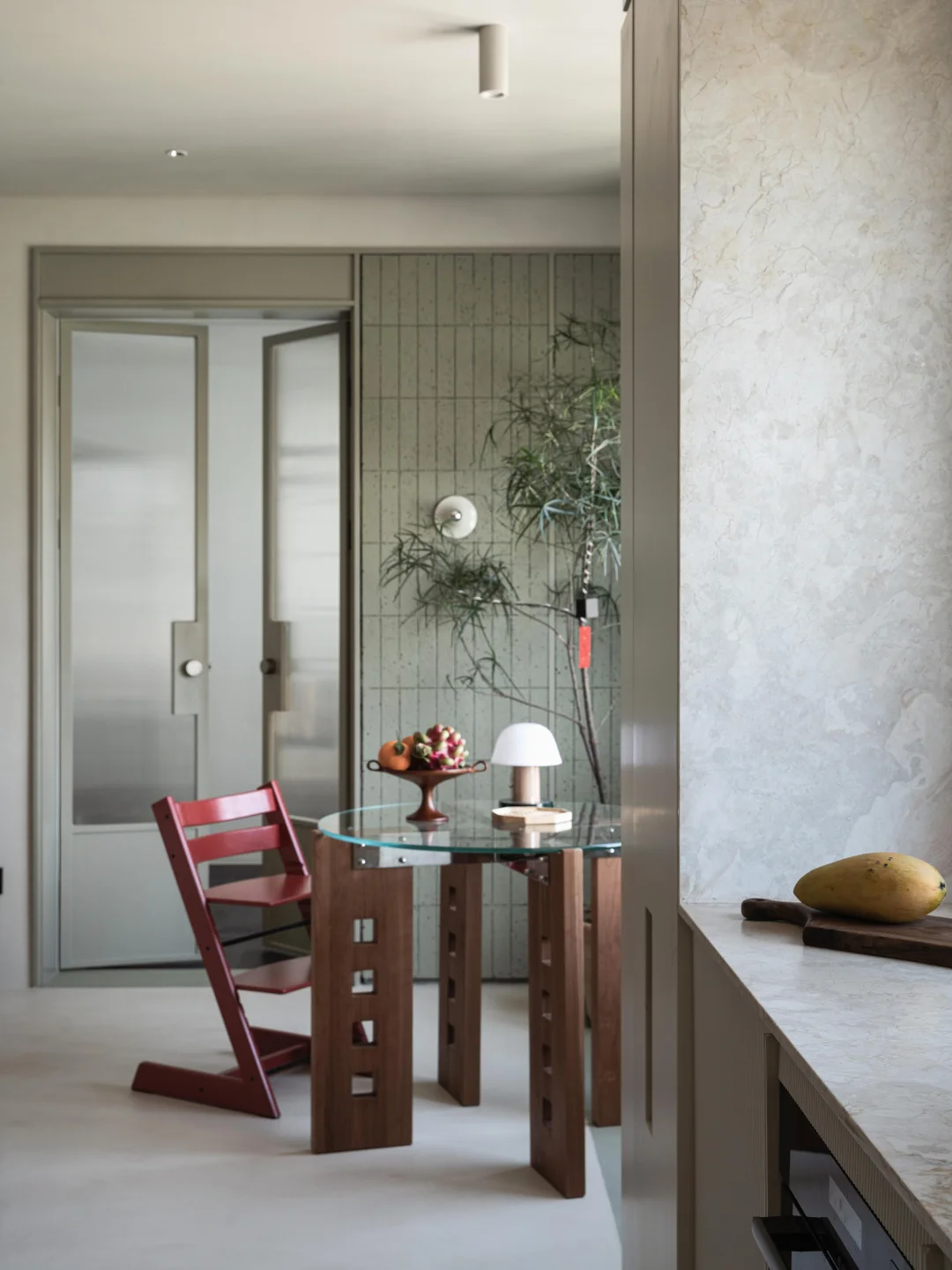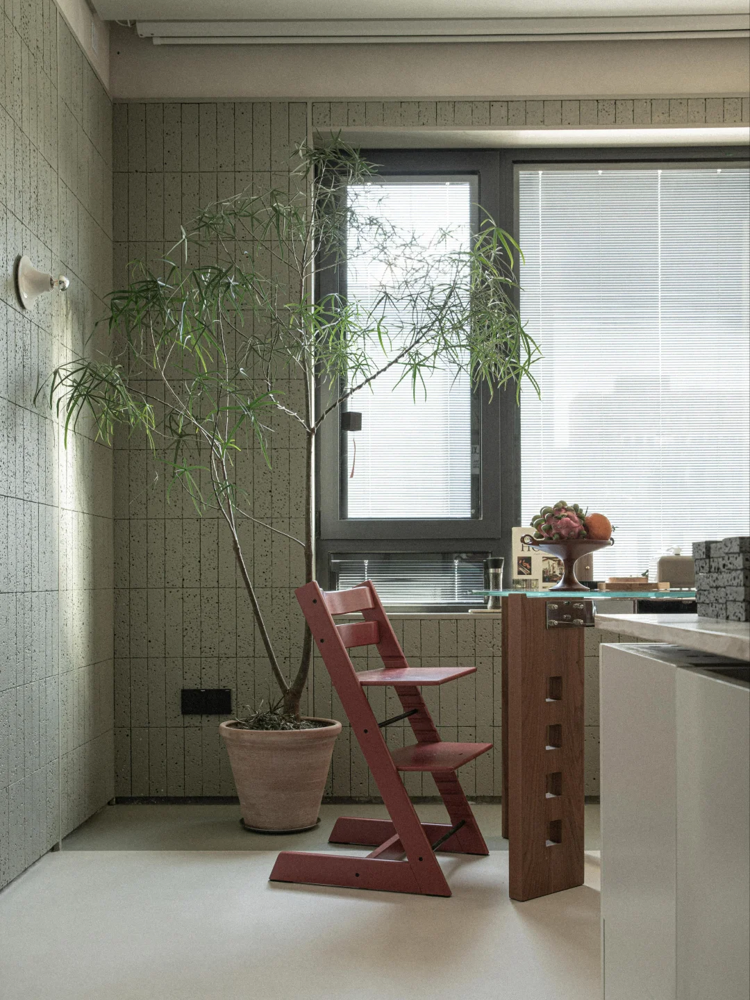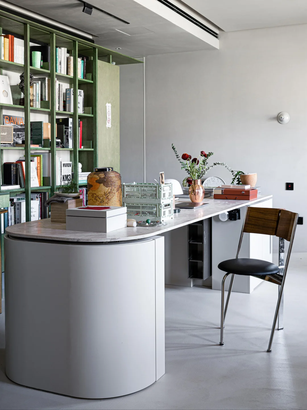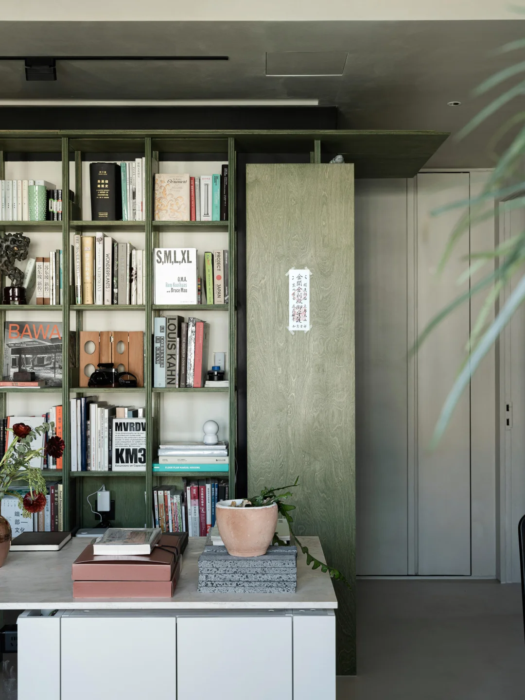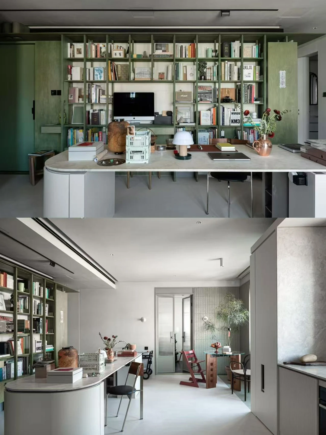 被大家追问的这个房屋,是我们工作室主理人权老师的家还登上了安邸的视频栏目 之前就有好多朋友问:怎么没看到客厅?书柜、地面都是什么材质?儿童房是什么样的? 今天来给大家一一解答 权老师家舍弃了客厅和电视,只摆放了成堆的书和工作桌, 平常不仅自己和太太能看书、充电, 孩子们也会围在这里做手工,可以说是天然的家庭核心区 书柜是海洋板材质,做了绿色的染色, 地面采用了微水泥,一眼看过去非常平整, 打扫也很方便 儿童房墙面嵌入了一组黑板,粉笔都藏在旁边的抽拉篮里, 2个孩子的床也是海洋板的形式,非常有趣