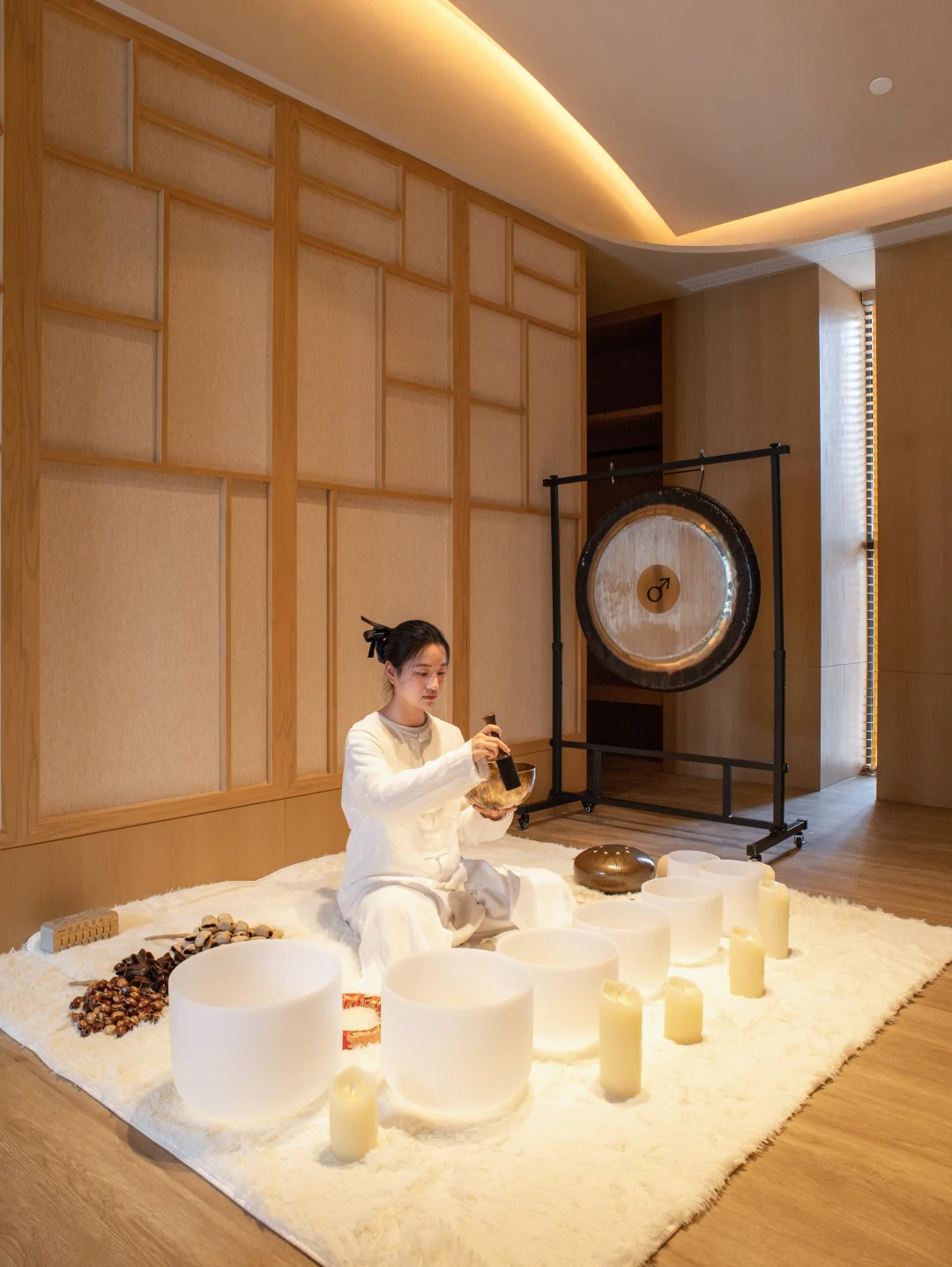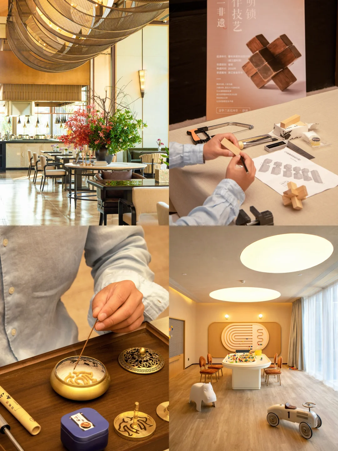 ❸花间小日子:跟着酒店堂主一起体验八段锦、香道、颂钵疗愈等,还有“一店一非遗”体验,可以亲自动手制作一个孔明锁。
