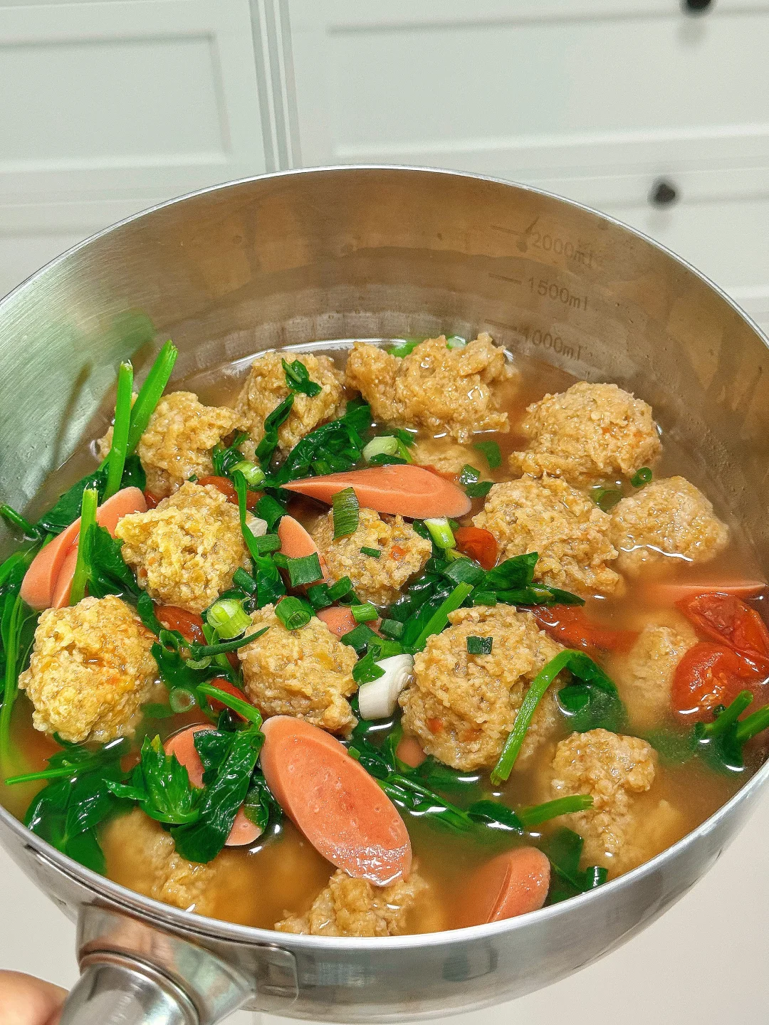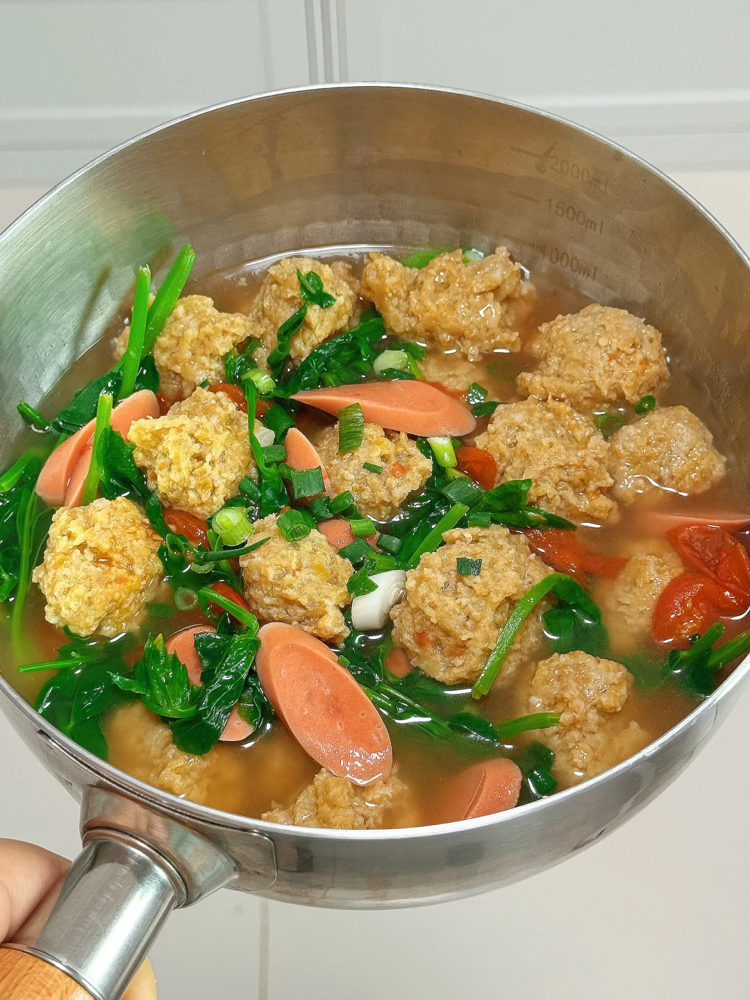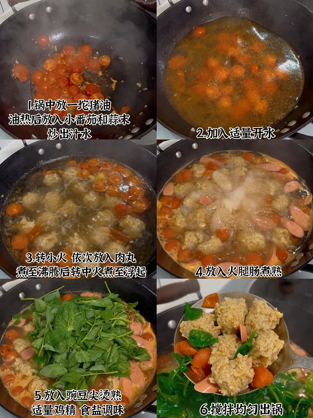 📜食材:肉末、豌豆尖、小番茄、火腿肠 🍳做法: 1.锅中放一坨猪油,油热后放入蒜末和小番茄,炒出汁水 2.给锅中加入适量开水 3.转小火,依次放入肉丸,煮至沸腾后转中火煮至浮起 4.放入火腿肠煮熟 5.放入豌豆尖烫熟,放适量鸡精,食盐调味即可。