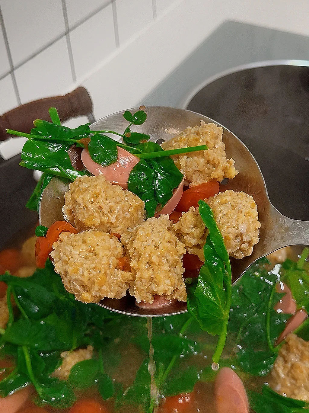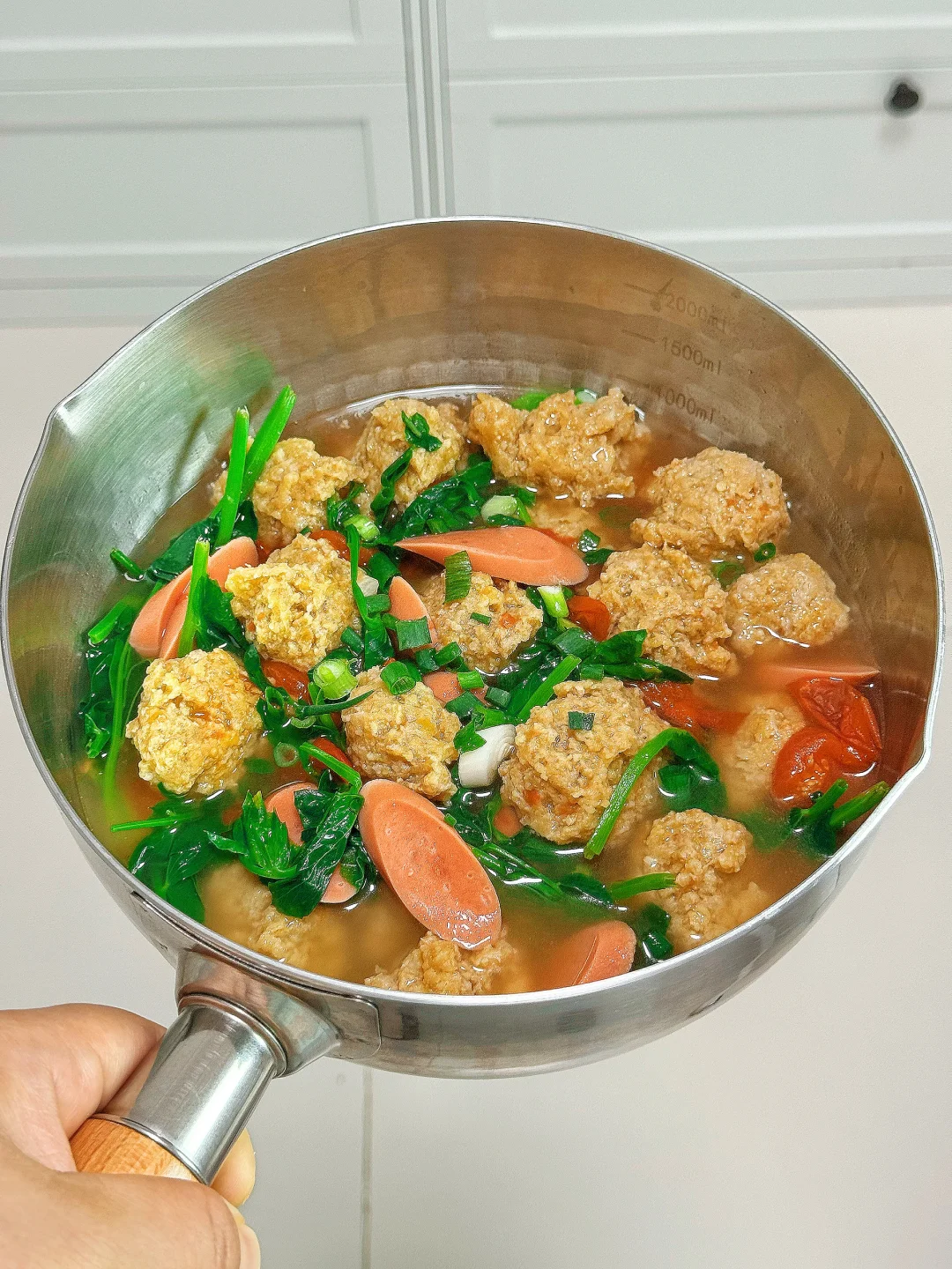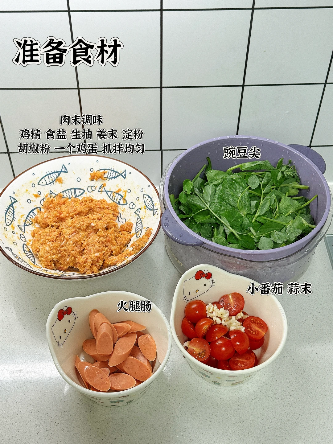 📜食材:肉末、豌豆尖、小番茄、火腿肠 🍳做法: 1.锅中放一坨猪油,油热后放入蒜末和小番茄,炒出汁水 2.给锅中加入适量开水 3.转小火,依次放入肉丸,煮至沸腾后转中火煮至浮起 4.放入火腿肠煮熟 5.放入豌豆尖烫熟,放适量鸡精,食盐调味即可。