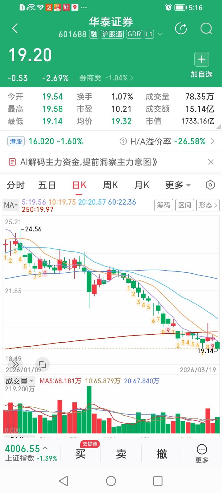 什么情况?头部券商股国泰海通今天这一跌不寻常,直接把自个干破净了!这也是今年首只破净的头部券商股。 国泰海通今天收盘下跌2.02%,收盘价17.50元,国泰海通目前的净资产值是17.82元,股价今天下跌0.36元直接跌破净了。 下一只面临破净压力的头部券商股是华泰证券,华泰证券今天收盘下跌2.69%,收盘价19.20元,目前华泰证券的净资产值是19.07元,今天的收盘价离净资产值仅有不到1%的距离了。 去年国泰海通也有过一波带长下影线的急跌大跌,也是跌破了净资产值,结果后来去年国泰海通股价最高点还创新高了。 不要怕,对于空仓或轻仓者,最大的利好就是股价大跌。