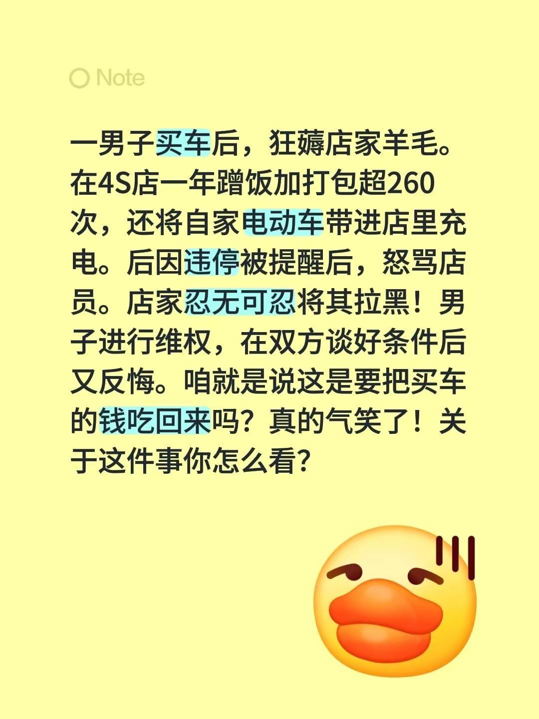 真是小刀拉PG,开了眼了!一男子买车后,狂薅店家羊毛。在4S店一年蹭饭加打包超260次,还将自家电动车带进店里充电。后因违停被提醒后,怒骂店员。店家忍无可忍将其拉黑!男子进行维权,在双方谈好条件后又反悔。咱就是说这是要把买车的钱吃回来吗?真的气笑了!关于这件事你怎么看?4S店称吃饭超260次客户已报警 薅羊毛