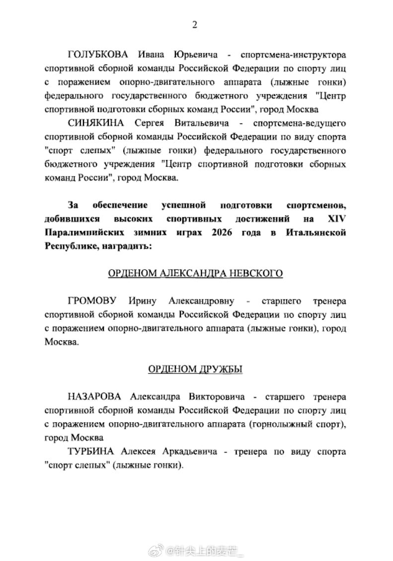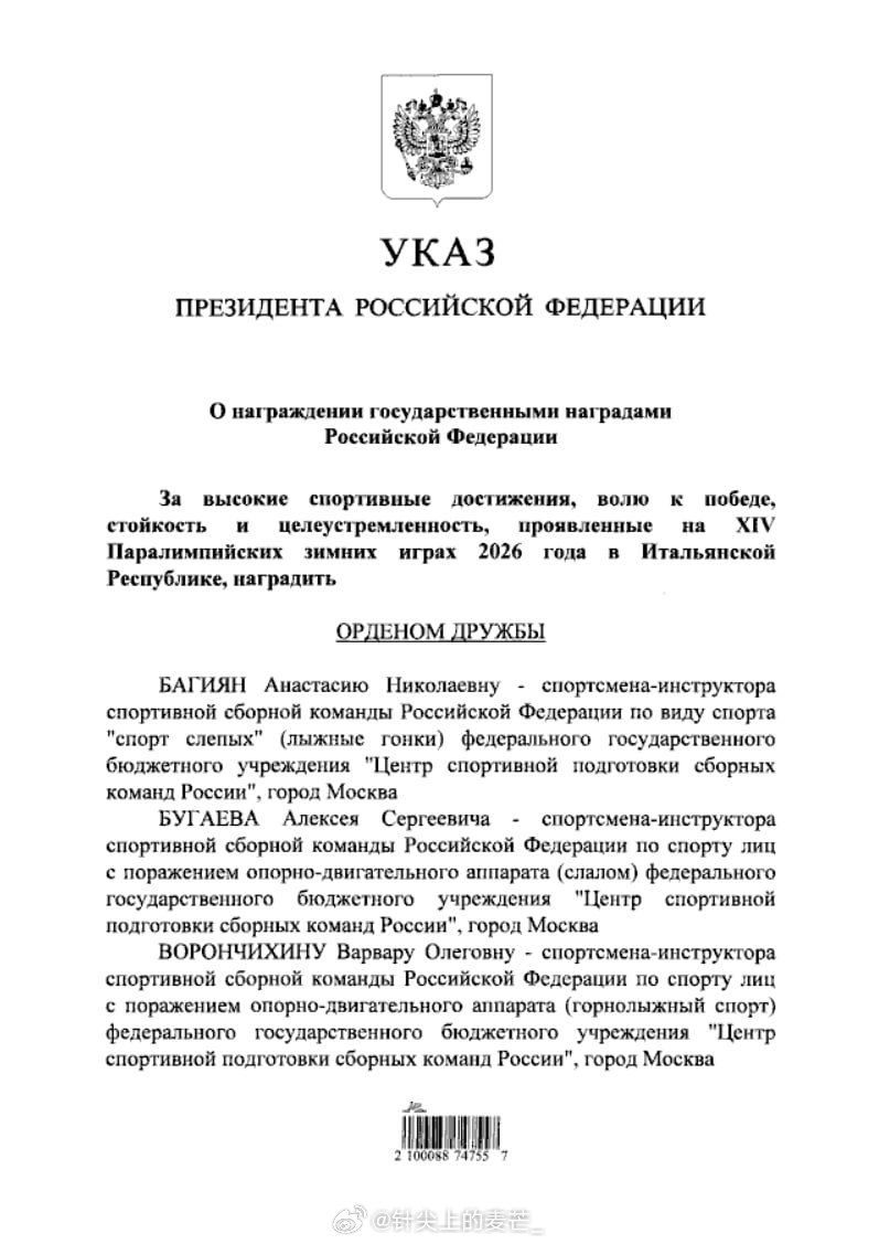 瓦洛佳小朋友 弗拉基米尔·普京授予残奥会运动员及教练员国家奖章,表彰他们在意大利残奥会上展现的坚毅精神和必胜意志。
