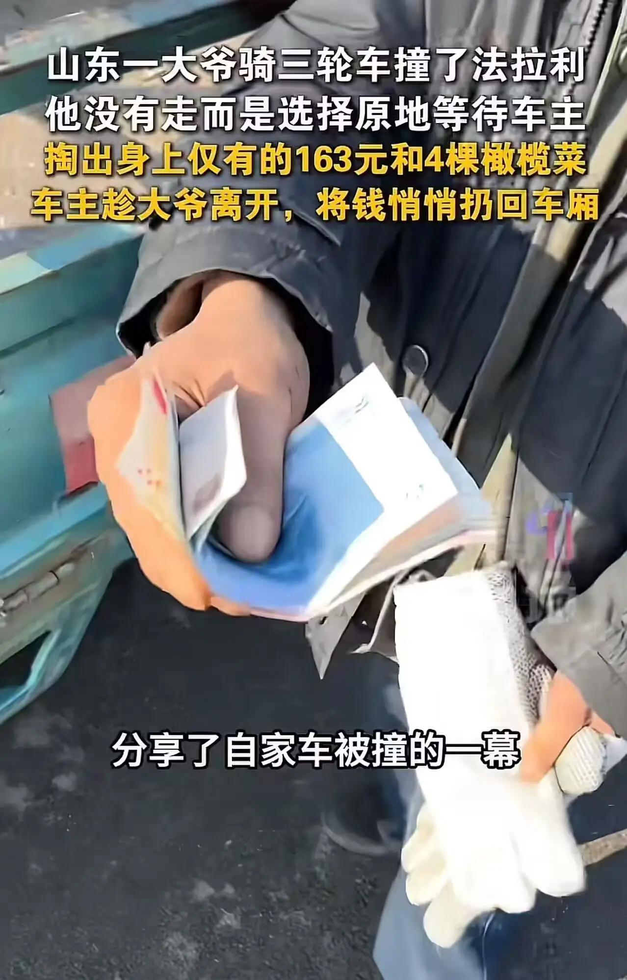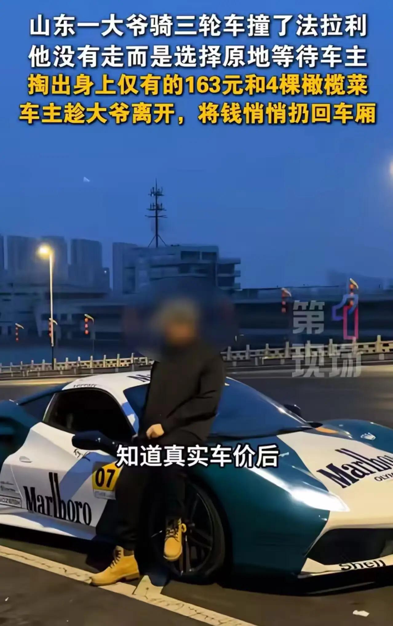 山东法拉利车主火了!大爷撞车赔163元+4棵橄榄菜,后续举动看哭全网 山东街头这一幕,戳中了无数人内心最柔软的地方。 一辆法拉利静静停在路边,却被骑三轮车的大爷不慎剐蹭,换做旁人,或许慌不择路逃离现场,可这位大爷没有丝毫躲闪,守在车旁,执拗地等着车主出现,这份朴实的担当,先让人心头一震。 等到法拉利车主赶来,大爷满脸愧疚,哆哆嗦嗦从贴身口袋里掏出一沓皱巴巴的零钱,一块、五块、十块,凑在一起整整163元,那是他身上全部的家当。怕这点钱不够赔,大爷又转身从三轮车上抱出4棵带着泥土的橄榄菜,小心翼翼递过去,眼神里满是无措与诚恳:“小伙子,对不住,我就只有这些了,你别嫌弃。” 当车主说出法拉利的价格,大爷瞬间僵在原地,满脸惊恐,双手都开始发抖,他或许一辈子都没见过这么贵的车,更不敢想自己要赔多少钱,窘迫的模样,让围观的人都跟着揪心。 本以为会是一场争执,可接下来的画面,却让全网破防。车主看着大爷佝偻的身影、满是皱纹的脸,没有丝毫责备,反而轻声安慰:“大爷没事,就是小刮蹭,不用您赔。”他假意收下钱和橄榄菜,趁大爷转身推车时,悄悄把163元塞回了大爷的车斗里,全程温柔又体面。 有人说,豪车很贵,但善良无价。大爷守的是本分,车主护的是人心,这世间最动人的,从来不是金钱与地位,而是底层小人物的坦荡,和有钱人的共情。没有咄咄逼人,没有怨天尤人,双向的善意,才是这个时代最珍贵的光。 这一幕,也让我们看清:真正的体面,从不是开豪车、穿华服,而是骨子里的善良与担当。 善意温暖人心 大爷勇于担当