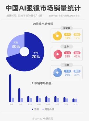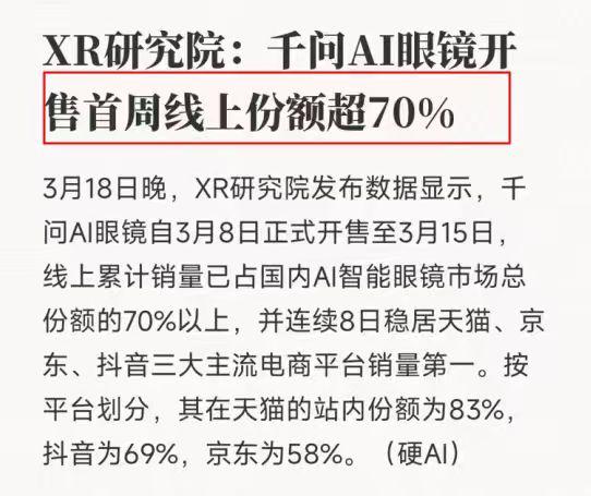 千问AI眼镜半个月传出两则重磅消息,一次比一比劲爆! 3月2日,世界移动通信大会上,千问AI眼镜和Meta展开了正面对垒,将展台摆在了Meta正对面。 3月18日,XR研究院发布数据,千问AI眼镜开售首周销量占国内AI智能眼镜市场总份额超70%。在三大主流电商平台销量连续8天第一。 半个月时间,千问AI眼镜真是惊喜不断,传出的消息是一个比一个劲爆啊。 刚上线就和号称美国第一AI眼镜的Meta AI眼镜叫上了板,结果外媒喊话Meta让它要小心了。 而现在正式开售后,表现更是出色,不但占了70%的总份额,而且在天猫等三大主流电商平台,份额占比都是第一。其中在天猫份额高达83%,抖音69%,京东也高达58%,全部都超过了半数以上,位列第一。 之前外媒的点赞,有些人可能还觉得言过其实,如今数据出来后,怕是没人再好质疑了,毕竟数据是不会骗人的。 据了解,今年年内千问AI眼镜还将会登陆全球市场,按照这个节奏,怕是又会给我们带来更大的惊喜,给全球AI智能眼镜市场带去新的刺激!