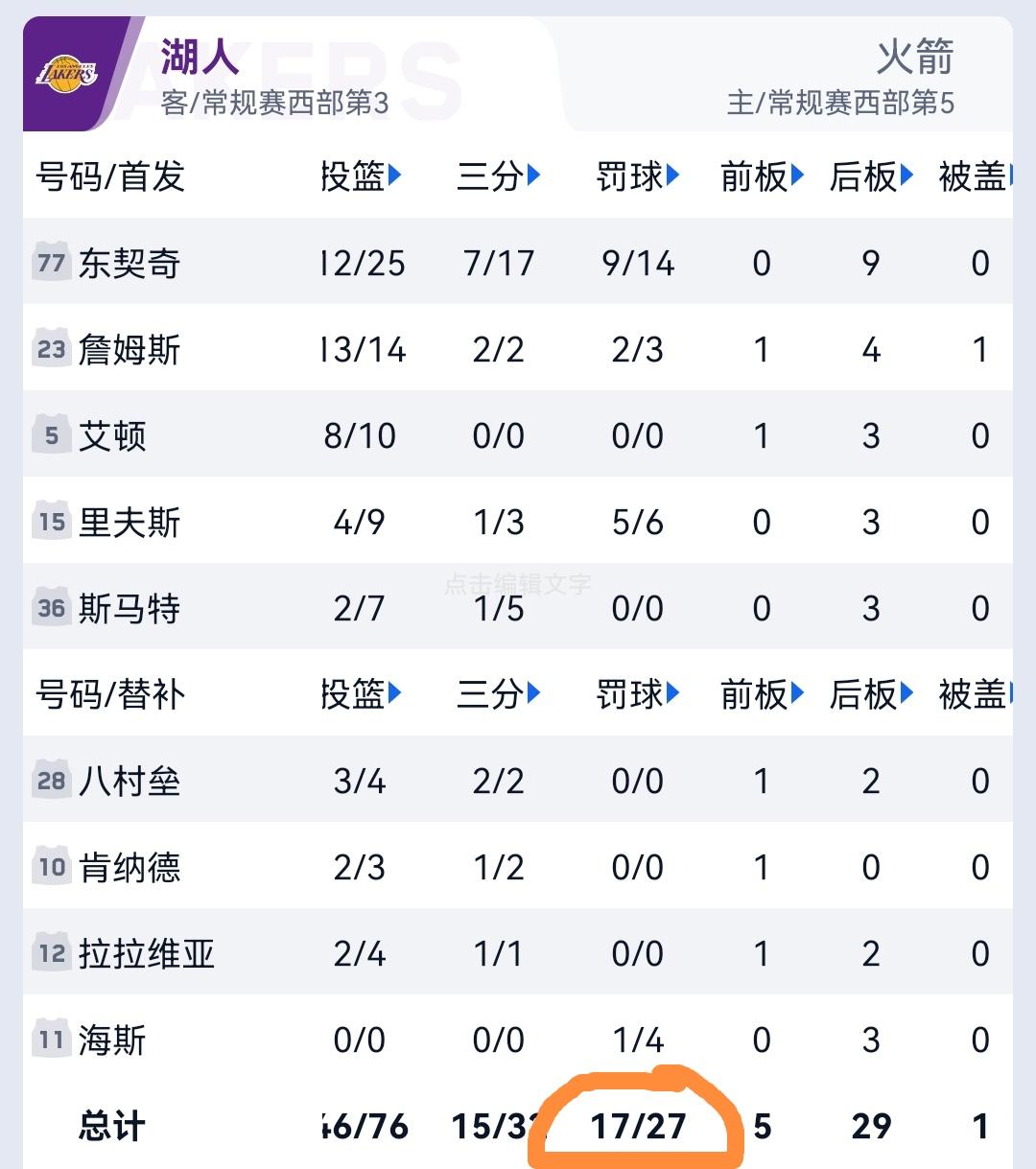 输的有点冤,火箭两场比赛比联盟之子湖人少了17次罚球! 今天上午9点开始的一场西部焦点战,火箭主场再次与湖人相遇。同前两天的那场一样,两队打的非常胶着,直到最后时刻才分出胜负。 看过这两场比赛的都注意到了,剧情几乎一模一样。湖人赢球,火箭输球,东契奇高光,杜兰特低迷。 当然,还有一处惊人相似的地方。两场比赛,湖人的罚球次数都多于主队火箭。上一场结束后,火箭记者抱怨湖人罚球多,本想借机给裁判提个醒,让本场比赛更加的公平。 没想到,裁判变本加厉,本场硬生生的给了湖人27次罚球机会,而火箭只有17次,两场比赛足足多了17次。其实火箭这两场加起来仅仅只是输了16分!假如两队罚球一样多,至少火箭不至于两连败。 一直听说湖人是NBA获益最多的球队,网友们还送给他联盟之子的称号,今天是见识到了,肆无忌惮,完全不背人! 休斯顿火箭