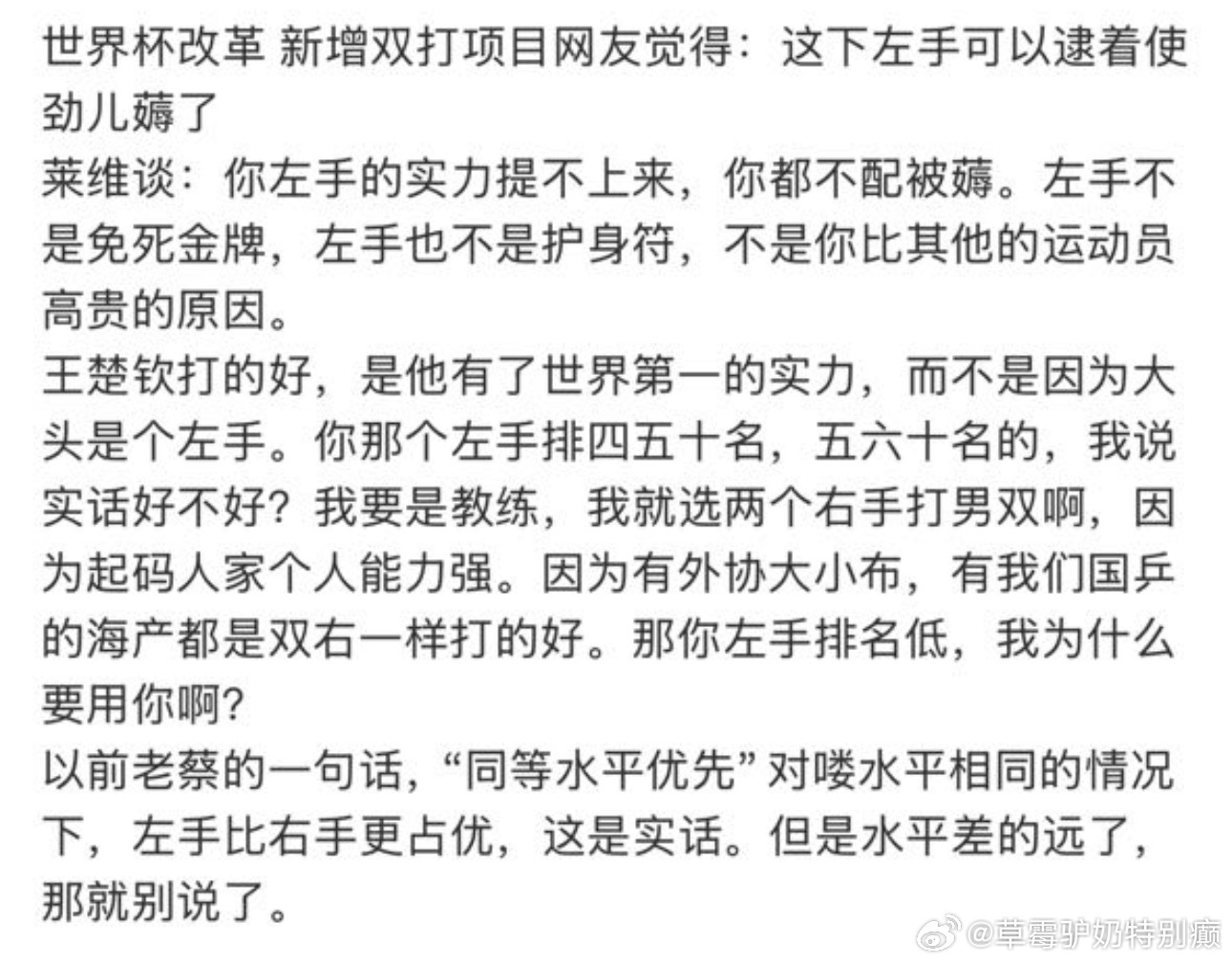对对对对对那你说()世界排名一百多的时候 咋就能和马龙配男双上世乒赛呢?你说()还是小透明的时候 为什么就能和孙颖莎配混双呢?你说为什么巴黎周期只要是国际大赛/亚运会这样的比赛()非得跟樊振东配在一起呢?