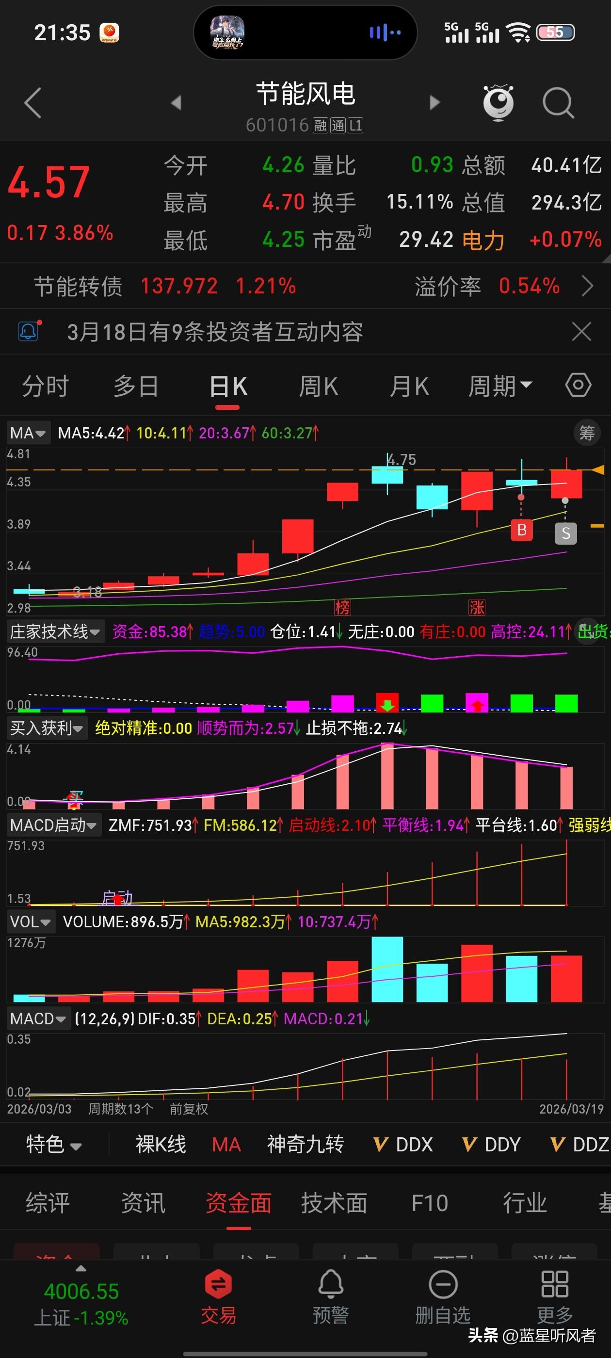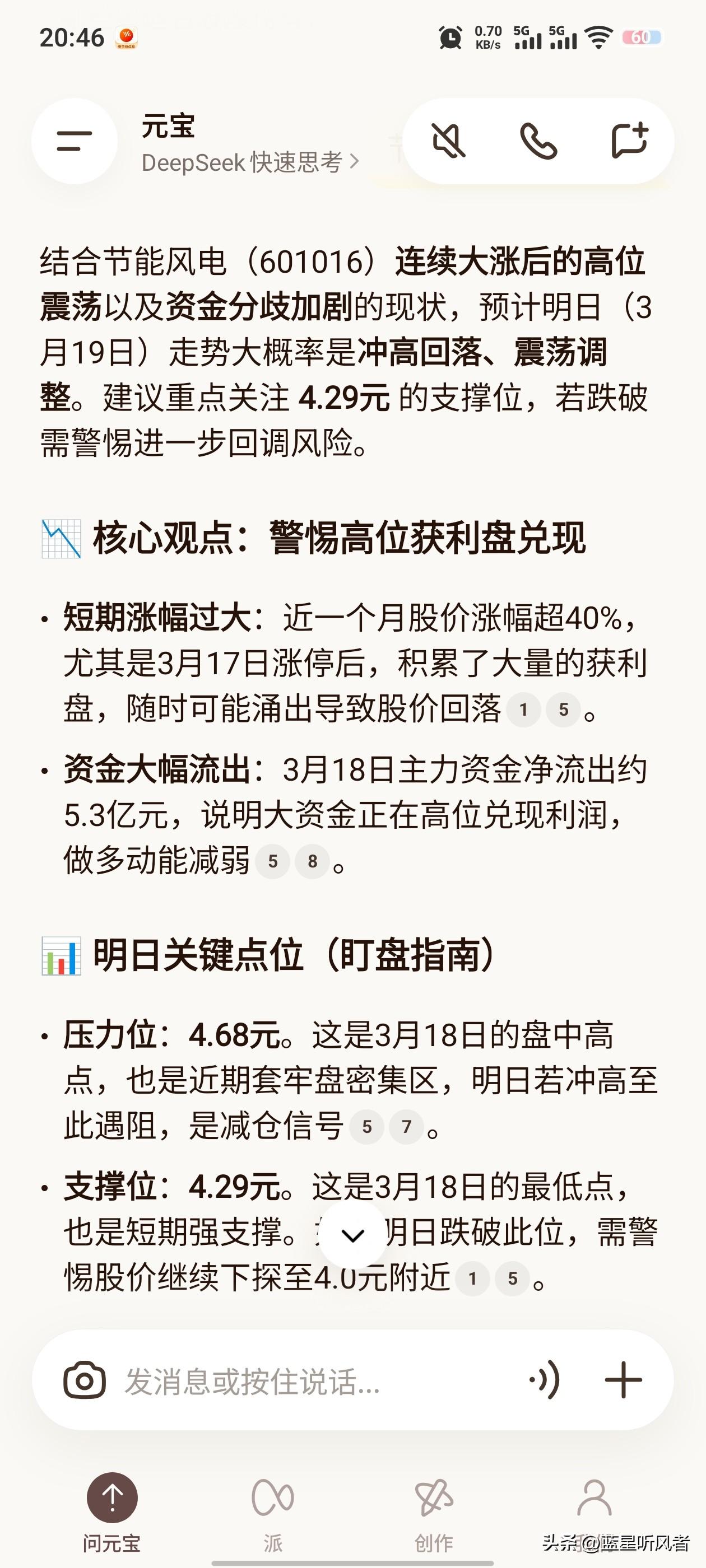 昨天惊心动魄的下跌。4.59买入节能风电,然后一路跌。收盘4.40。 感觉自己又踩坑了,昨晚和元宝聊天,问了一下节能风电今天的走势:压力位:4.68元。这是3月18日的盘中高点,也是近期套牢盘密集区,明日若冲高至此遇阻,是减仓信号。 然后今天最高冲到4.70。然后就遇阻力了,最终我4.62卖出了。早盘时候反复涨落😤,忍着过了10点30,后面果然和元宝预测的一样。没有亏本,我直接卖出,不敢赌明天的走势。直接落袋为安才是王道。今日A股 散户炒股日记 散户亏钱的原因能不能用一句话说清楚 元宝