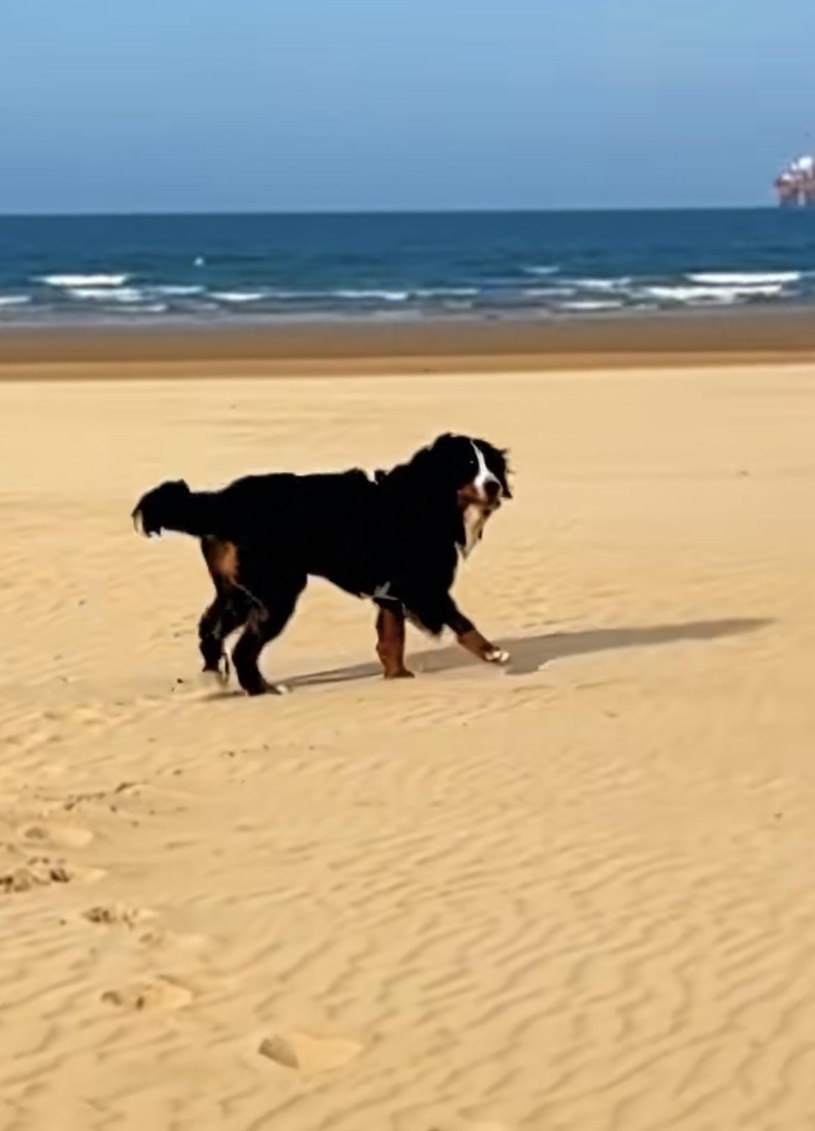 烟台莱山海边的沙滩上,身价5万的伯恩山犬啾啾又来撒欢儿了,这次没有跟俩流浪狗17