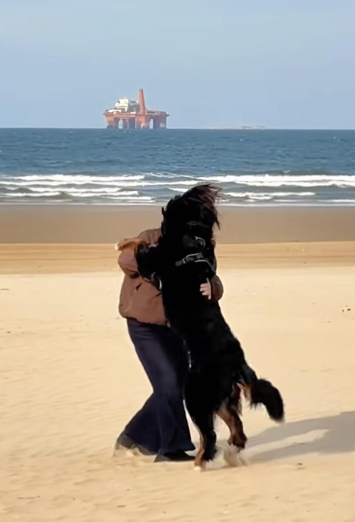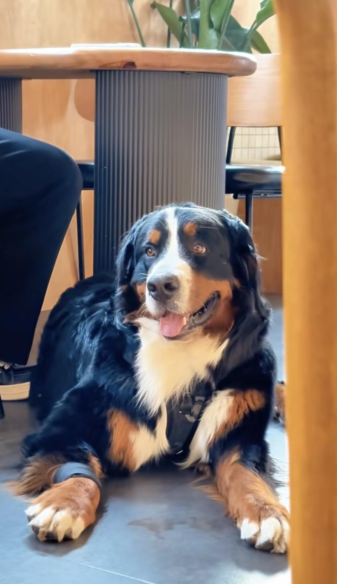 烟台莱山海边的沙滩上,身价5万的伯恩山犬啾啾又来撒欢儿了,这次没有跟俩流浪狗17一起出来,大啾啾跟主人撒娇卖萌,简直太可爱了。 画面很美,蔚蓝的大海风平浪静,金色的沙滩在阳光下格外温暖,大啾啾扑到主人身上,用两只前爪抱住主人,就像一个小孩子一样求抱抱。 主人转过身,抱住大啾啾,爱抚地用手拍着它的后背,这家伙站起来,个头儿都快要超过主人了,可还是这么淘气。 在沙滩上跑累了,大啾啾跟主人一起回到17咖啡,这是主人一家的店,里面有许多啾啾和流浪狗17的文创产品,啾啾经常到店里,看看这慵懒的姿势,一看就是老员工了。 啾啾真是一条运气超好的毛孩子,遇到这么爱它的主人,还有两个仗义大哥,每天都无忧无虑开开心心的,真是太让人羡慕了!