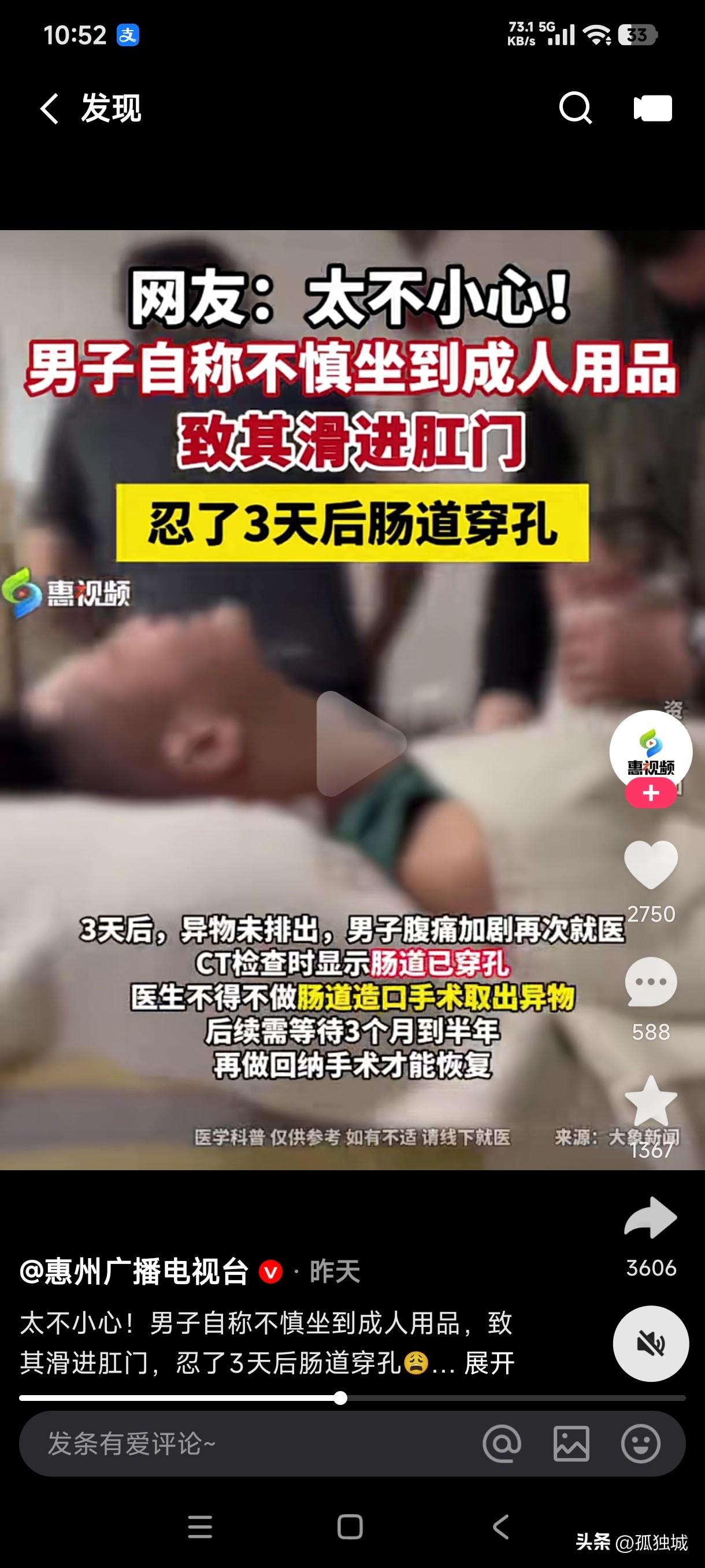 男子不小心坐到成人用品导致其滑入肛门,忍了3天没有排出反而腹痛加剧难忍,于是急忙就医,检查后发现已经导致肠道穿孔,医生不得不做肠道造口手术取出异物。 面对医生和护士的异样眼神,男子极力辩解就是不小心坐到上面的,但对于医生和护士来说已经见怪不怪了,明眼人不用想都知道是咋回事,这男子不是没事给自己找罪受吗?尽管手术取出异物了,但后续需要等三个月到半年再做回纳手术才能完全恢复。 这男子真是脑洞大开,居然搞了这么一出,这传出去不得让人笑掉大牙了,今后还怎么见亲戚朋友,这一幕不仅医生护士不相信,就连网友们也不信,这快乐并痛的滋味到底好受吗?