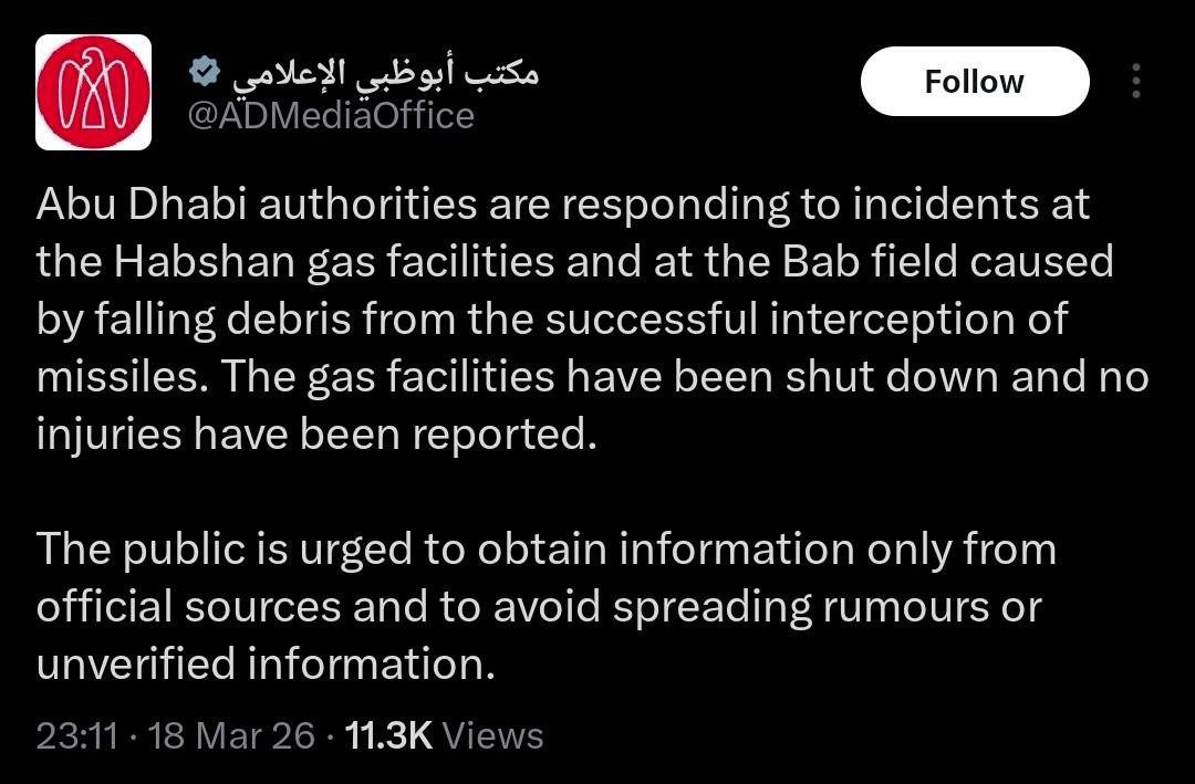 阿联酋,据阿布扎比当局称,阿布扎比的哈布山天然气设施和巴布气田的天然气设施遭到导弹袭击。这些天然气设施已被关闭。当局称爆炸是由于“导弹被拦截后的残骸落地”。